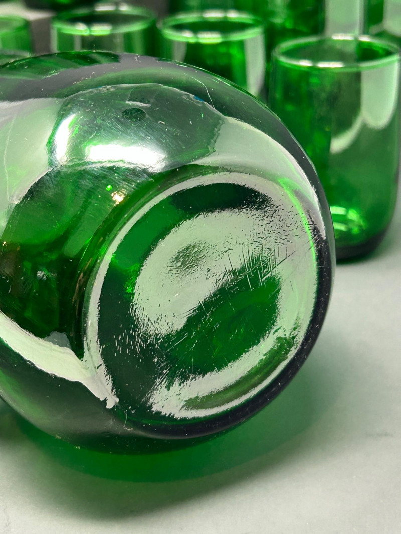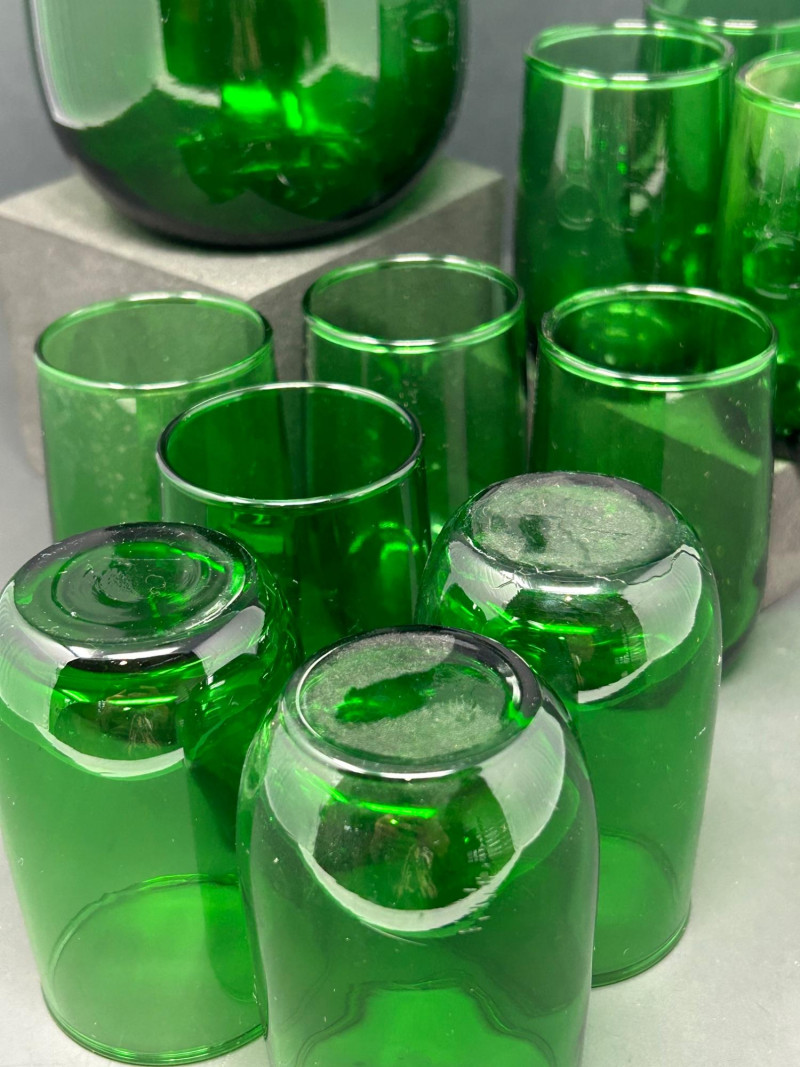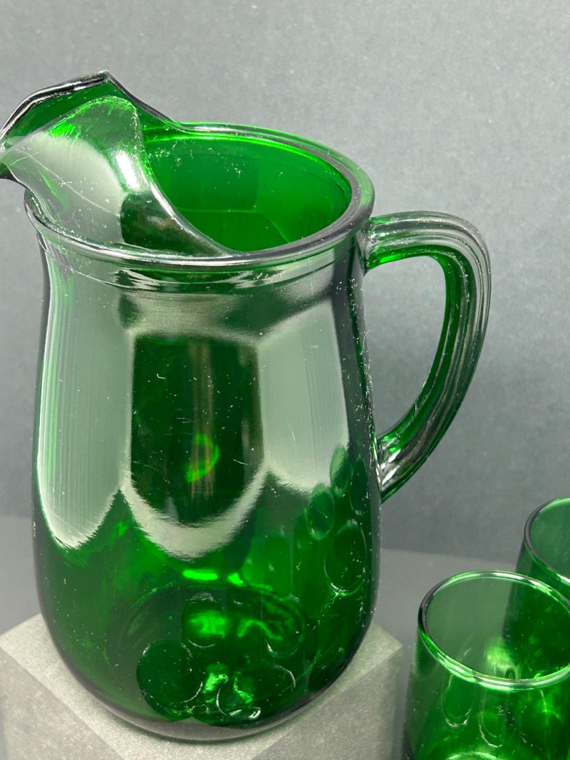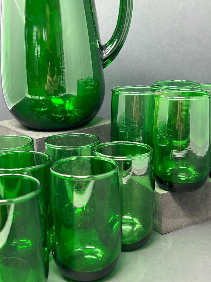 Classic mid-century green glass beverage set, likely produced by Anchor Hocking, featuring a forest green ice-lip pitcher paired with eleven matching juice tumblers. The color, form, and proportions closely match documented Anchor Hocking Forest Green glassware from the 1950s–1960s. The pitcher features a distinctive ice-lip spout designed to retain ice while pouring, along with a sturdy applied handle and thick base. The cylindrical tumblers have clean lines and weighted bases, consistent with known Anchor Hocking juice glasses in this color. Maker: Likely Anchor Hocking Color: Forest Green Era: Mid-Century (circa 1950s–1960s) Material: Pressed glass Includes: (1) Ice-lip handled pitcher (11) Matching juice tumblers Pitcher: approx. 8" tall × 6" across (including handle) Tumblers: approx. 3.5" tallDetails: