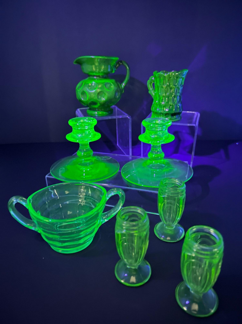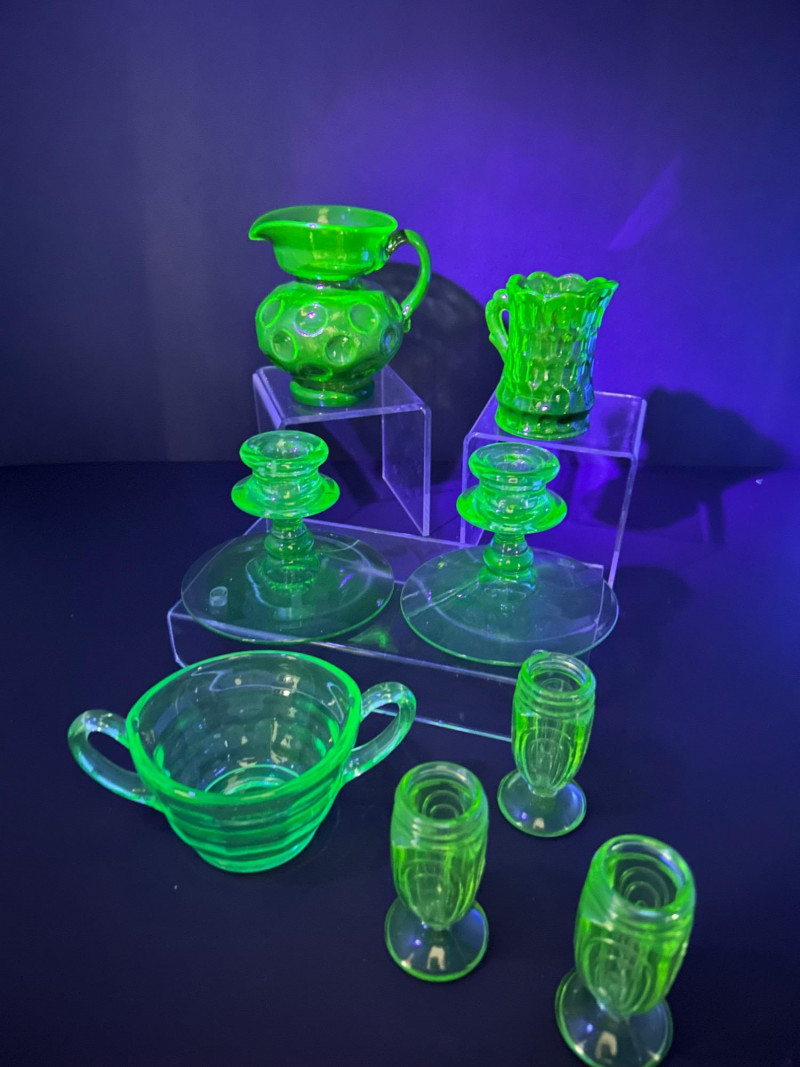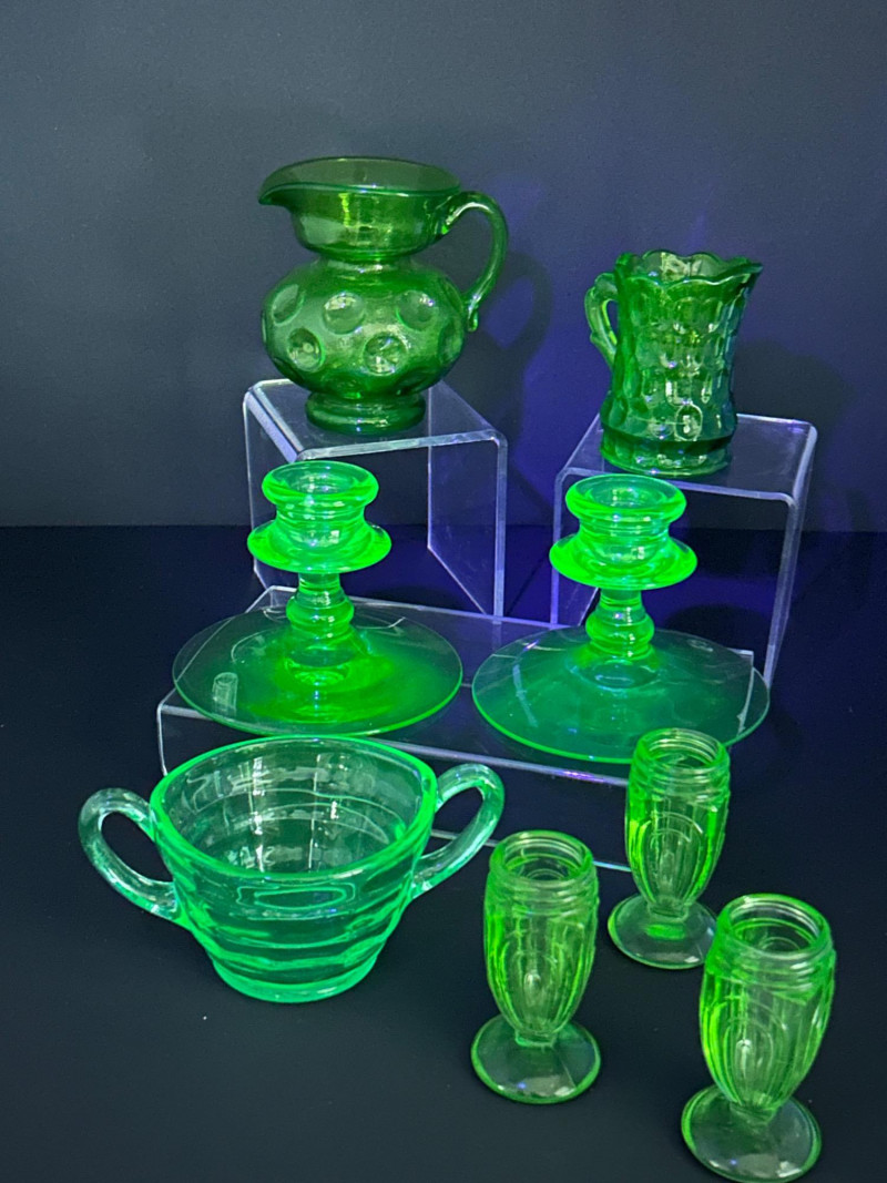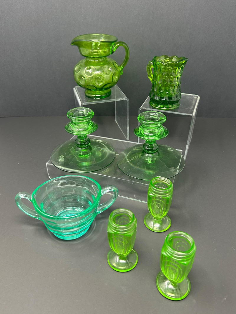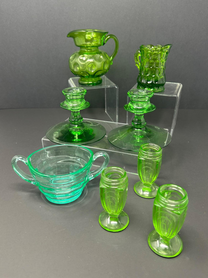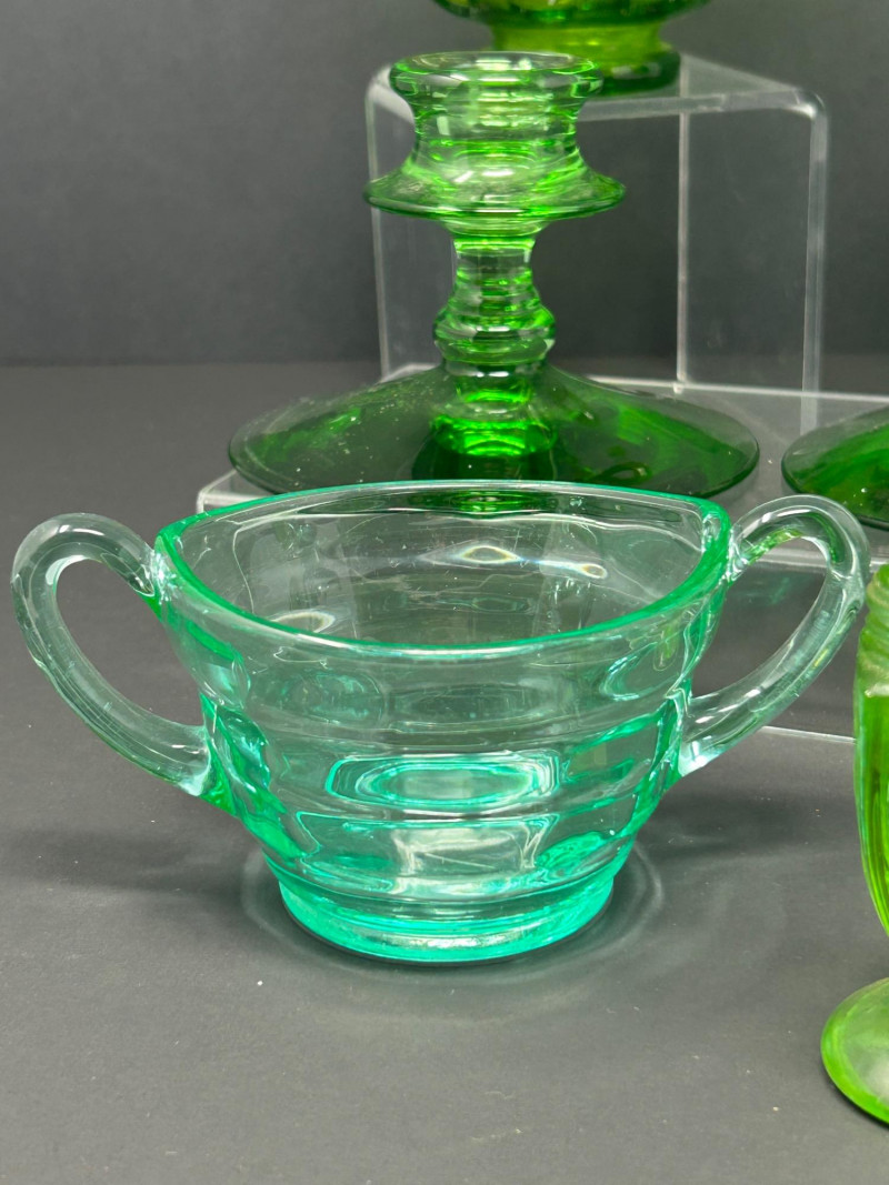 A curated grouping of American uranium green Depression-era glass, featuring two small pitchers, a pair of candlesticks, a handled sugar dish, and matching salt & pepper shakers. Together, these pieces showcase classic pressed-glass forms and patterns popular from the 1930s–1940s, highlighted by vivid translucent green color and strong UV-reactive glow. The assortment blends functional tableware with decorative accents, making it an appealing display lot for collectors of uranium or Depression glass. Model / Pattern: inverted bubble (attribution by form) Model / Pattern: Paneled / honeycomb-style pressed glass Model / Pattern: Optic-style with stepped stem and wide disc base Model / Pattern: Optic ribbed form with side handles Model / Pattern: Paperclip-style pedestal shakersItem Details: