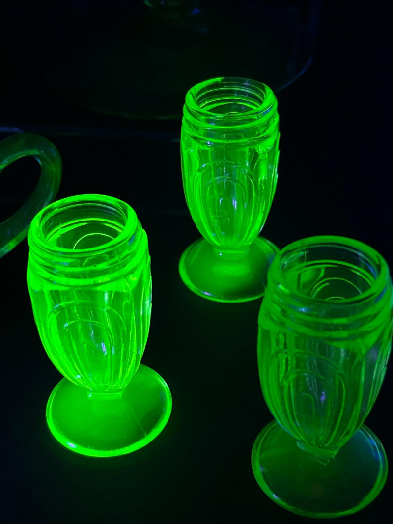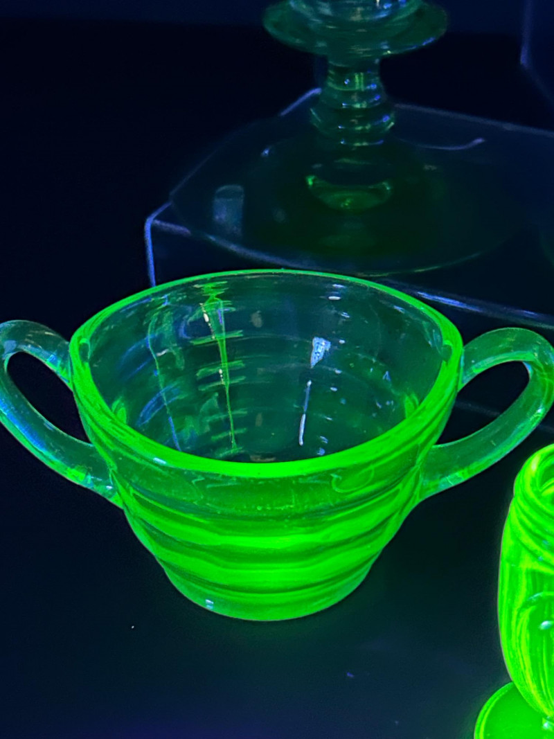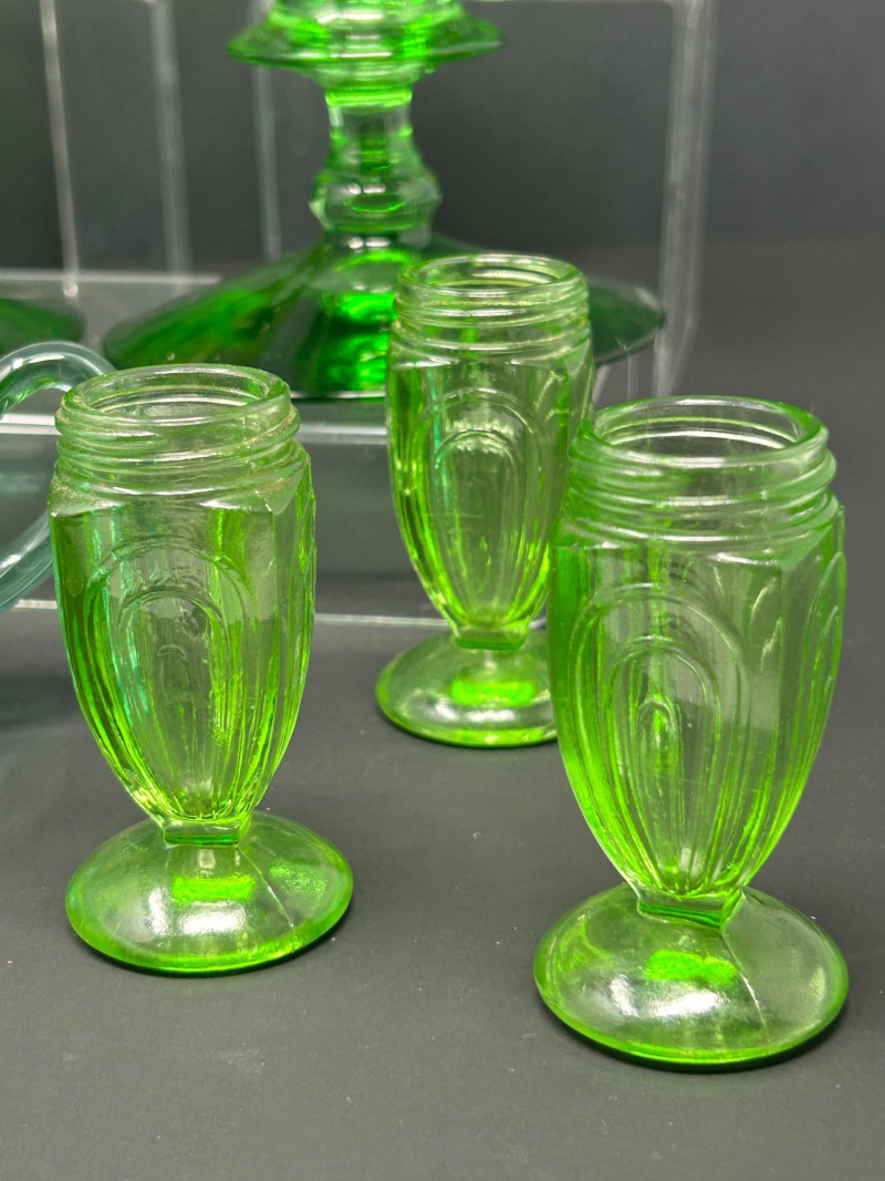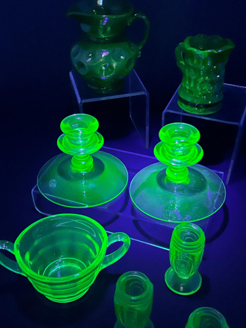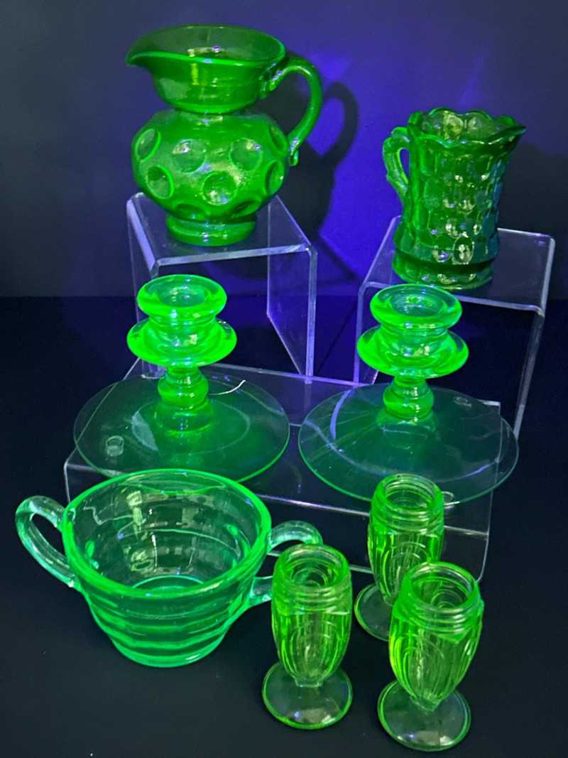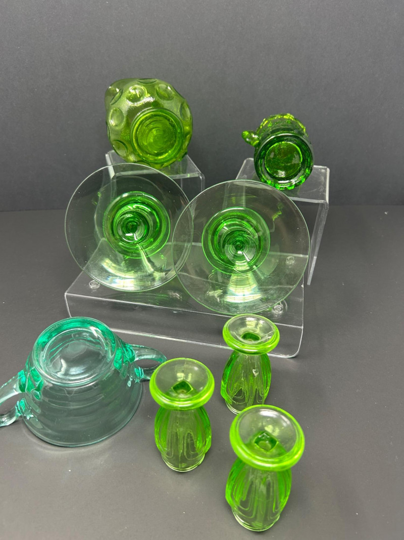 A curated grouping of American uranium green Depression-era glass, featuring two small pitchers, a pair of candlesticks, a handled sugar dish, and matching salt & pepper shakers. Together, these pieces showcase classic pressed-glass forms and patterns popular from the 1930s–1940s, highlighted by vivid translucent green color and strong UV-reactive glow. The assortment blends functional tableware with decorative accents, making it an appealing display lot for collectors of uranium or Depression glass. Model / Pattern: inverted bubble (attribution by form) Model / Pattern: Paneled / honeycomb-style pressed glass Model / Pattern: Optic-style with stepped stem and wide disc base Model / Pattern: Optic ribbed form with side handles Model / Pattern: Paperclip-style pedestal shakersItem Details: