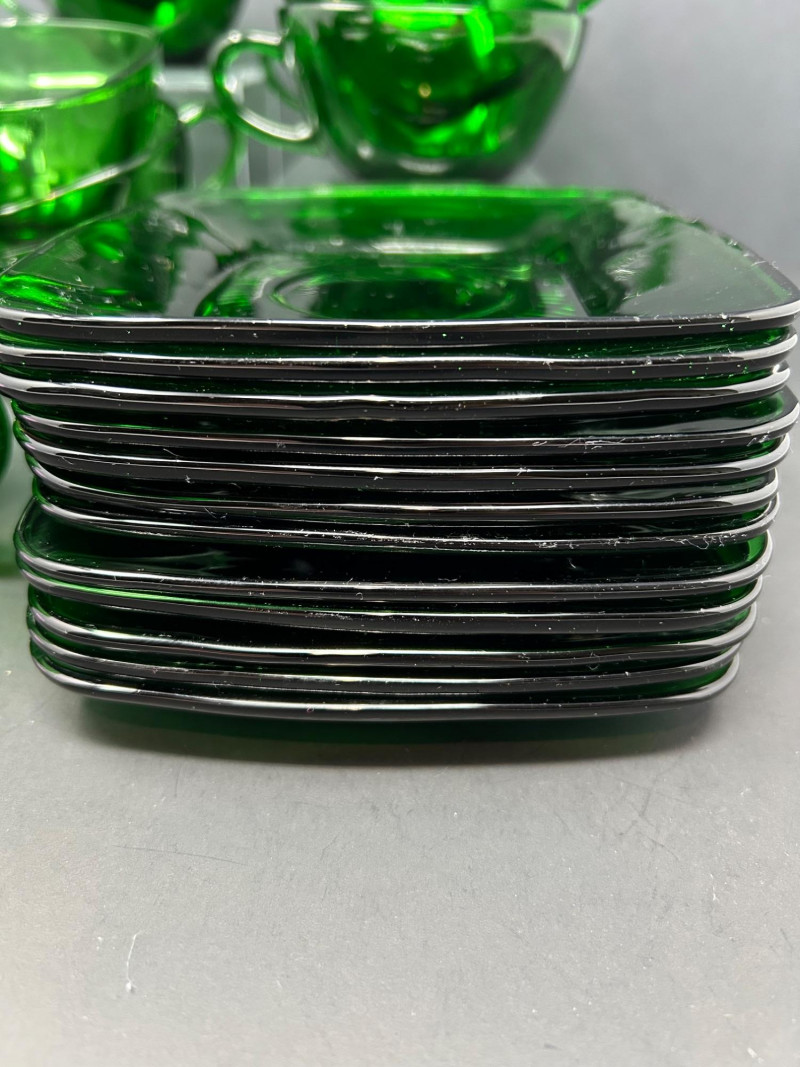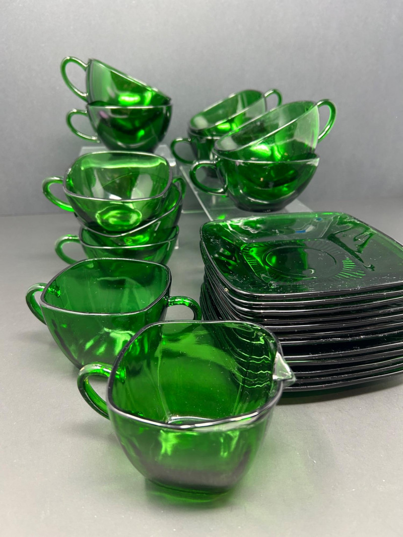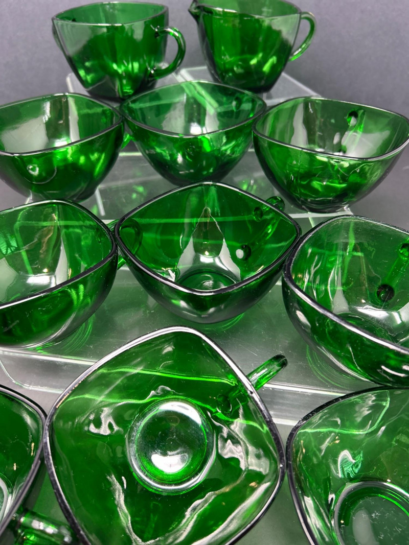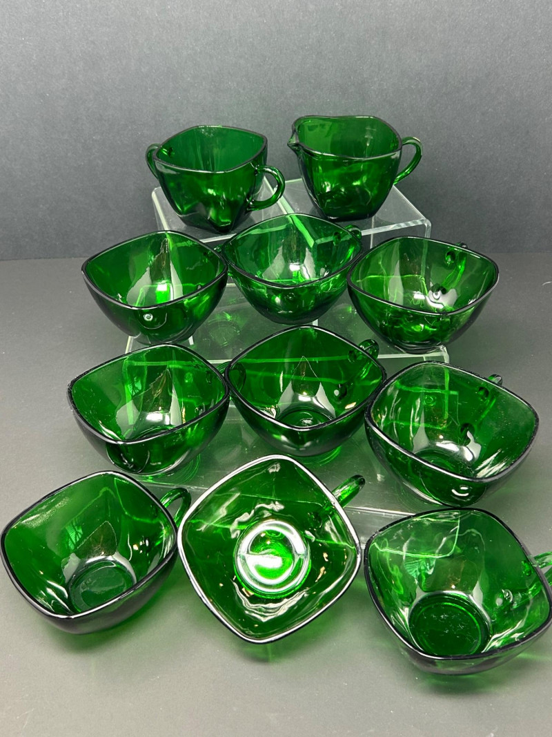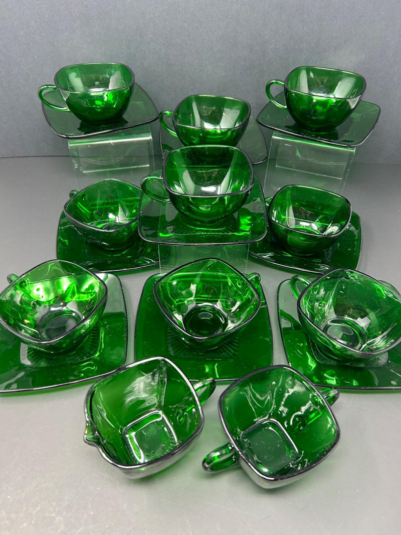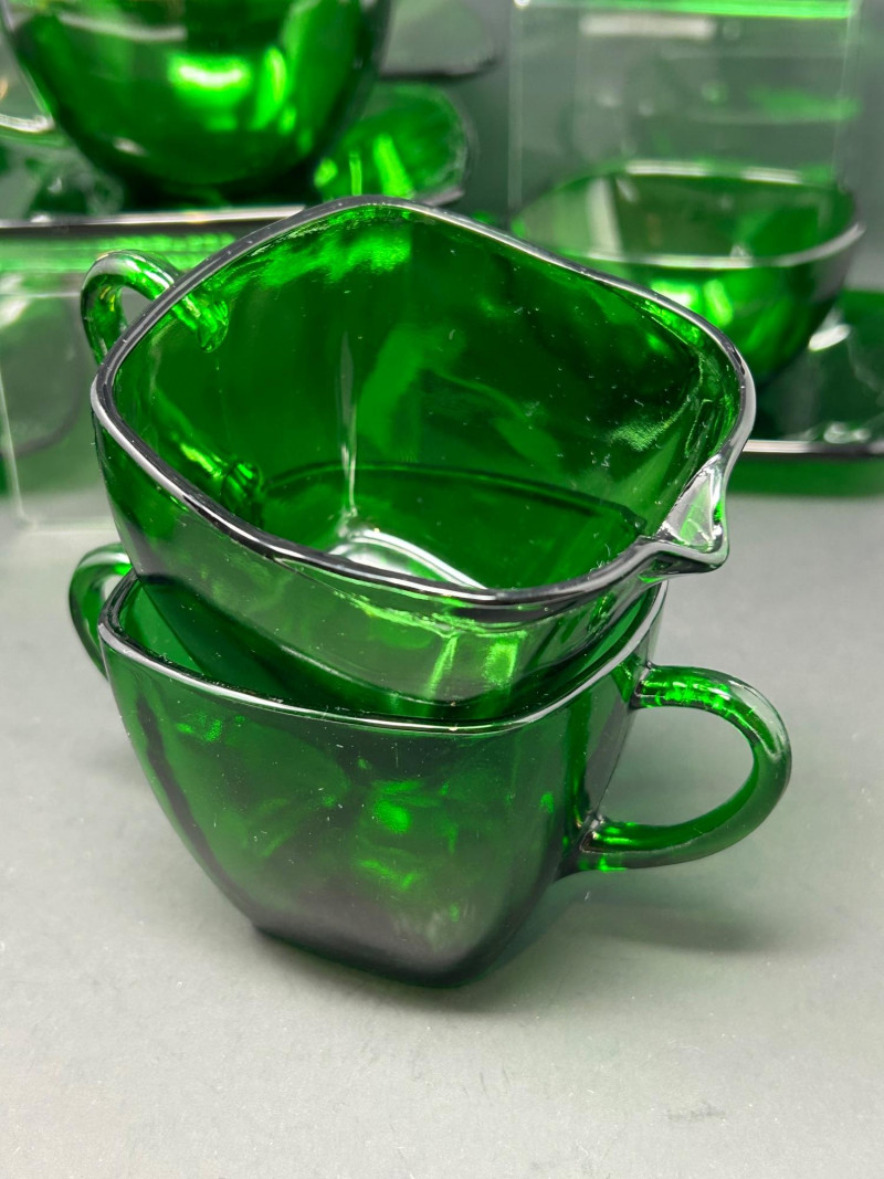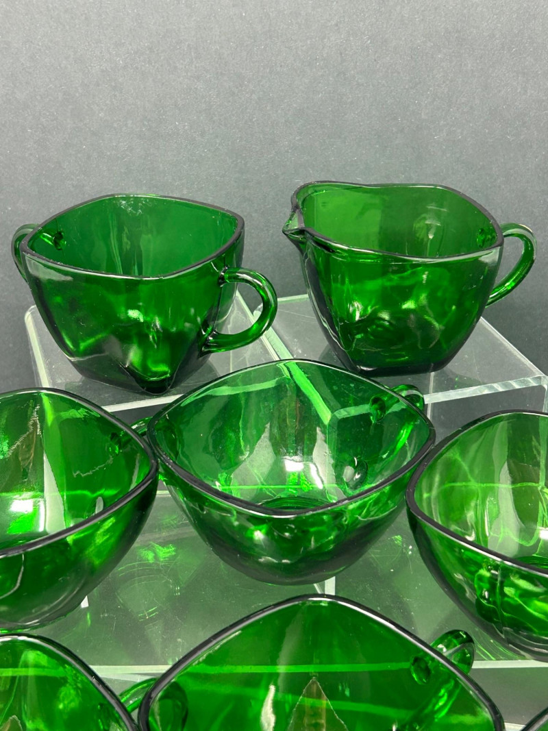 Vintage green glass tea service featuring matching cups, square saucers, and coordinating sugar and creamer. The rich emerald / forest green color and squared forms are consistent with Anchor Hocking Fire-King tableware produced in the mid-20th century. The square saucers with rounded corners and the creamer and sugar shapes closely match known Fire-King Forest Green examples. While no maker’s marks were found, the design, color, and construction strongly suggest Fire-King style production. A striking set suitable for display, collection, or vintage table use. 9 green glass cups 12 matching square saucers 1 green glass sugar bowl 1 green glass creamerLot Includes: