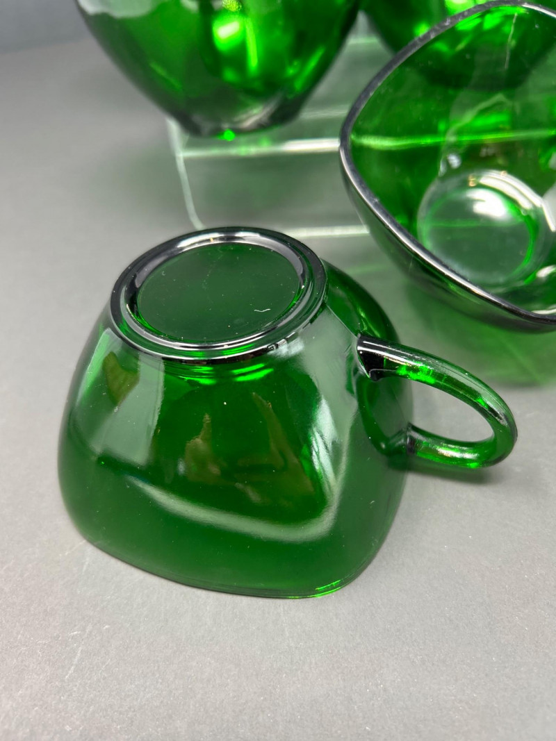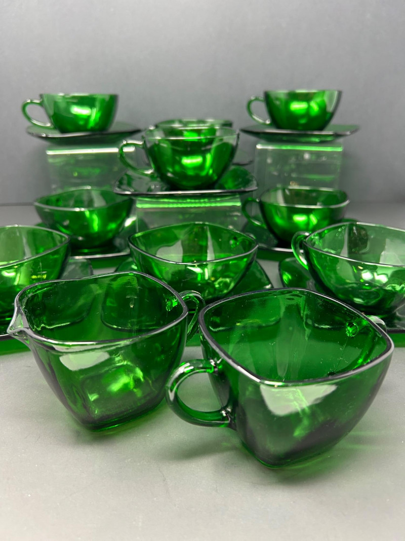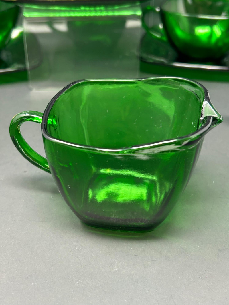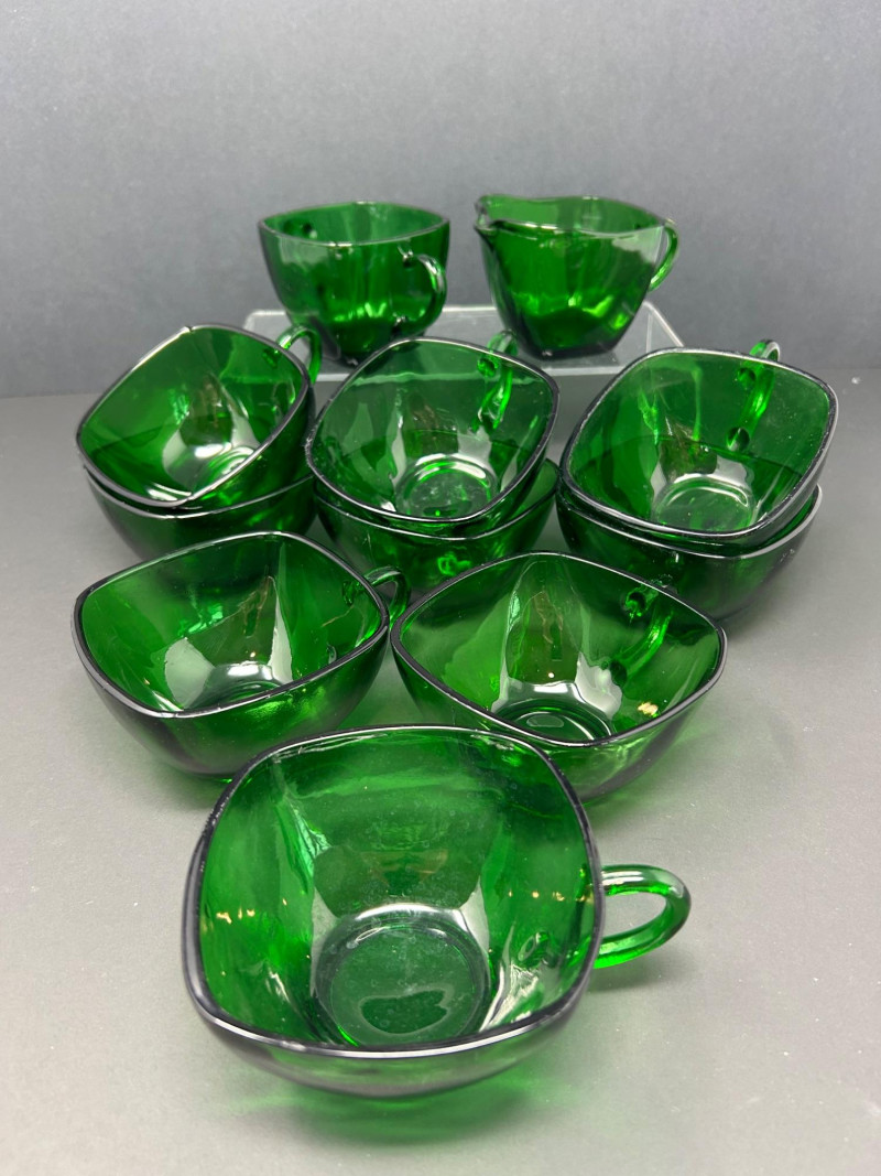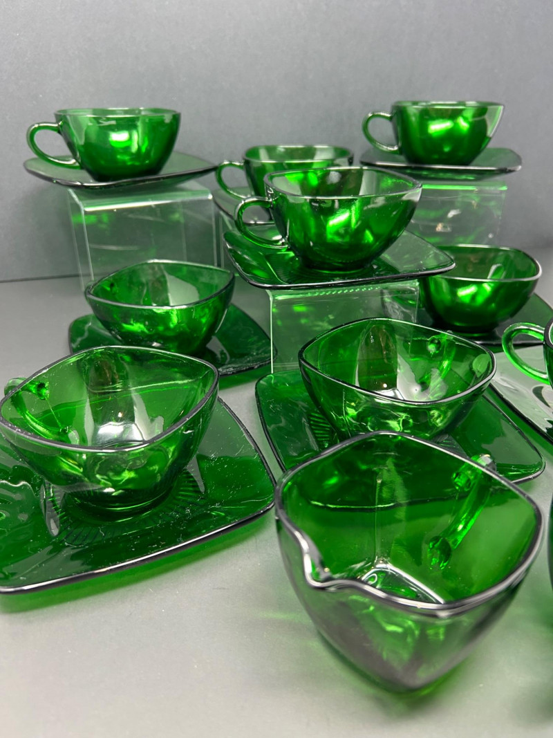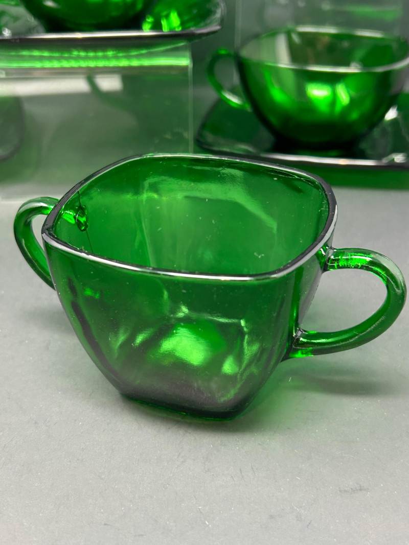 Vintage green glass tea service featuring matching cups, square saucers, and coordinating sugar and creamer. The rich emerald / forest green color and squared forms are consistent with Anchor Hocking Fire-King tableware produced in the mid-20th century. The square saucers with rounded corners and the creamer and sugar shapes closely match known Fire-King Forest Green examples. While no maker’s marks were found, the design, color, and construction strongly suggest Fire-King style production. A striking set suitable for display, collection, or vintage table use. 9 green glass cups 12 matching square saucers 1 green glass sugar bowl 1 green glass creamerLot Includes: