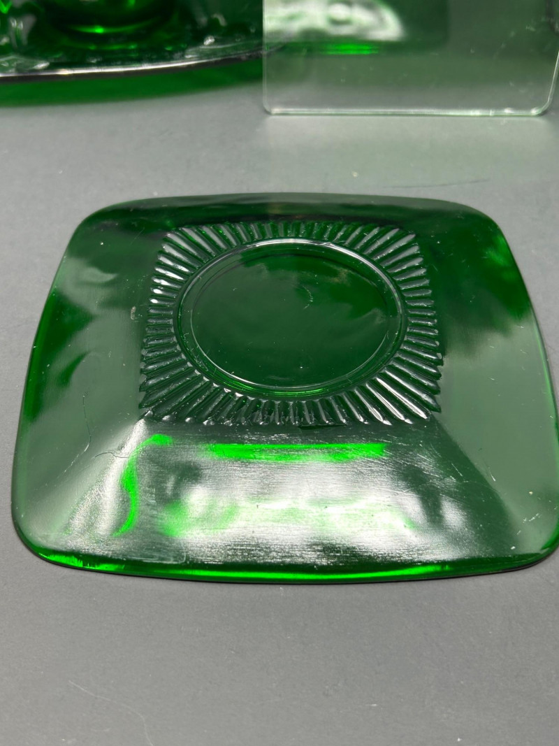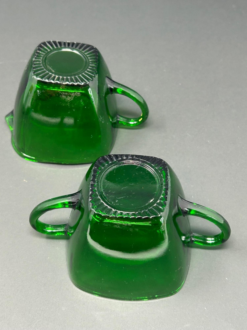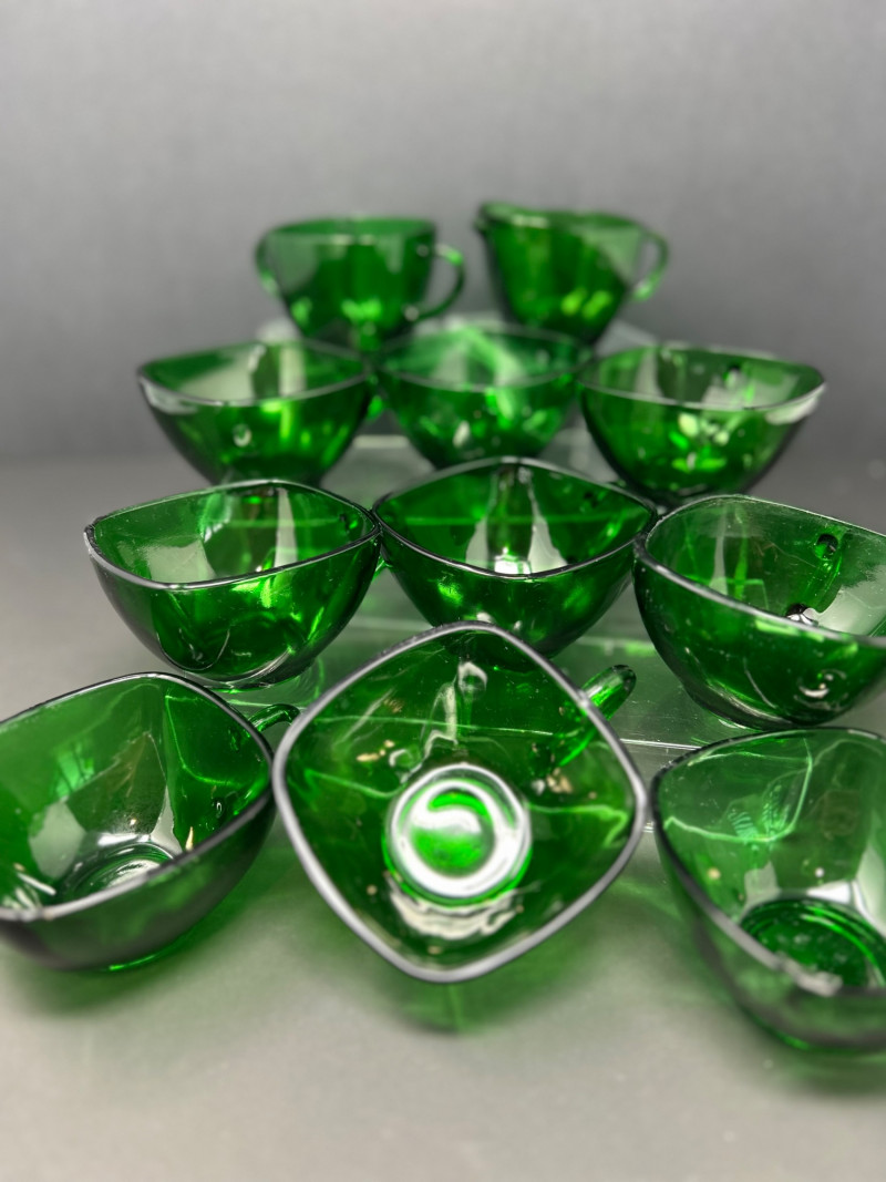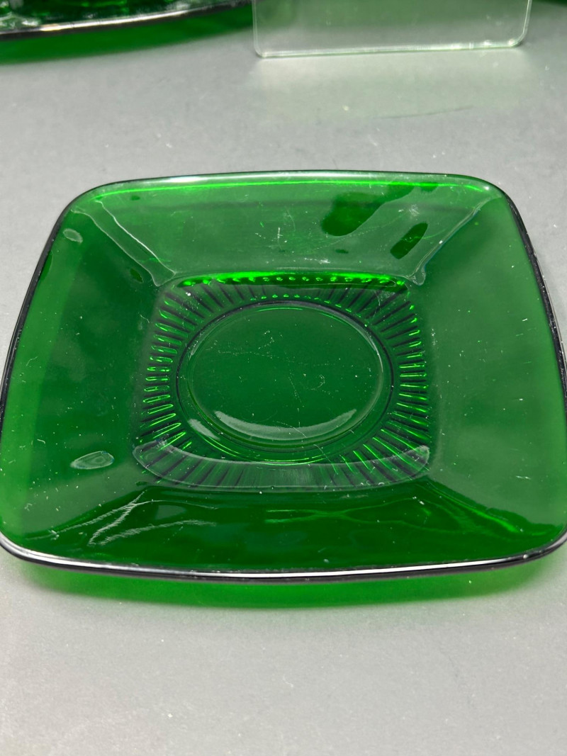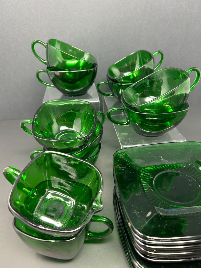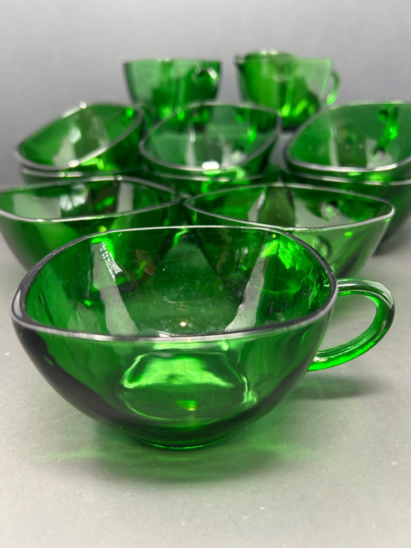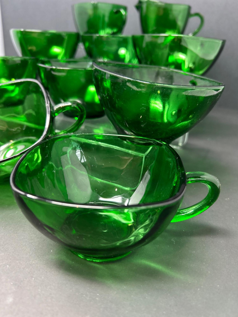 Vintage green glass tea service featuring matching cups, square saucers, and coordinating sugar and creamer. The rich emerald / forest green color and squared forms are consistent with Anchor Hocking Fire-King tableware produced in the mid-20th century. The square saucers with rounded corners and the creamer and sugar shapes closely match known Fire-King Forest Green examples. While no maker’s marks were found, the design, color, and construction strongly suggest Fire-King style production. A striking set suitable for display, collection, or vintage table use. 9 green glass cups 12 matching square saucers 1 green glass sugar bowl 1 green glass creamerLot Includes: