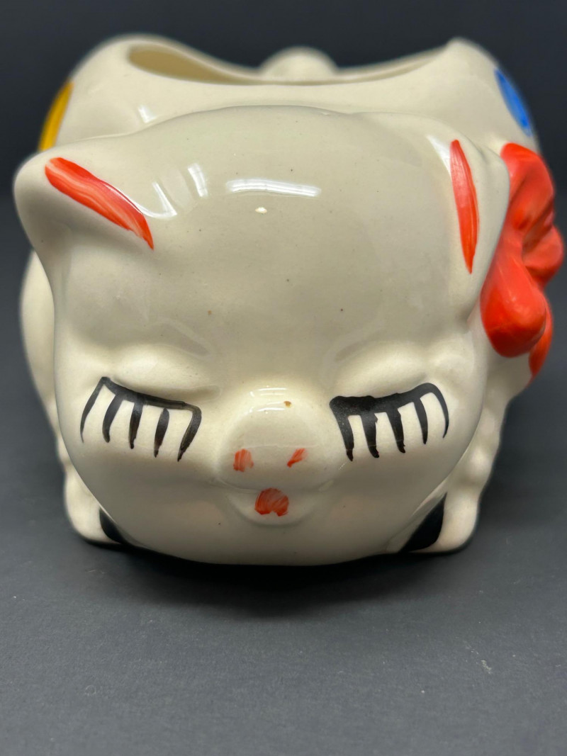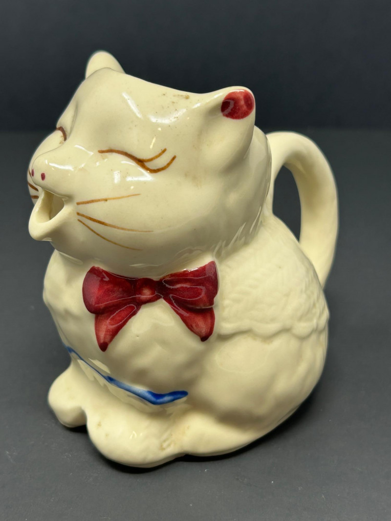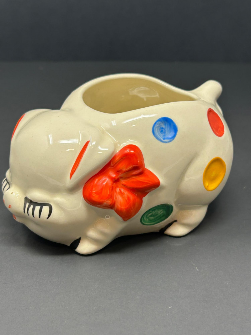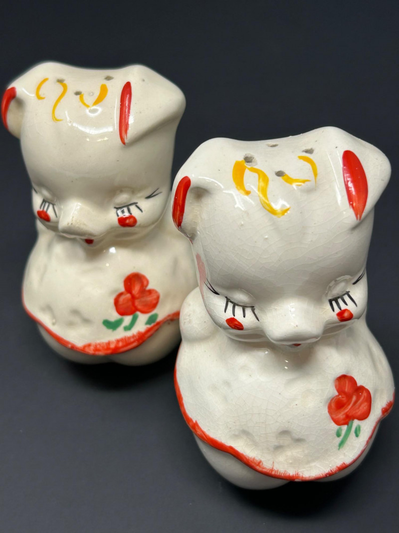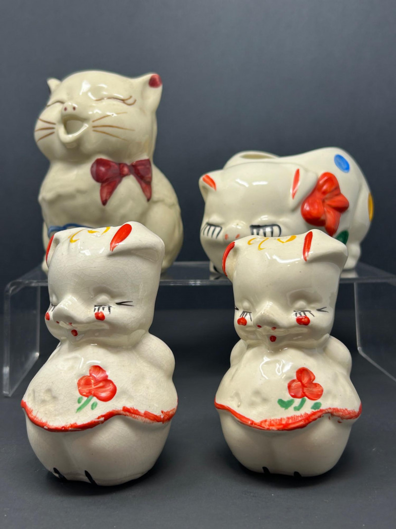 Delightful vintage ceramic tableware grouping featuring classic Shawnee Pottery novelty character designs. This four-piece lot includes two pig-form creamers, one pig salt or pepper shaker, and one cat salt or pepper shaker, all finished in a soft ivory glaze with hand-painted facial details, bows, and floral accents typical of Shawnee’s mid-century production. The pig creamers closely match documented Shawnee Smiley Pig examples produced during the 1940s–1950s, while the cat shaker aligns with Shawnee’s Puss ’n Boots character line. One piece is marked “Patented / USA,” a known Shawnee mark from this era. A charming display grouping for collectors of Shawnee pottery, vintage kitchenware, or American figural ceramics. Maker: Shawnee Pottery (attributed) Patterns / Forms: Smiley Pig & Puss ’n Boots Cat Item Type: Ceramic tableware grouping Total Pieces: 4 Includes: (2) Pig-form creamers — approx. 4" tall and 5" tall (1) Pig salt or pepper shaker — approx. 4.5" tall (1) Cat salt or pepper shaker — approx. 4.5" tall Material: Glazed ceramic Markings: One piece marked Patented / USA Era: Circa 1940s–1950s Country of Manufacture: USADetails:
