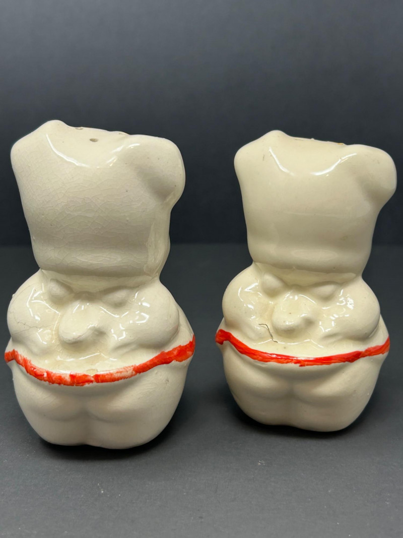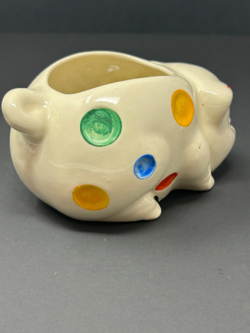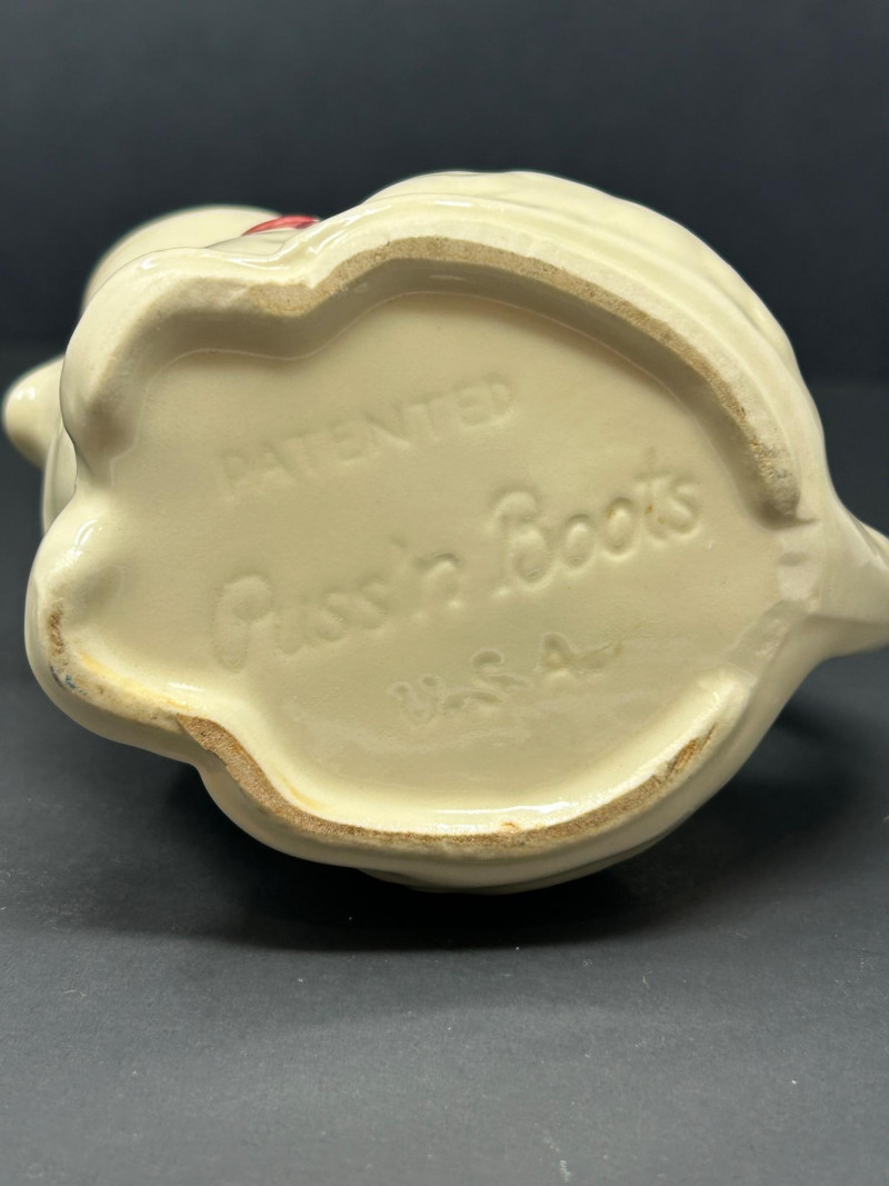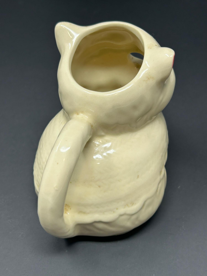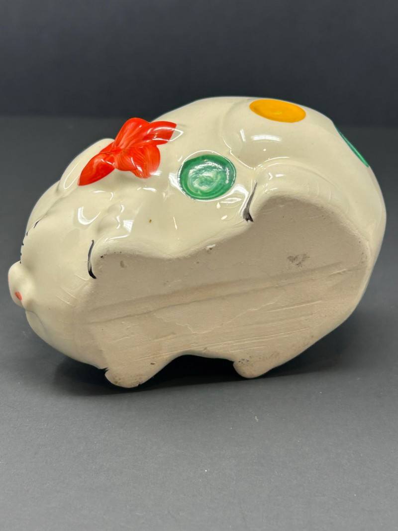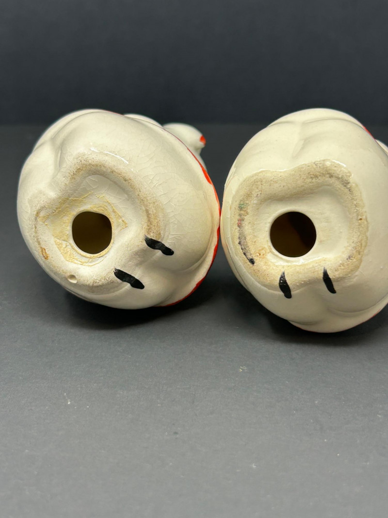 Delightful vintage ceramic tableware grouping featuring classic Shawnee Pottery novelty character designs. This four-piece lot includes two pig-form creamers, one pig salt or pepper shaker, and one cat salt or pepper shaker, all finished in a soft ivory glaze with hand-painted facial details, bows, and floral accents typical of Shawnee’s mid-century production. The pig creamers closely match documented Shawnee Smiley Pig examples produced during the 1940s–1950s, while the cat shaker aligns with Shawnee’s Puss ’n Boots character line. One piece is marked “Patented / USA,” a known Shawnee mark from this era. A charming display grouping for collectors of Shawnee pottery, vintage kitchenware, or American figural ceramics. Maker: Shawnee Pottery (attributed) Patterns / Forms: Smiley Pig & Puss ’n Boots Cat Item Type: Ceramic tableware grouping Total Pieces: 4 Includes: (2) Pig-form creamers — approx. 4" tall and 5" tall (1) Pig salt or pepper shaker — approx. 4.5" tall (1) Cat salt or pepper shaker — approx. 4.5" tall Material: Glazed ceramic Markings: One piece marked Patented / USA Era: Circa 1940s–1950s Country of Manufacture: USADetails: