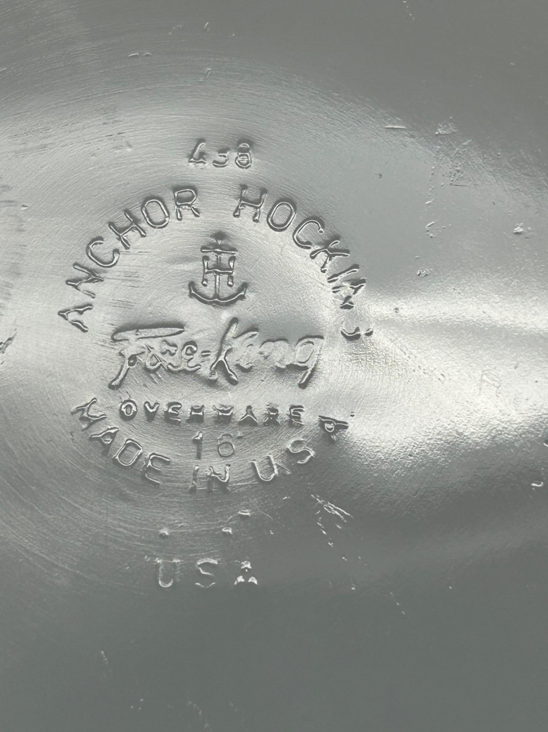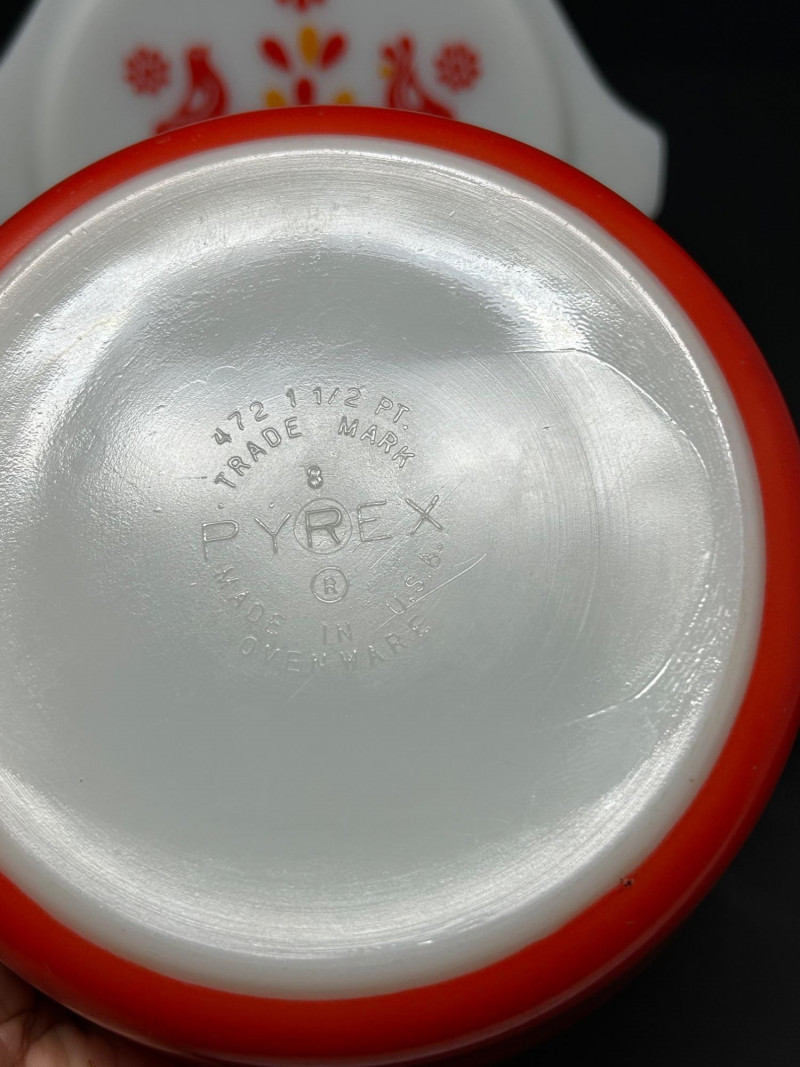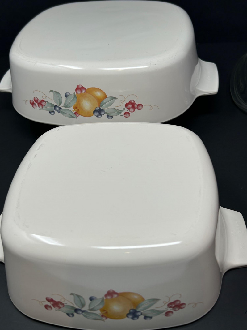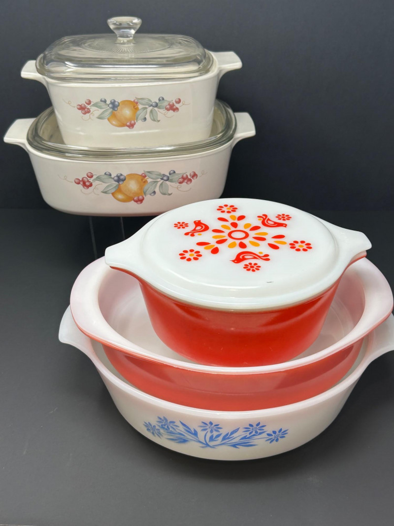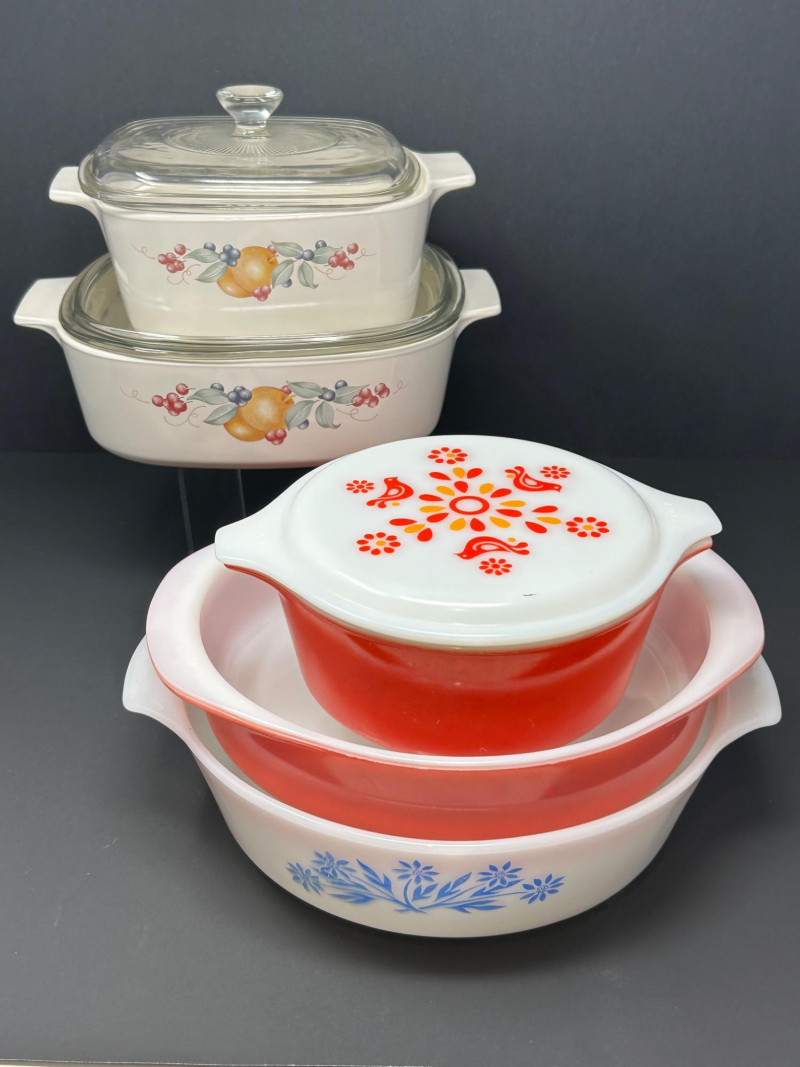 A colorful grouping of classic American glass bakeware featuring two Pyrex Friendship fruit-themed lidded casseroles, a vibrant Pink Pyrex lidded casserole, and a Fire-King casserole accented with blue floral decoration. Together, these pieces represent the charm and functionality of mid-20th-century kitchenware, blending iconic Pyrex patterns, bold retro color, and durable oven-safe glass designed for everyday use and display. Maker: Pyrex Pattern: Friendship (Fruit Motif) Date: Circa 1950s–1960s Includes: (2) Casserole dishes with matching clear glass lids Color / Finish: White glass with orange fruit, berries, and green foliage Material: Ovenware glass Marks: Pyrex / Made in USA (molded marks) Maker: Pyrex Date: Circa 1950s Includes: Casserole dish with matching lid Color / Finish: Pink opal glass with white interior Material: Ovenware glass Marks: Pyrex / Made in USA (molded marks) Maker: Fire-King Date: Circa 1950s–1960s Includes: Casserole dish (no lid) Color / Finish: White milk glass with blue floral decoration Material: Oven-safe glass Marks: Fire-King / Made in USA (molded marks)Item Details: