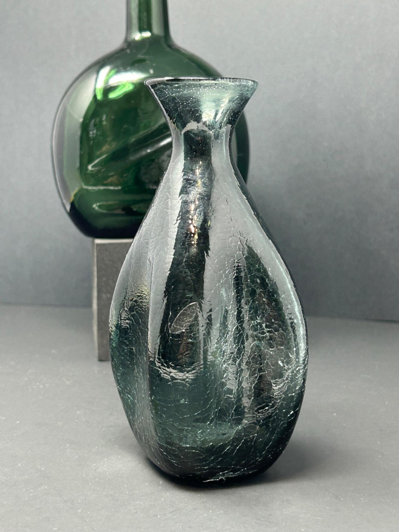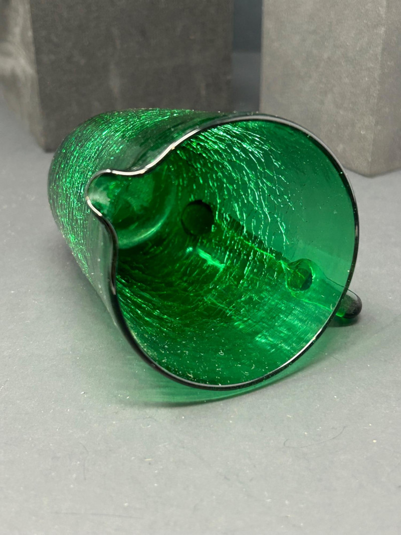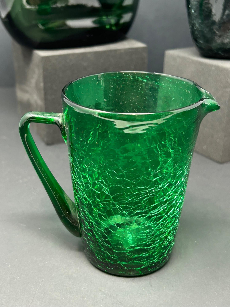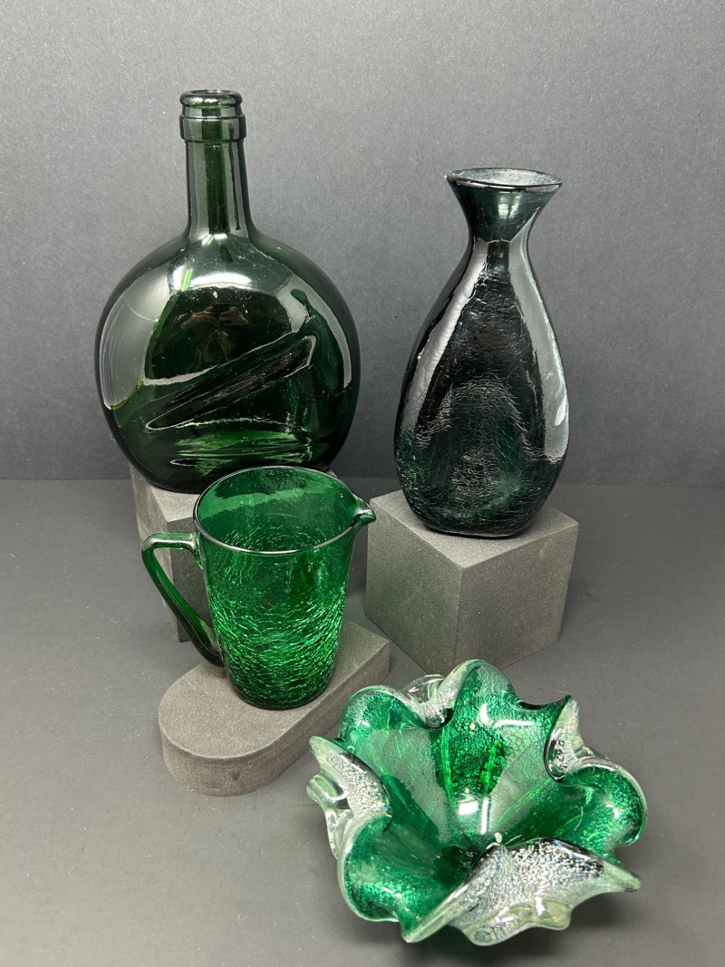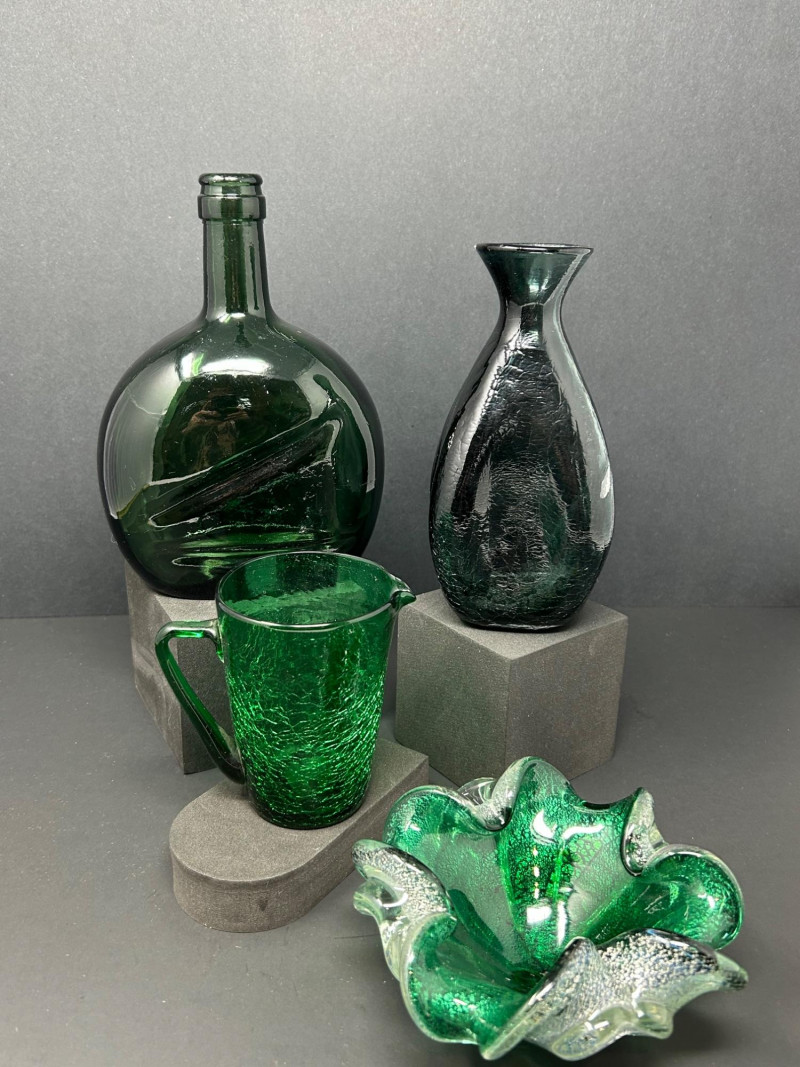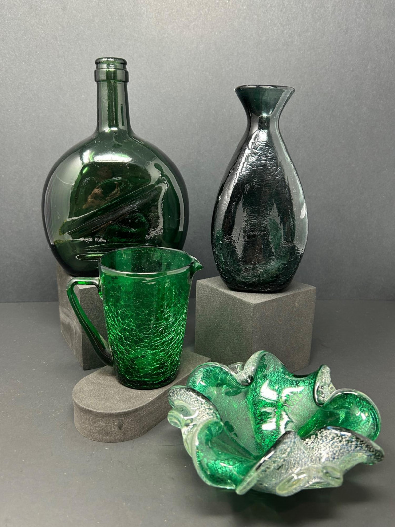 A refined grouping of vintage green art glass featuring a rounded Made in Portugal bottle, a textured pinched-neck vase, a crackle glass pitcher, and a silver-fleck ruffled ashtray bowl. Together, these pieces highlight the bold color, sculptural form, and expressive surface techniques of Mid-Century Modern European art glass, combining rich emerald hues, organic silhouettes, and decorative textures popular in mid- to late-20th-century studio production. Origin: Portugal Date: Circa mid–late 20th century Dimensions: Approx. 8" H x 5.5" W Mark: Made in Portugal (molded) Color / Finish: Deep green glass with applied swirl detail and glossy finish Date: Circa mid–late 20th century Dimensions: Approx. 7" H x 3" W Color / Finish: Dark green textured glass Design: Pinched organic form with sculptural profile Date: Circa mid–late 20th century Dimensions: Approx. 4" H Color / Finish: Bright emerald green crackle glass Design: Hand-formed pitcher with applied handle and textured body Date: Circa mid–late 20th century Dimensions: Approx. 5.5" W x 3" H Color / Finish: Green glass with silver flake inclusions and clear accents Design: Ruffled rim ashtray bowl with controlled bubbles and MCM Murano-style influenceItem Details: