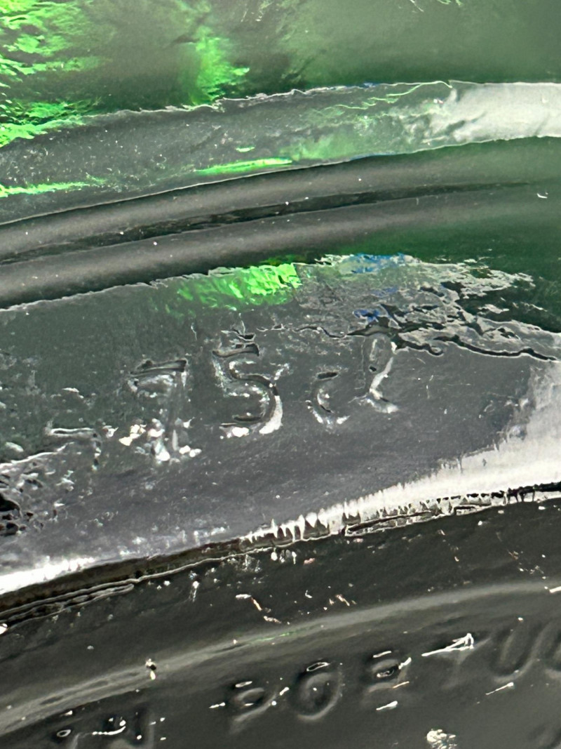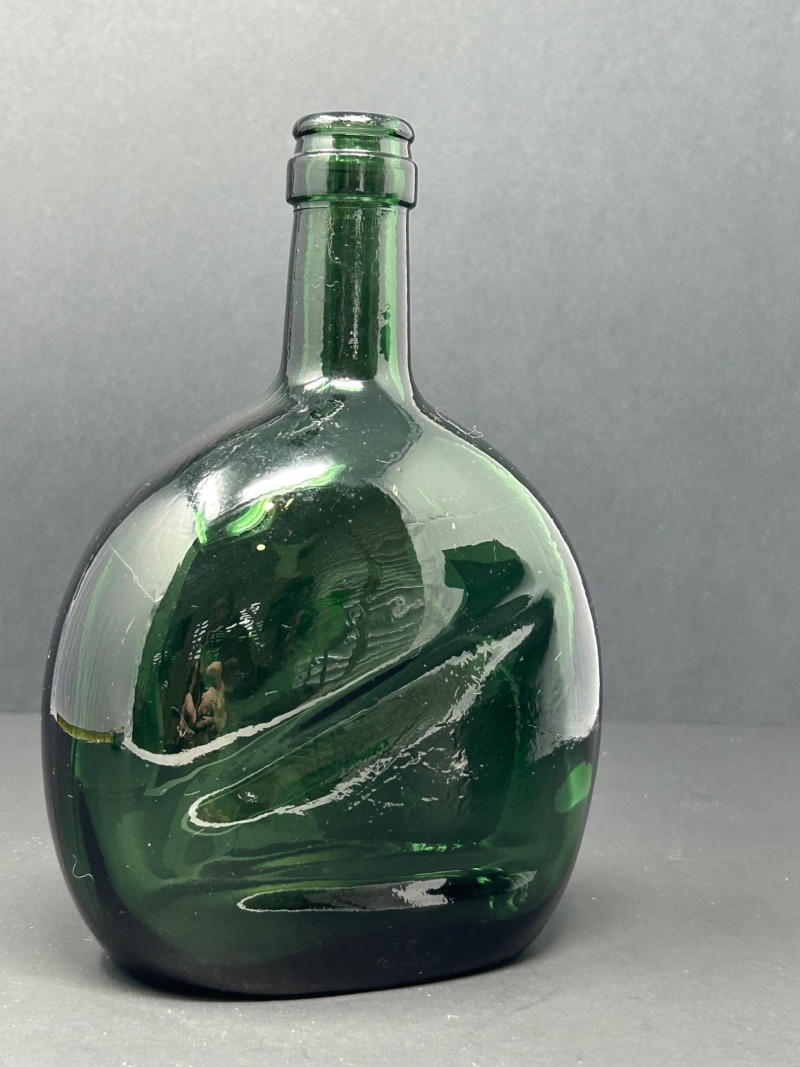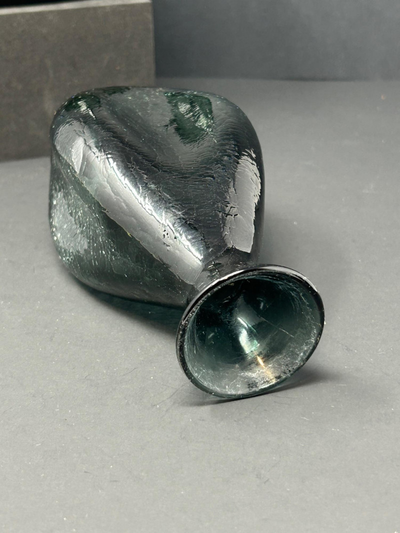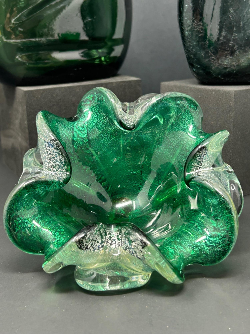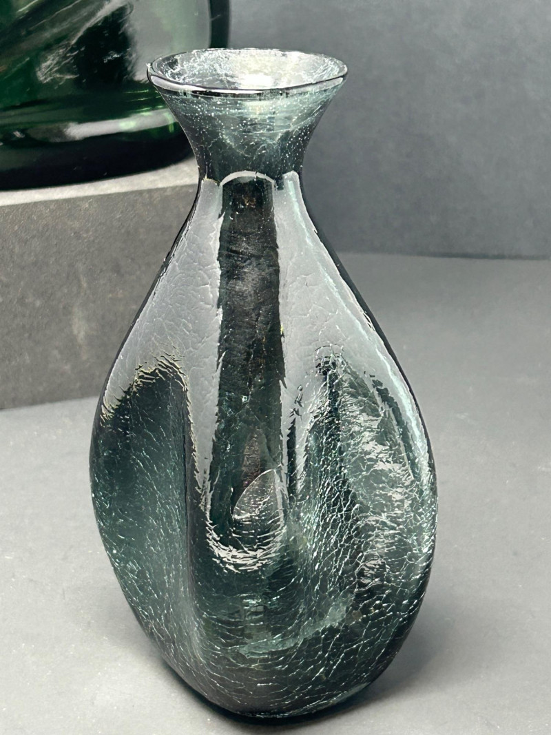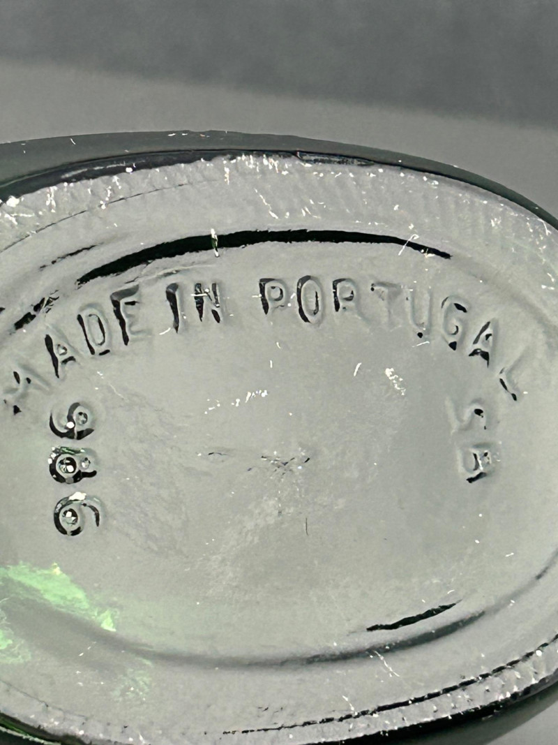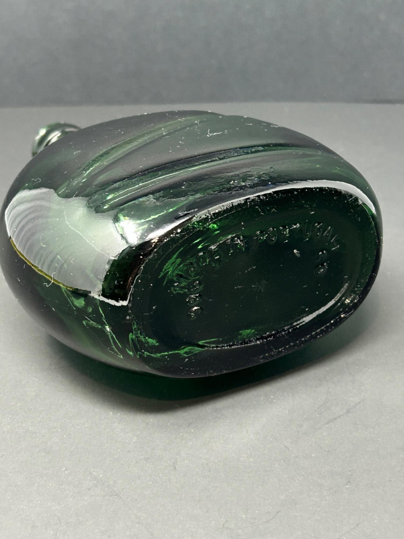 A refined grouping of vintage green art glass featuring a rounded Made in Portugal bottle, a textured pinched-neck vase, a crackle glass pitcher, and a silver-fleck ruffled ashtray bowl. Together, these pieces highlight the bold color, sculptural form, and expressive surface techniques of Mid-Century Modern European art glass, combining rich emerald hues, organic silhouettes, and decorative textures popular in mid- to late-20th-century studio production. Origin: Portugal Date: Circa mid–late 20th century Dimensions: Approx. 8" H x 5.5" W Mark: Made in Portugal (molded) Color / Finish: Deep green glass with applied swirl detail and glossy finish Date: Circa mid–late 20th century Dimensions: Approx. 7" H x 3" W Color / Finish: Dark green textured glass Design: Pinched organic form with sculptural profile Date: Circa mid–late 20th century Dimensions: Approx. 4" H Color / Finish: Bright emerald green crackle glass Design: Hand-formed pitcher with applied handle and textured body Date: Circa mid–late 20th century Dimensions: Approx. 5.5" W x 3" H Color / Finish: Green glass with silver flake inclusions and clear accents Design: Ruffled rim ashtray bowl with controlled bubbles and MCM Murano-style influenceItem Details: