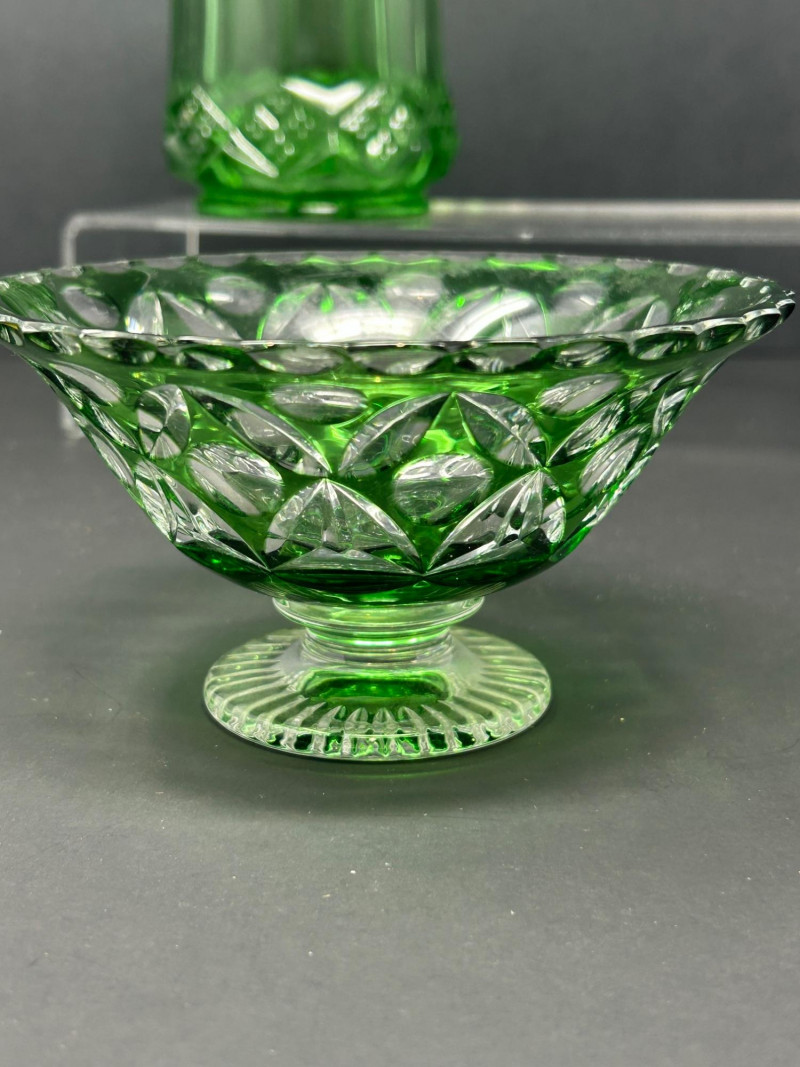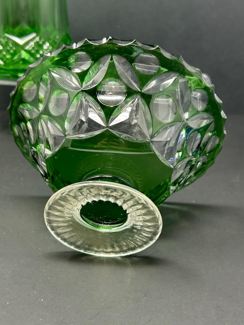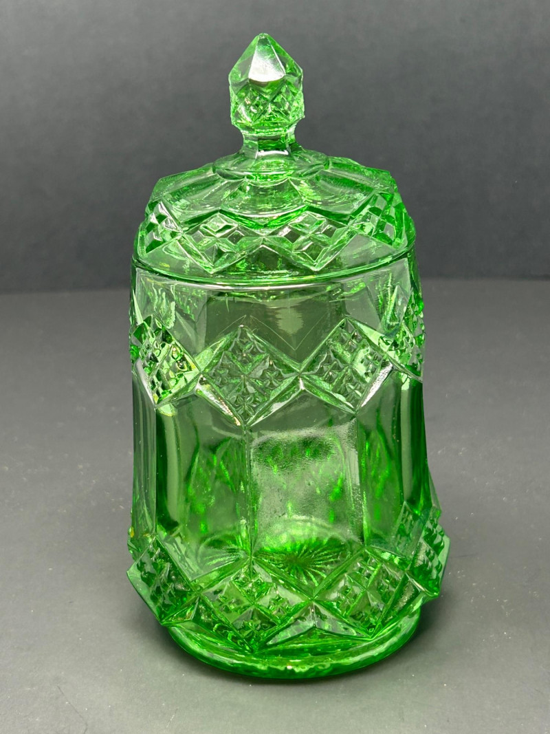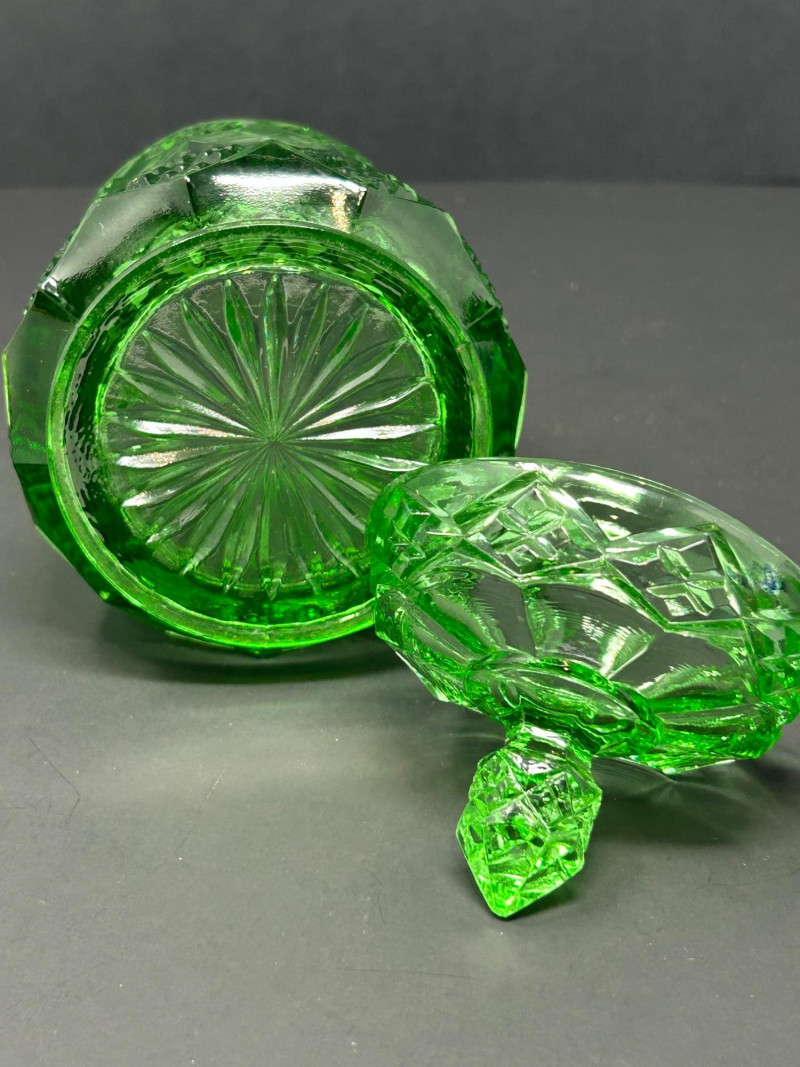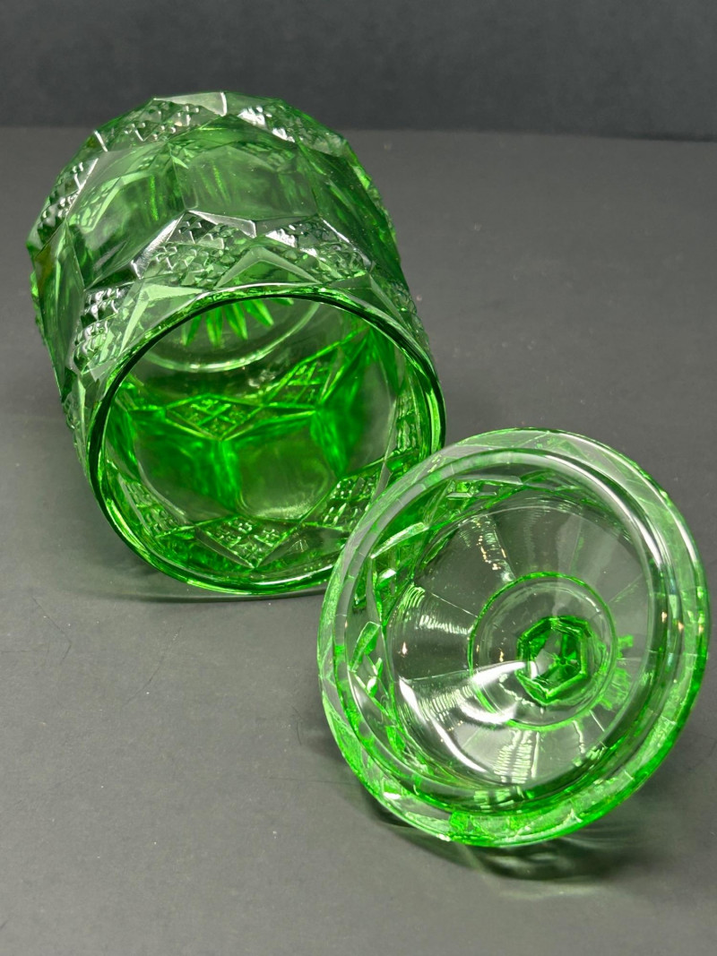 Design: Cylindrical form with diamond banding, geometric cut panels, and a matching faceted finial lidGreen Cut Glass Pedestal Bowl