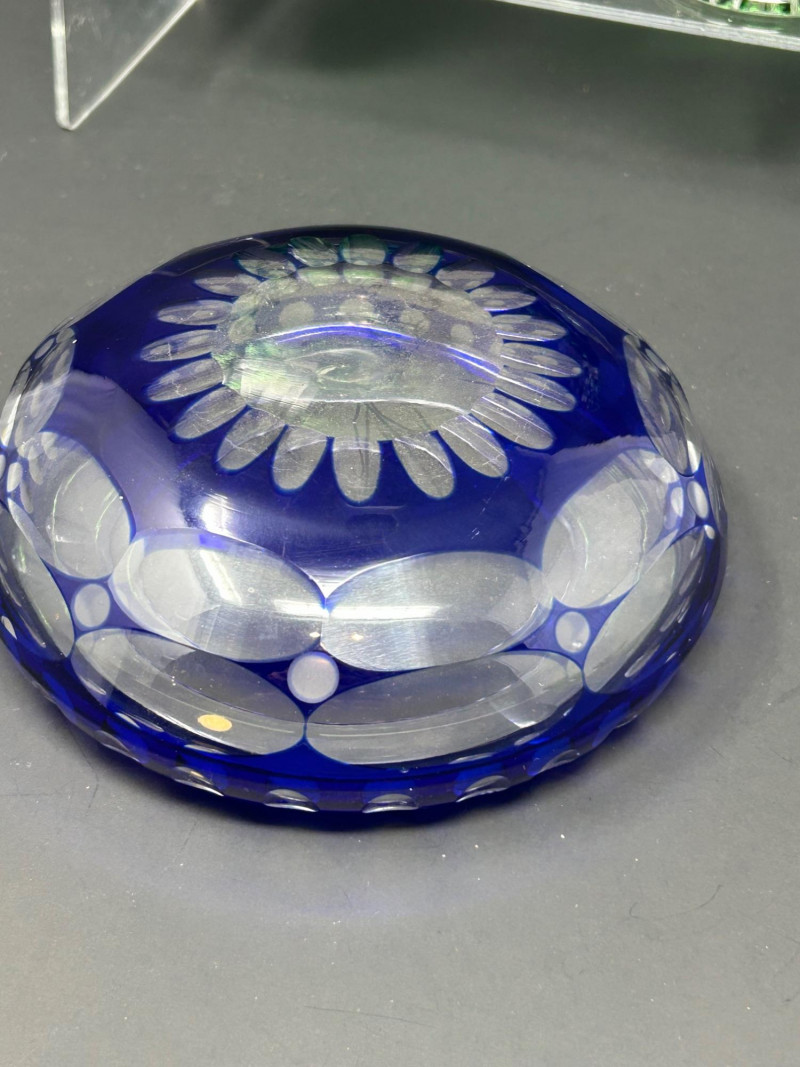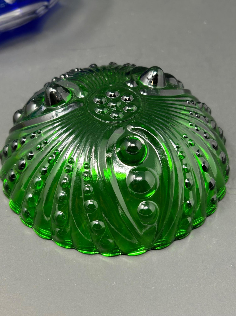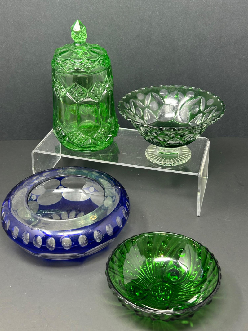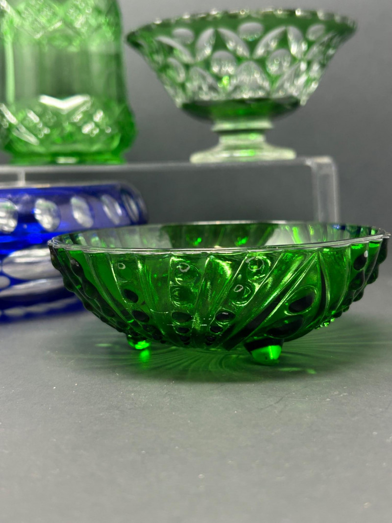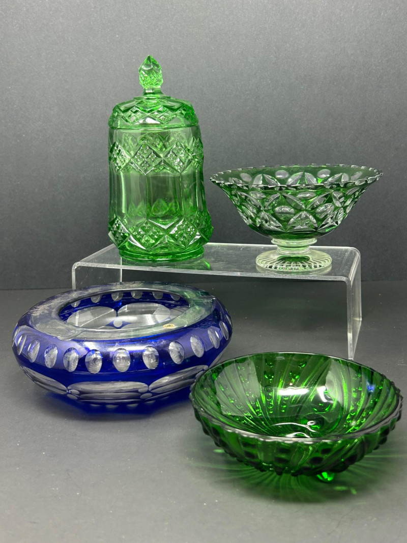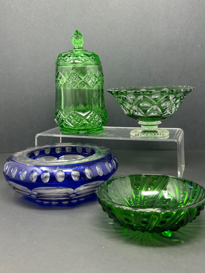 A decorative group of four vintage glass pieces in emerald green and cobalt blue, featuring a pressed glass swirl bowl, a cut glass covered jar, a cut glass pedestal bowl, and a blue art glass bowl. The collection highlights classic mid-century design elements including radiating swirl patterns, raised dot detailing, diamond cutting, and oval cut motifs. One bowl in the group is likely produced by Anchor Hocking, while the remaining pieces are unattributed. Together, they create an attractive and varied display set for collectors of vintage decorative glass. Date: Mid-20th century (style-based attribution) Dimensions: Approx. 7” H x 4” diameter Dimensions: Approx. 5” diameter x 3” H Dimensions: Approx. 6” diameter x 2½” HLot Details: