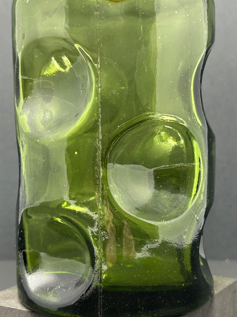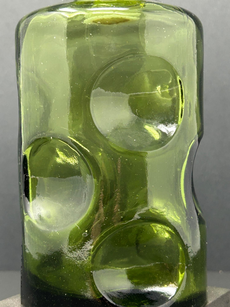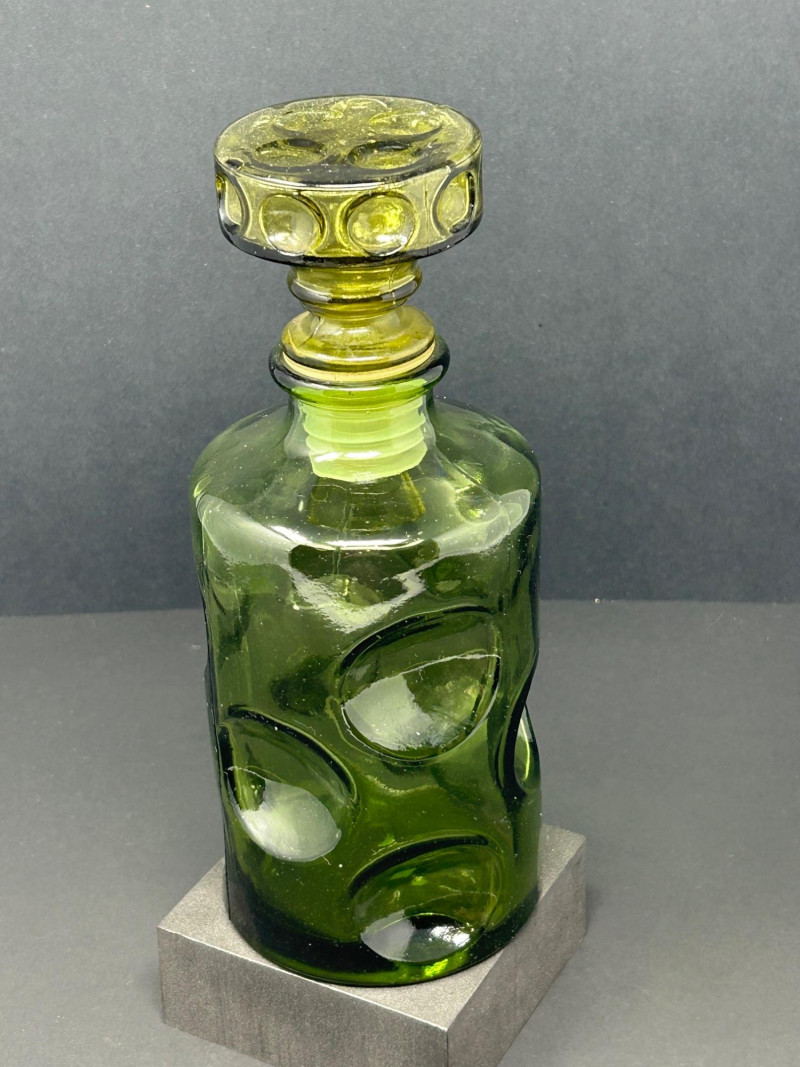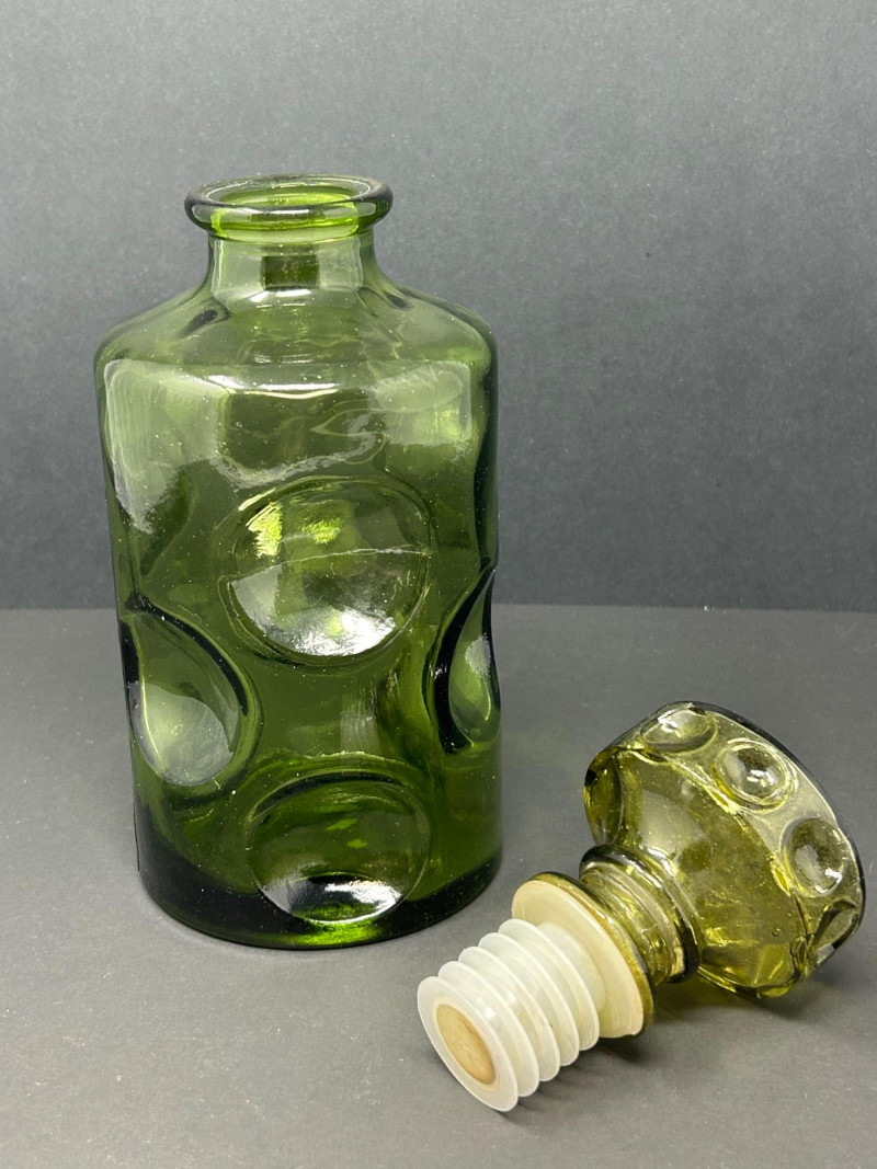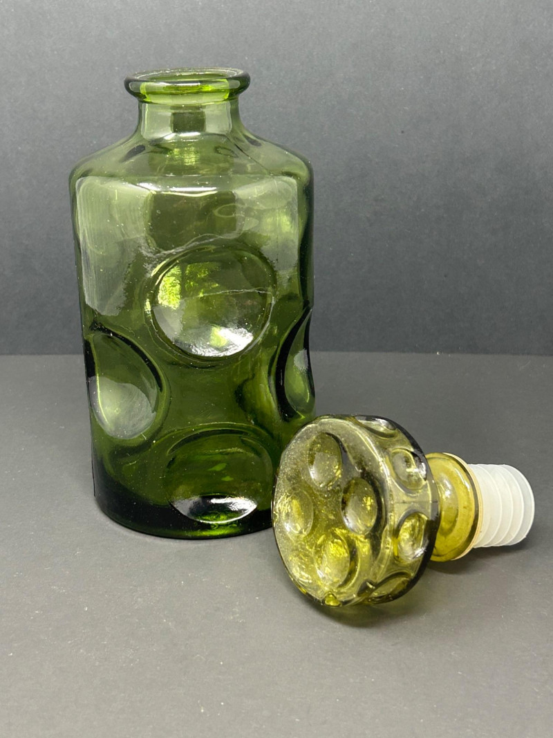 This appears to be a vintage green glass decanter with a thumbprint pattern—a classic pressed glass motif featuring oval or round indentations that resemble thumbprints. The matching stopper, with its circular indentations, reinforces the decorative theme and suggests it was made as a set. Material: Pressed glass Color: Emerald green Design: Cylindrical body with embossed oval "thumbprint" pattern; stopper features matching circular indentations Dimensions: Approx. 9.5" tall, 3.75" diameter Era: Likely mid-20th century, possibly 1960s–70s Condition: Appears intact with no visible chips or cracks Use: Originally intended for serving liquor or decorative display