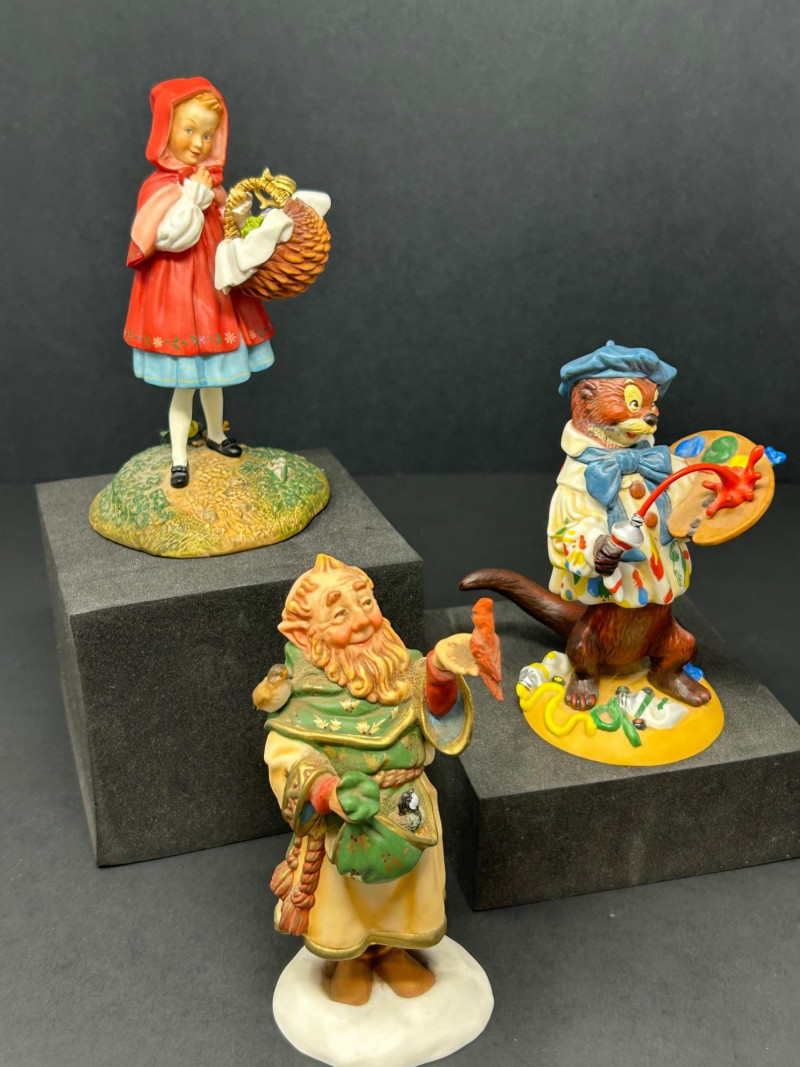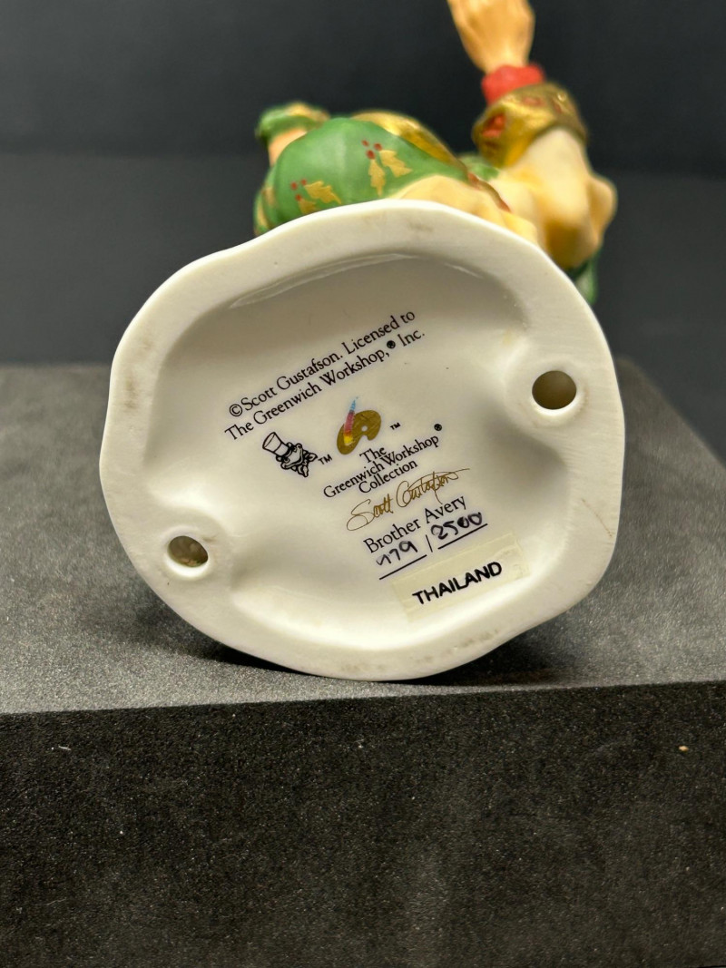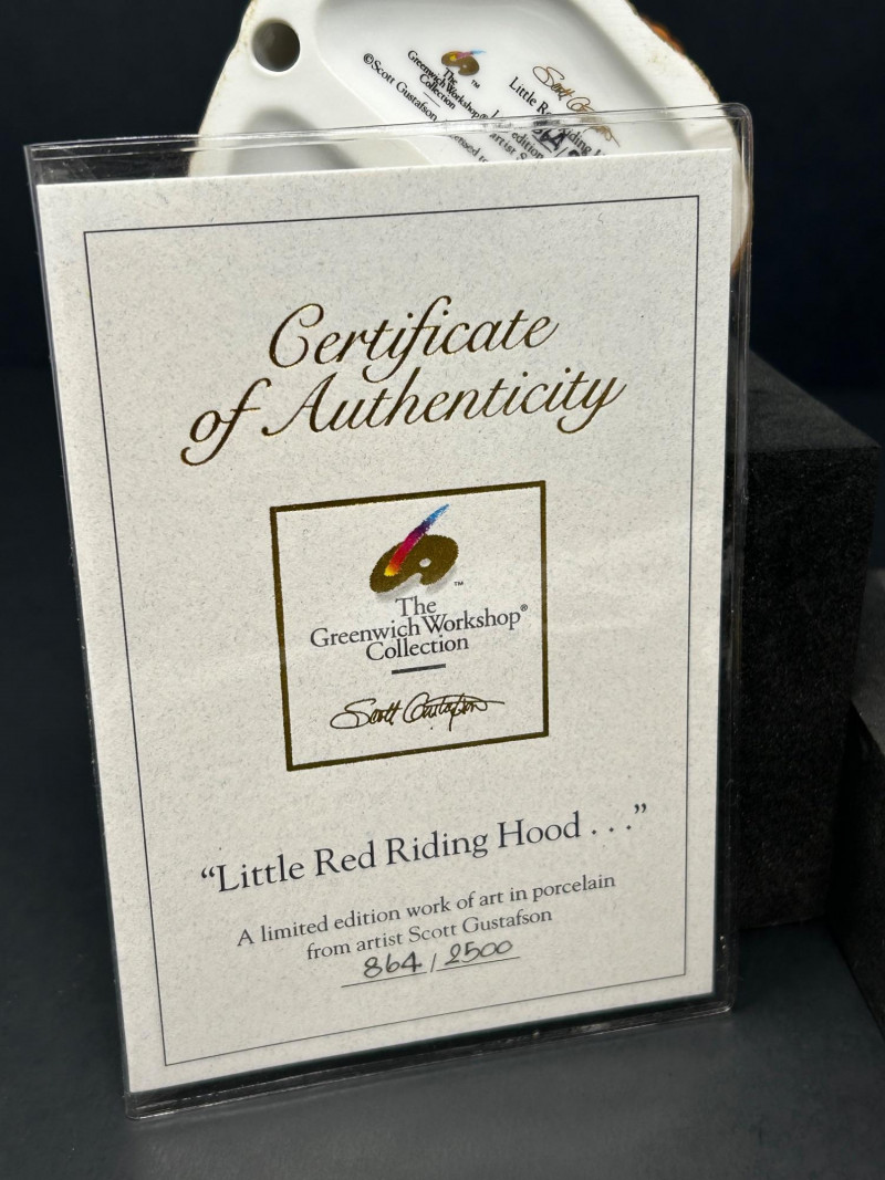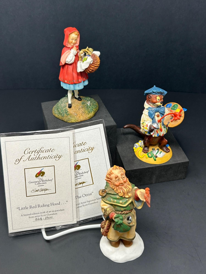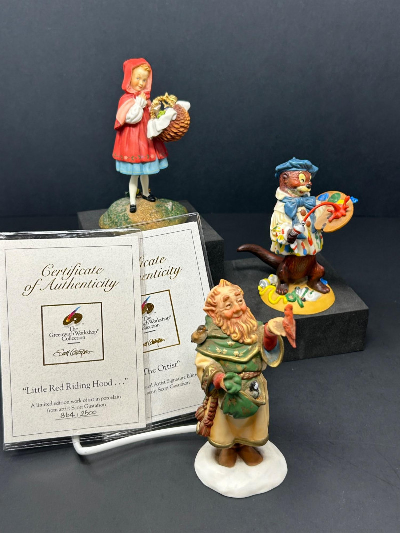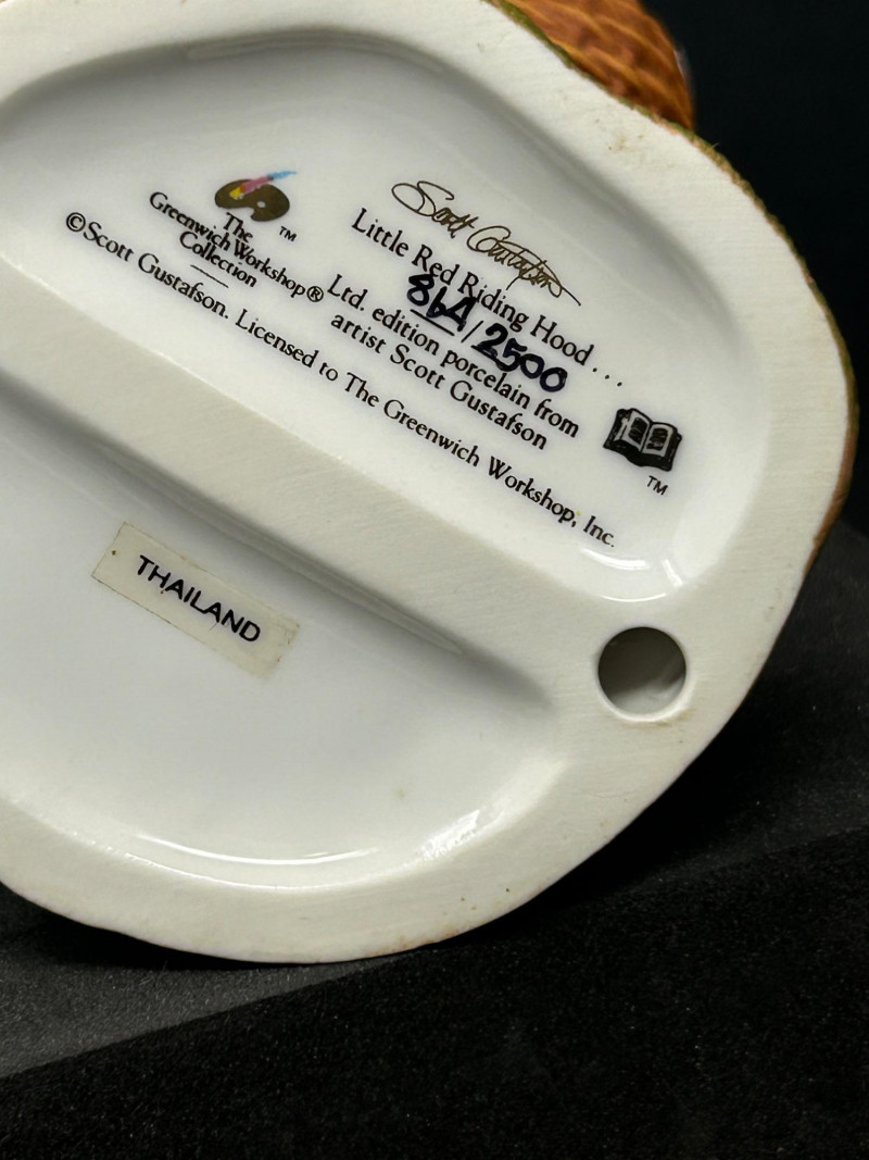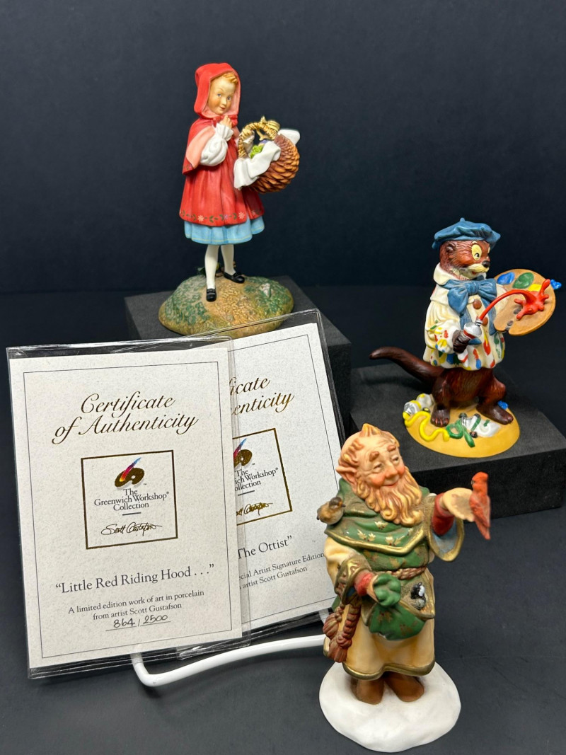 This charming three-piece porcelain figurine lot features beloved storybook characters designed by renowned illustrator Scott Gustafson and produced by The Greenwich Workshop. Each piece showcases Gustafson’s signature fairytale style, with expressive faces, rich hand-painted colors, and whimsical detailing. Included in the set are: “Little Red Riding Hood” – a classic fairytale depiction, complete with basket and forest base “The Ottist” – a playful anthropomorphic otter artist holding a paint palette “Brother Avery” – a warm, storybook monk figure with bird companion All three figures are limited editions, clearly marked on the underside, and made in Thailand. The lot includes Certificates of Authenticity for Little Red Riding Hood and The Ottist, enhancing collectibility and display appeal. Artist: Scott Gustafson Publisher: The Greenwich Workshop Medium: Hand-painted porcelain Titles Included: Little Red Riding Hood – Limited Edition #864 / 2500 Brother Avery – Limited Edition #779 / 2500 The Ottist – Special Artist Signature Collection Origin: Thailand Condition: Very good overall; no chips or cracks observed Certificates: COAs included (see photos)Details: