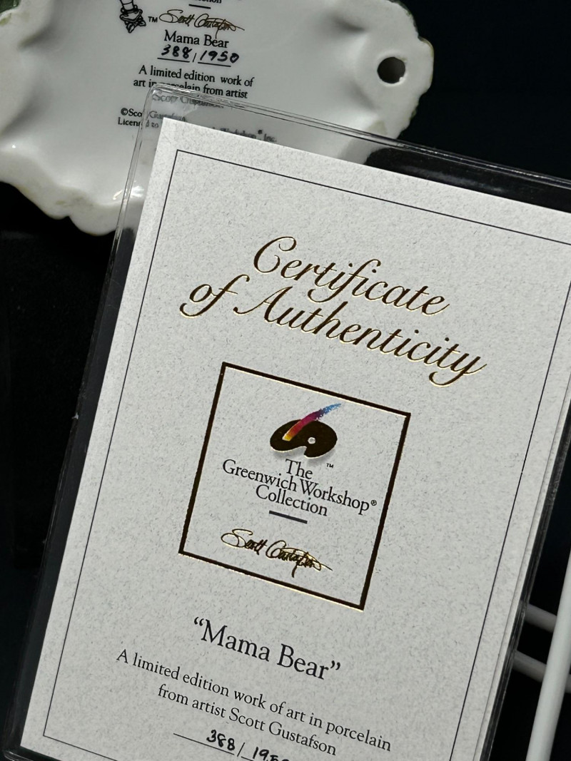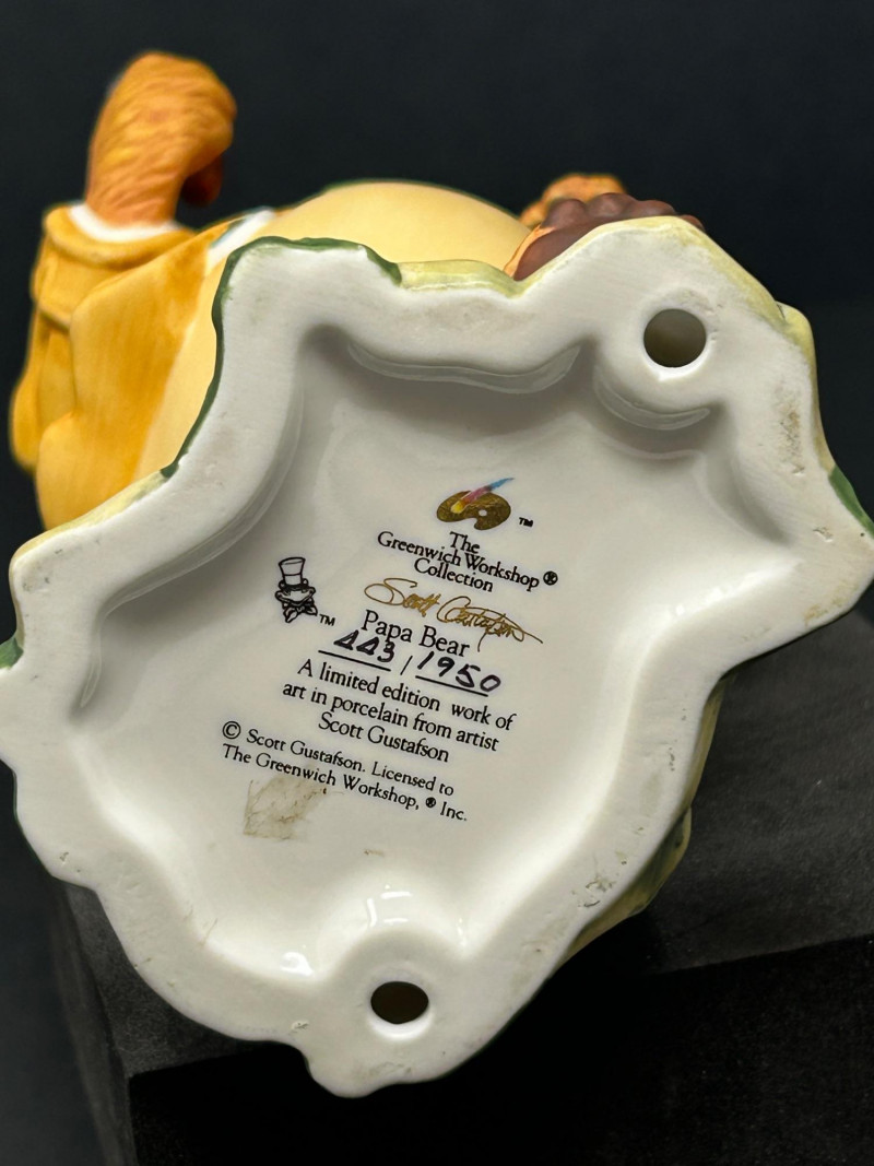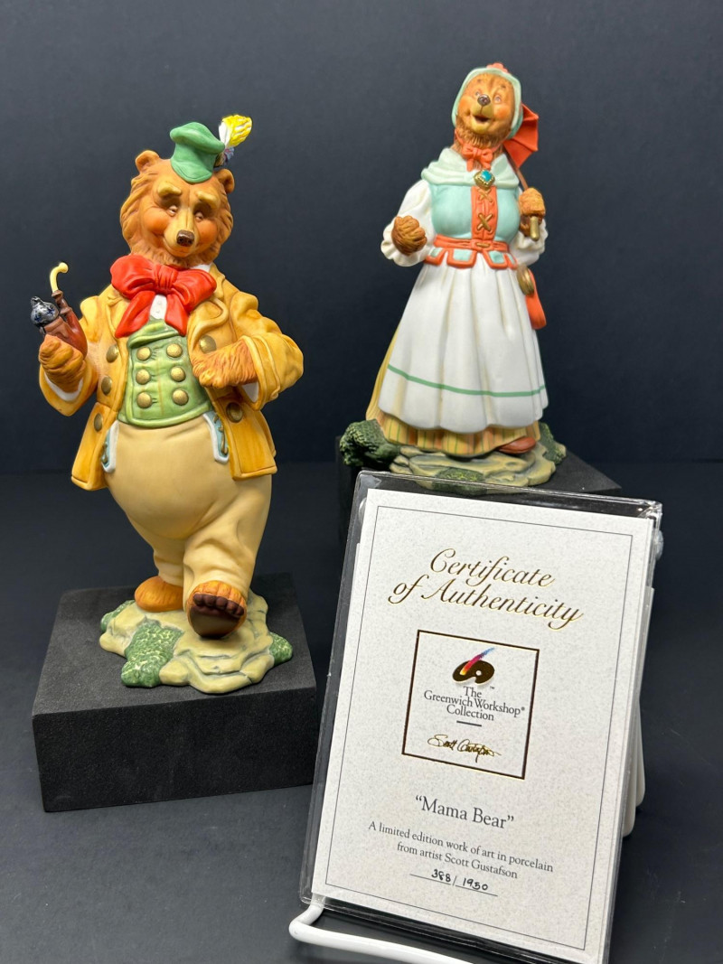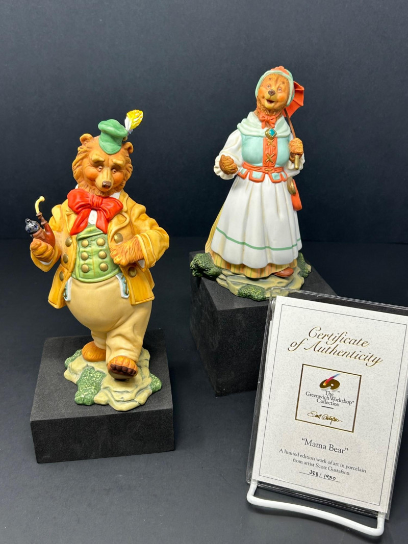 Charming limited-edition porcelain figurine pair featuring Papa Bear and Mama Bear, beautifully sculpted by renowned illustrator Scott Gustafson and produced by The Greenwich Workshop. Both figurines are hand-numbered limited editions and come with their original Certificates of Authenticity, confirming their authenticity and collectible status. Details: Artist: Scott Gustafson Publisher: The Greenwich Workshop Collection Titles: Papa Bear – Limited Edition 443 / 1950 Mama Bear – Limited Edition 388 / 1950 Material: Porcelain Origin: Made in Thailand Marks: Fully marked on underside with artist signature, edition numbers, and Greenwich Workshop insignia Includes: (2) Porcelain figurines + (2) original Certificates of Authenticity