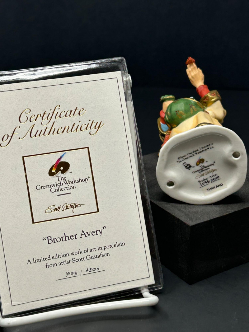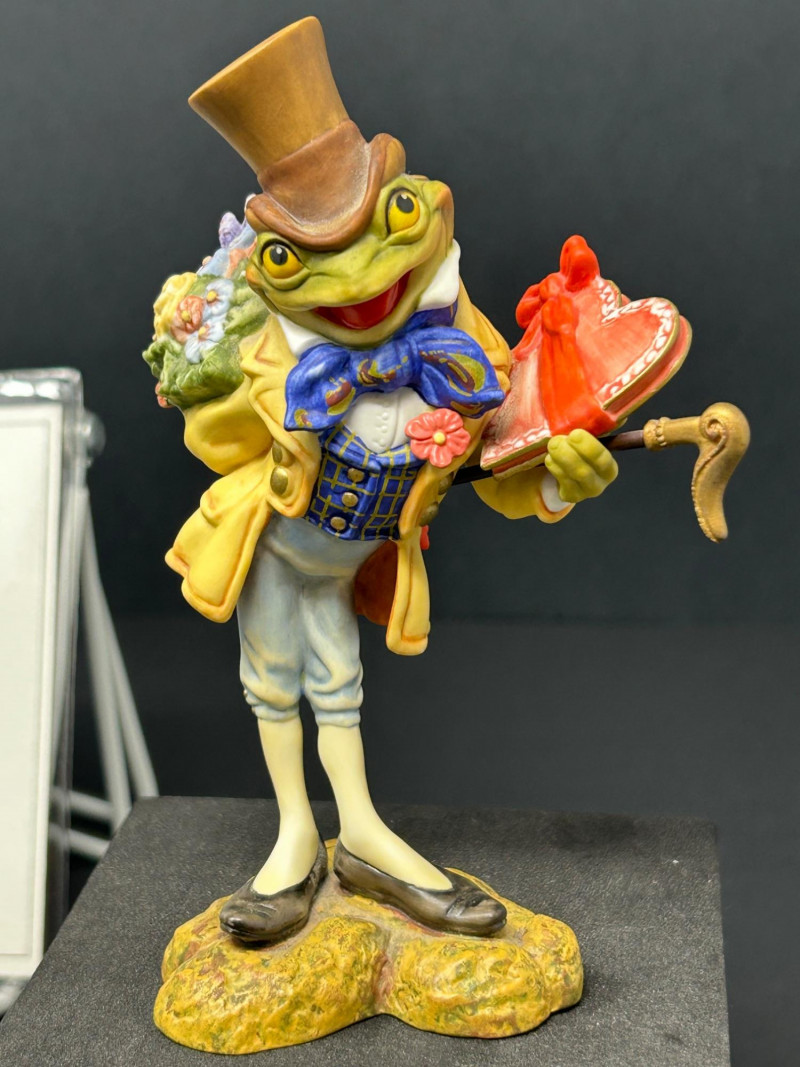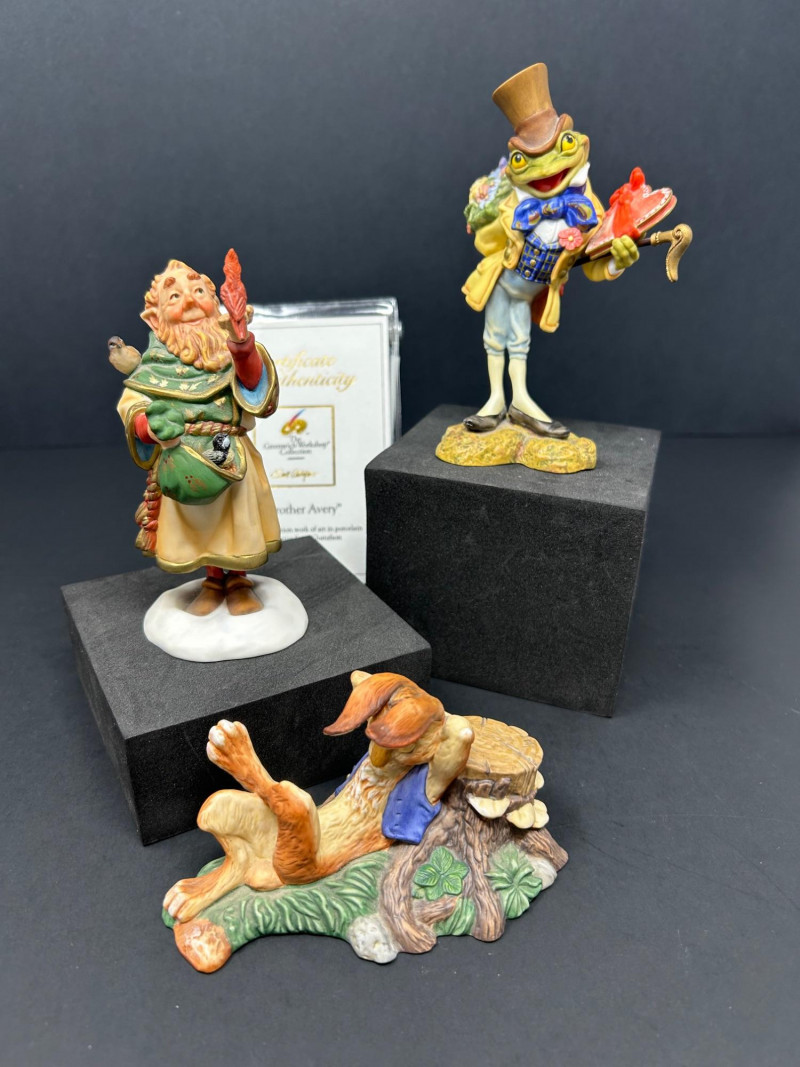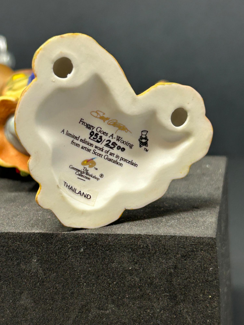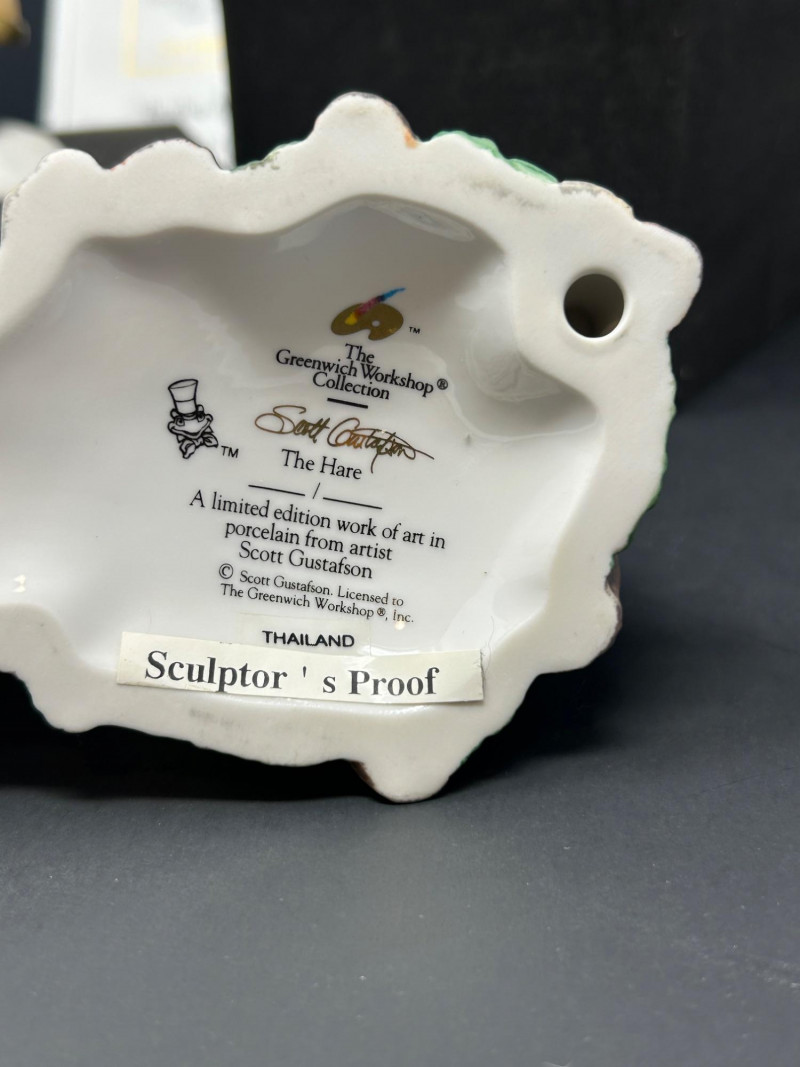 Charming limited-edition porcelain figurine group from Scott Gustafson, produced by The Greenwich Workshop. This whimsical trio brings Gustafson’s beloved storybook characters to life with rich hand-painted detail, expressive faces, and storybook color palettes. Included are: “Frog Goes A-Wooing” – A dapper frog in top hat and formal attire, captured mid-presentation with lively personality. Hand-numbered 953 / 2500. “Brother Avery” – A warm, kindly robed figure with bird companions, conveying gentle character and narrative charm. Hand-numbered 1095 / 2500 and accompanied by its Certificate of Authenticity. “The Hare” – A relaxed, storytelling pose rendered as a Sculptor’s Proof, a special pre-edition example prized by collectors. All pieces are marked to the underside, licensed to The Greenwich Workshop, and made in Thailand. A delightful display grouping for collectors of Scott Gustafson, fairy-tale imagery, and high-quality limited-edition porcelain. Artist: Scott Gustafson Collection: The Greenwich Workshop Collection Materials: Hand-painted porcelain Titles & Editions: Frog Goes A-Wooing — Limited Edition 953 / 2500 Brother Avery — Limited Edition 1095 / 2500 (with COA) The Hare — Sculptor’s Proof Marks: Artist signature, edition numbers, Greenwich Workshop markings Origin: ThailandDetails