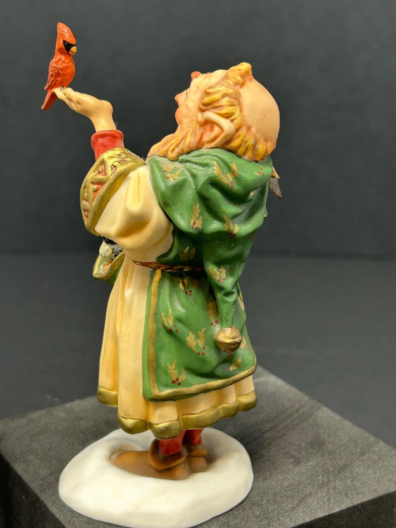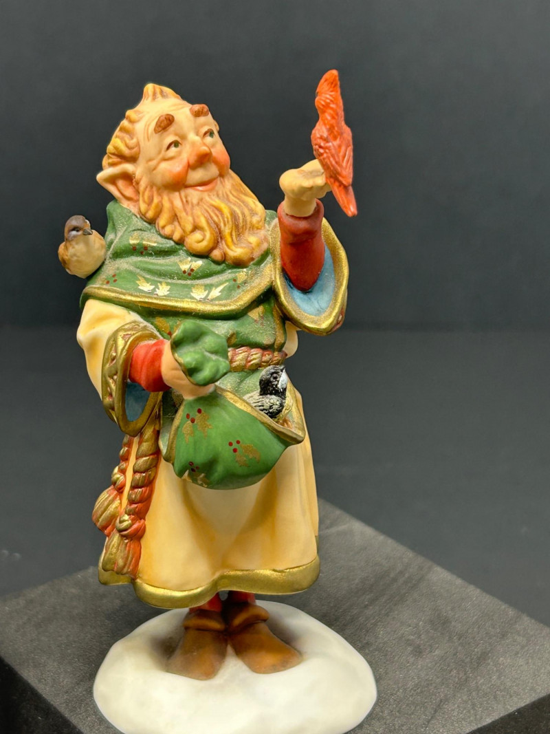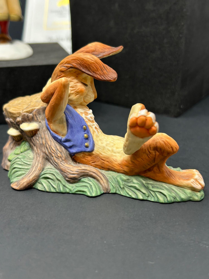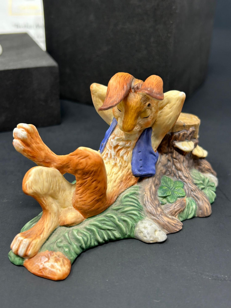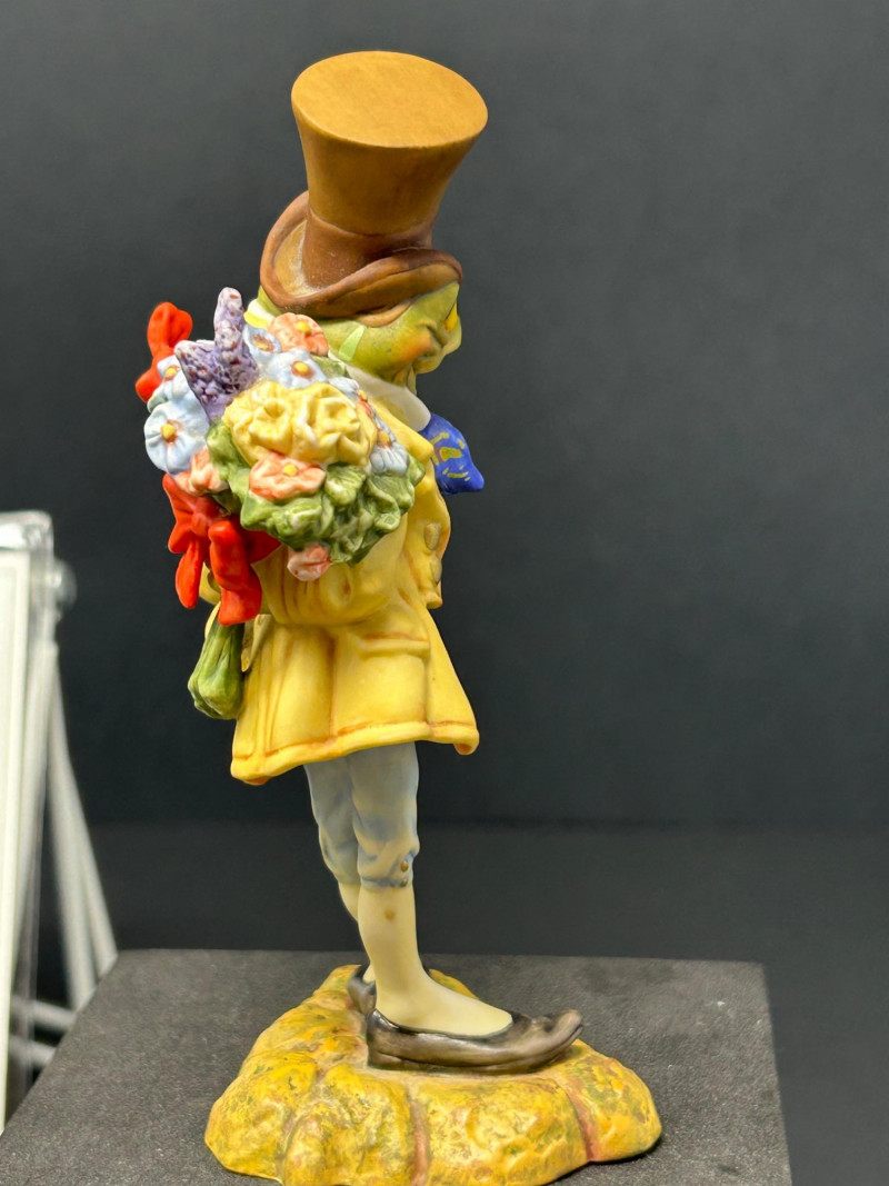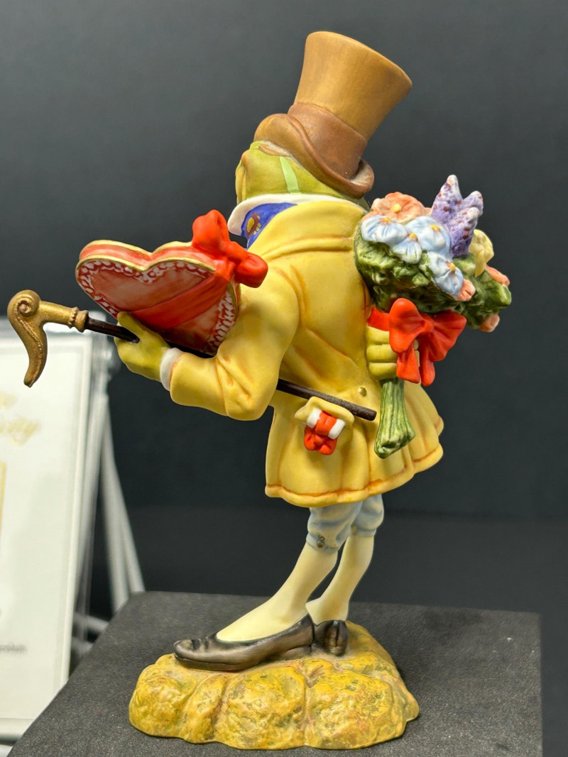 Charming limited-edition porcelain figurine group from Scott Gustafson, produced by The Greenwich Workshop. This whimsical trio brings Gustafson’s beloved storybook characters to life with rich hand-painted detail, expressive faces, and storybook color palettes. Included are: “Frog Goes A-Wooing” – A dapper frog in top hat and formal attire, captured mid-presentation with lively personality. Hand-numbered 953 / 2500. “Brother Avery” – A warm, kindly robed figure with bird companions, conveying gentle character and narrative charm. Hand-numbered 1095 / 2500 and accompanied by its Certificate of Authenticity. “The Hare” – A relaxed, storytelling pose rendered as a Sculptor’s Proof, a special pre-edition example prized by collectors. All pieces are marked to the underside, licensed to The Greenwich Workshop, and made in Thailand. A delightful display grouping for collectors of Scott Gustafson, fairy-tale imagery, and high-quality limited-edition porcelain. Artist: Scott Gustafson Collection: The Greenwich Workshop Collection Materials: Hand-painted porcelain Titles & Editions: Frog Goes A-Wooing — Limited Edition 953 / 2500 Brother Avery — Limited Edition 1095 / 2500 (with COA) The Hare — Sculptor’s Proof Marks: Artist signature, edition numbers, Greenwich Workshop markings Origin: ThailandDetails