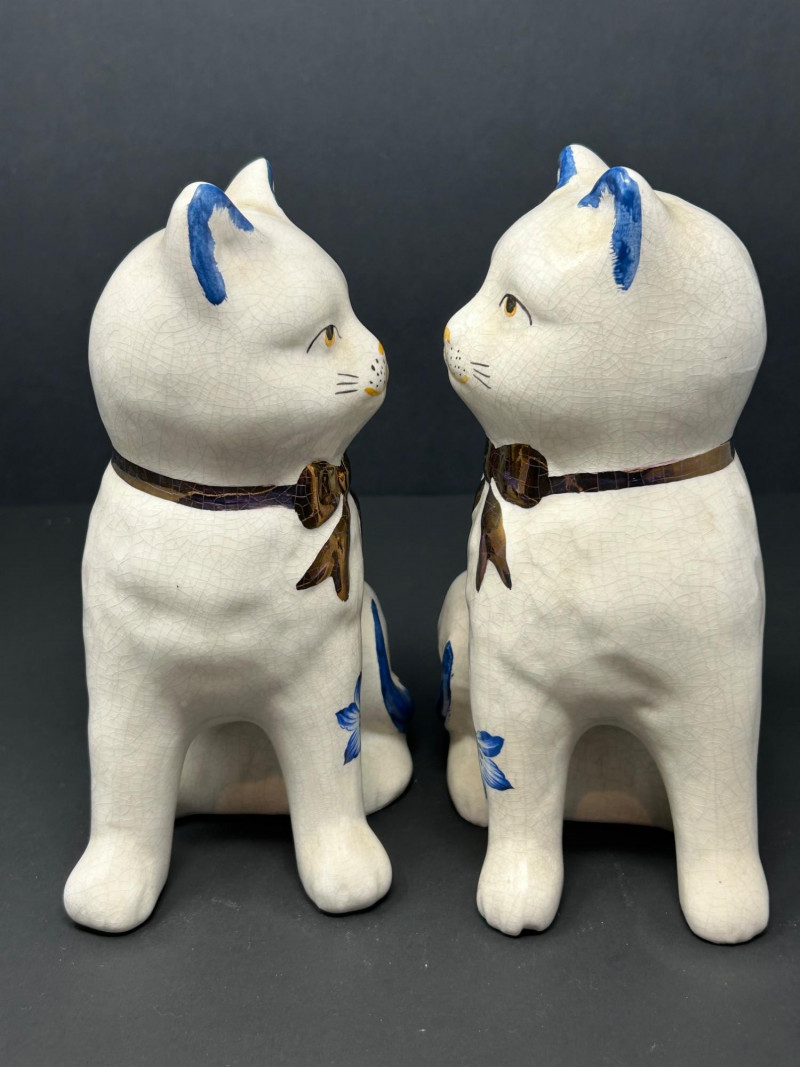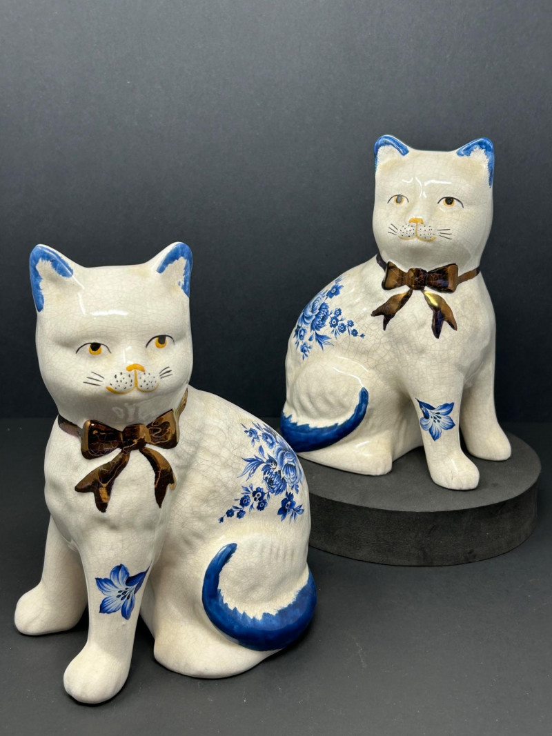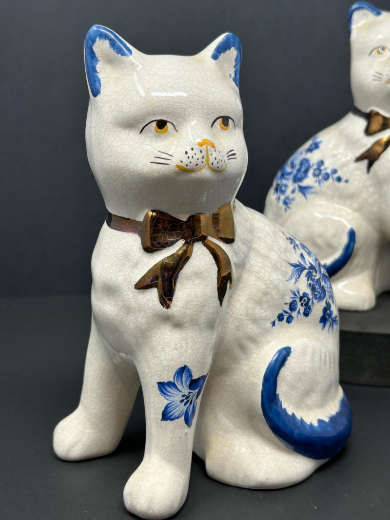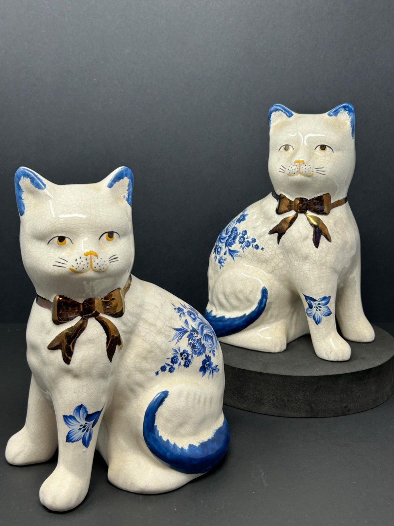 Charming decorative ceramic mantel cat figurines, likely inspired by traditional Staffordshire cat forms, featuring classic blue-and-white floral decoration with hand-painted details. Each seated cat displays a graceful posture with expressive facial features, yellow eyes and nose, blue-tipped ears and tail, and a glossy brown bow at the neck. The creamy white glaze shows an overall crackle finish, adding vintage character and visual appeal. Designed as a matching pair, these cats mirror one another and make a delightful display for a mantel, shelf, or sideboard. A lovely decorative set for cat lovers and collectors of Staffordshire-style ceramics. Attribution: Likely Staffordshire-style Item Type: Ceramic mantel cat figurines (pair) Decoration: Blue floral motifs with hand-painted accents Finish: Crackle-glazed ceramic Colors: Creamy white, cobalt blue, brown, yellow Quantity: 2 figurines Marks: Unmarked (see photos) Approximate Measurements (each): Height: ~8.5" Width/Depth: ~5"Details: