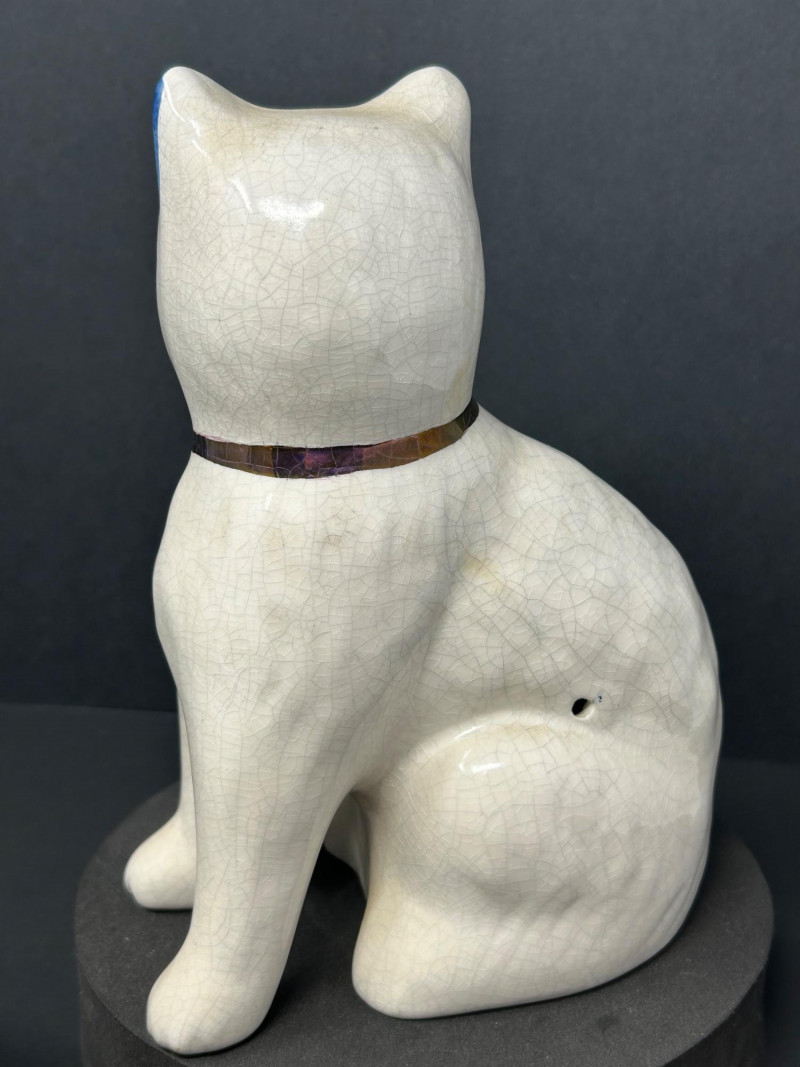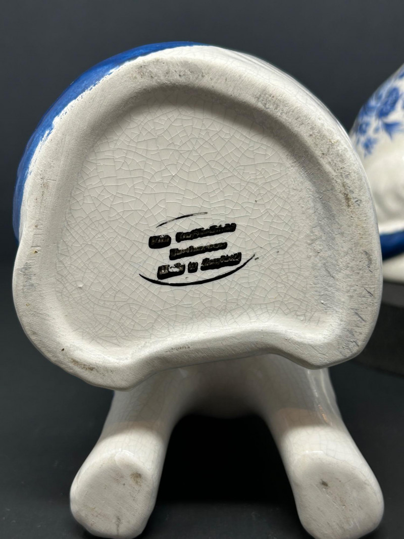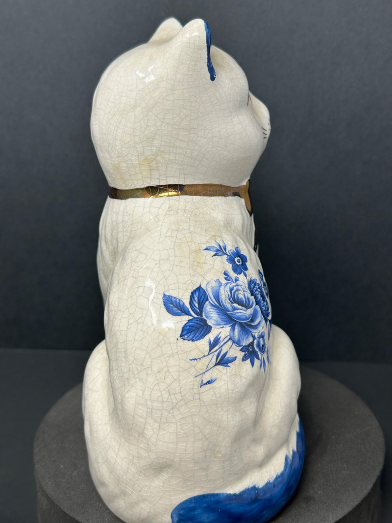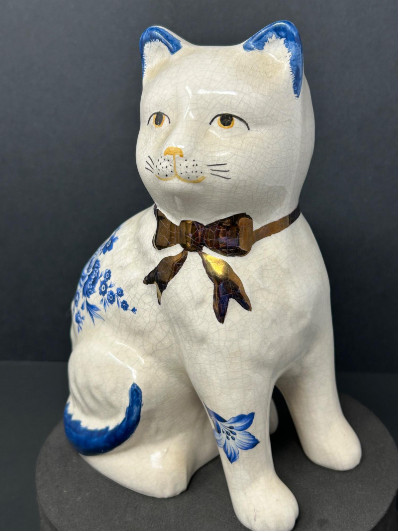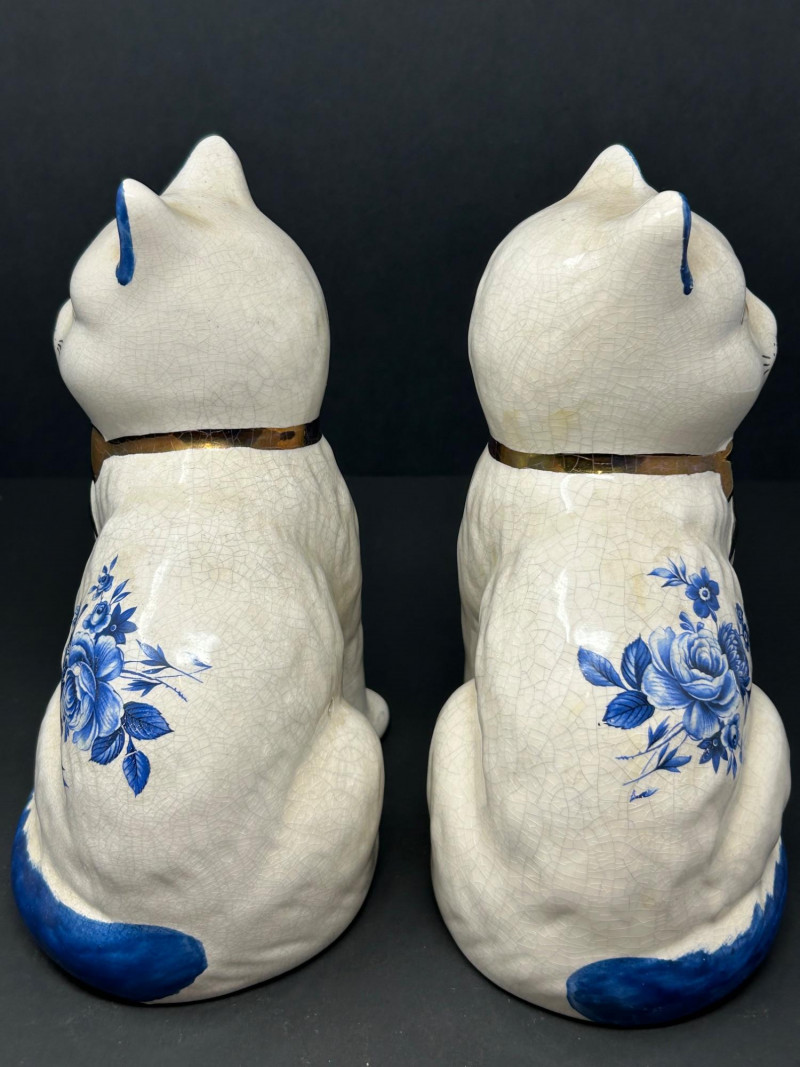 Charming decorative ceramic mantel cat figurines, likely inspired by traditional Staffordshire cat forms, featuring classic blue-and-white floral decoration with hand-painted details. Each seated cat displays a graceful posture with expressive facial features, yellow eyes and nose, blue-tipped ears and tail, and a glossy brown bow at the neck. The creamy white glaze shows an overall crackle finish, adding vintage character and visual appeal. Designed as a matching pair, these cats mirror one another and make a delightful display for a mantel, shelf, or sideboard. A lovely decorative set for cat lovers and collectors of Staffordshire-style ceramics. Attribution: Likely Staffordshire-style Item Type: Ceramic mantel cat figurines (pair) Decoration: Blue floral motifs with hand-painted accents Finish: Crackle-glazed ceramic Colors: Creamy white, cobalt blue, brown, yellow Quantity: 2 figurines Marks: Unmarked (see photos) Approximate Measurements (each): Height: ~8.5" Width/Depth: ~5"Details: