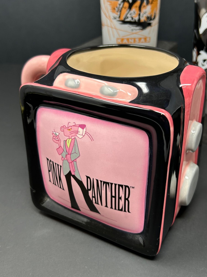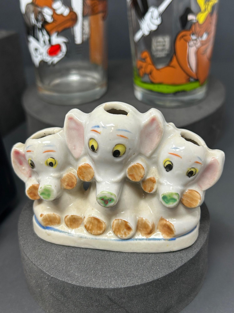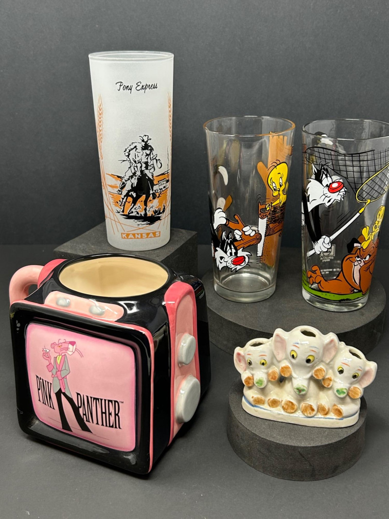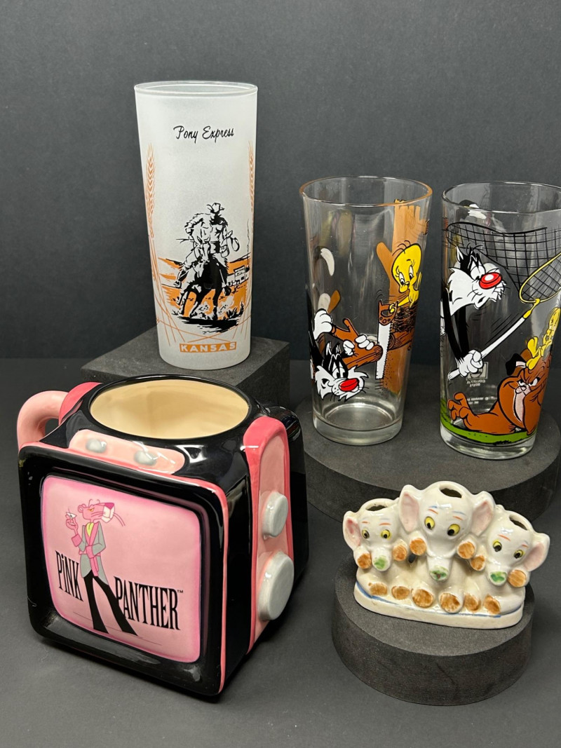 A curated group of mid-to-late 20th-century pop culture and souvenir collectibles, featuring a Pony Express – Kansasfrosted souvenir glass, a matched pair of Looney Tunes Pepsi Collector Series glasses from 1976, a whimsical Pink Panther television-style collector mug, and a charming vintage ceramic elephant toothpick holder marked Japan. Together, these pieces showcase classic American advertising, animation nostalgia, and mid-century novelty design, combining illustrated glassware, sculptural ceramics, and playful character imagery with strong visual appeal for display or collection. Theme: Pony Express Location: Kansas Date: Circa mid-20th century Dimensions: Approx. 7" H Material: Frosted glass Design: Cowboy on horseback with western landscape motif Style: Classic American travel souvenir Characters: Sylvester, Tweety & Tasmanian Devil Date: 1976 Dimensions: Approx. 6" H each Mark: Pepsi Collector Series Copyright: © Warner Bros. Inc. 1976 Material: Clear illustrated glass Style: Vintage soda advertising / animation memorabilia Character: The Pink Panther Maker: Vandor, SLC, UT Date: 2001 Dimensions: Approx. 4.75" H Marking: TV Collector Mugs – To Be Retired 2001 Material: Glazed ceramic Design: Television-shaped mug with screen graphic Origin: Japan Date: Mid-20th century Dimensions: Approx. 2.5" H x 3.25" W Material: Glazed ceramic Design: Trio of elephants with multiple openings for toothpicks Style: Novelty figural tablewareItem Details: