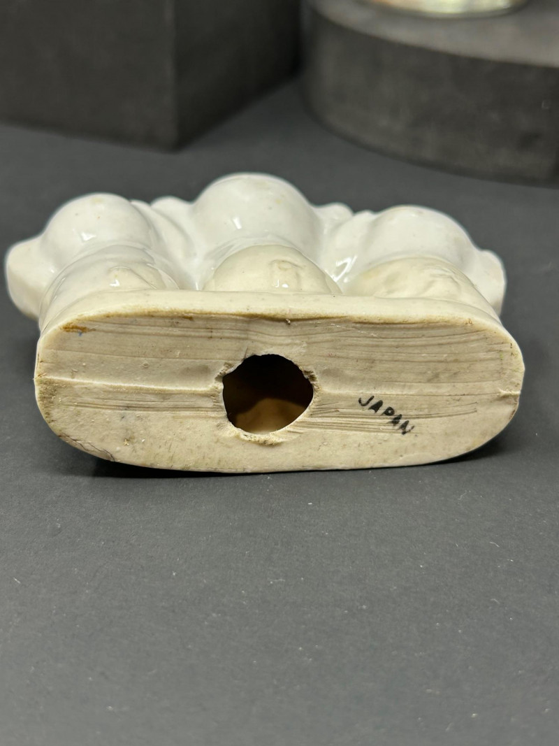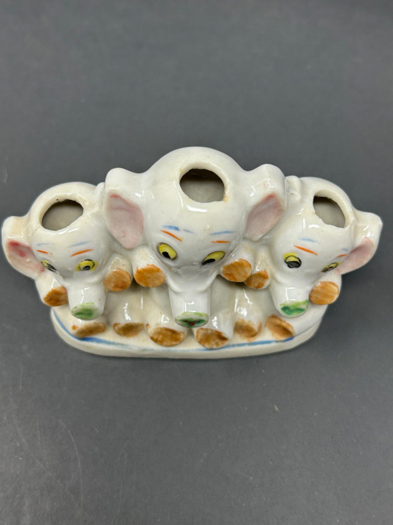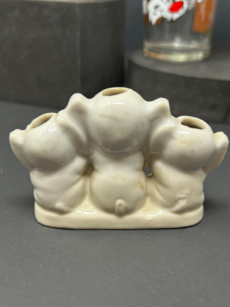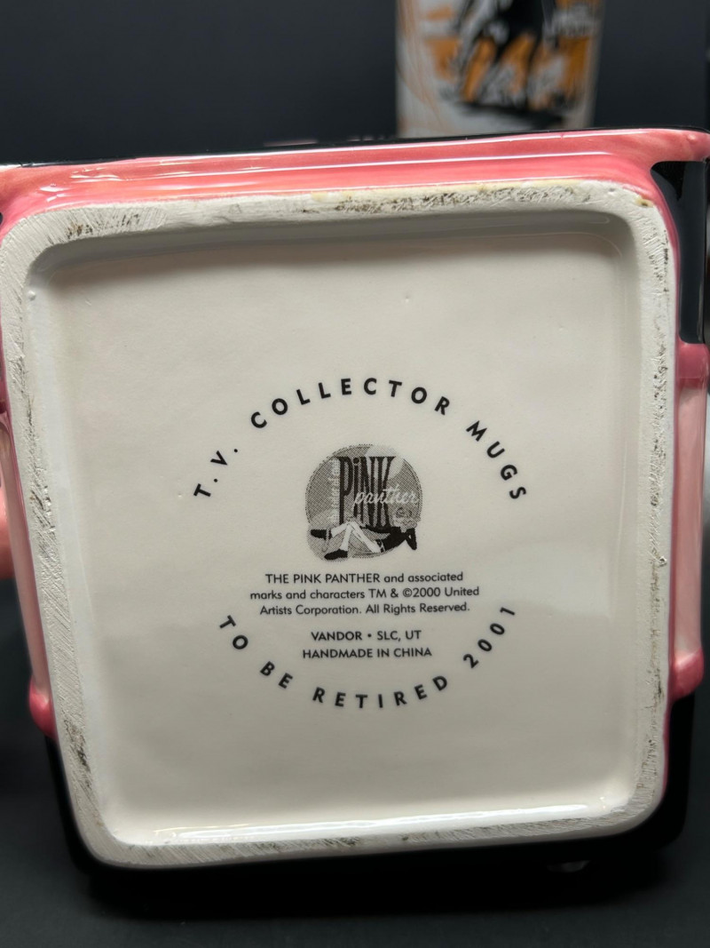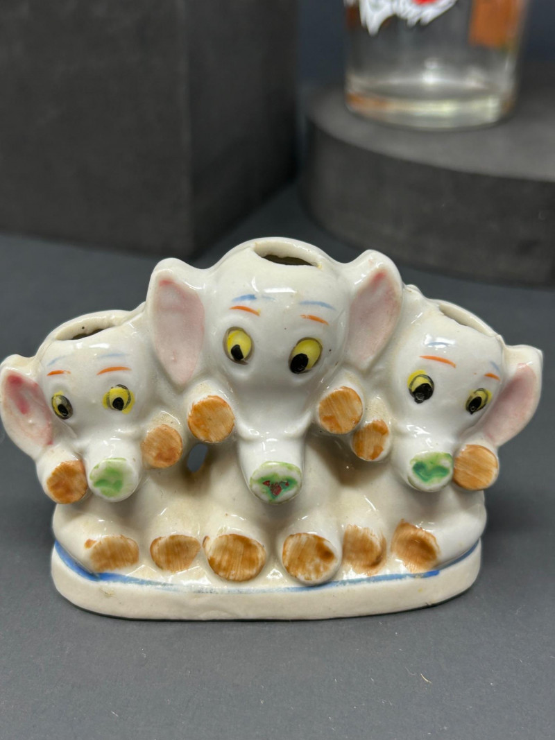 A curated group of mid-to-late 20th-century pop culture and souvenir collectibles, featuring a Pony Express – Kansasfrosted souvenir glass, a matched pair of Looney Tunes Pepsi Collector Series glasses from 1976, a whimsical Pink Panther television-style collector mug, and a charming vintage ceramic elephant toothpick holder marked Japan. Together, these pieces showcase classic American advertising, animation nostalgia, and mid-century novelty design, combining illustrated glassware, sculptural ceramics, and playful character imagery with strong visual appeal for display or collection. Theme: Pony Express Location: Kansas Date: Circa mid-20th century Dimensions: Approx. 7" H Material: Frosted glass Design: Cowboy on horseback with western landscape motif Style: Classic American travel souvenir Characters: Sylvester, Tweety & Tasmanian Devil Date: 1976 Dimensions: Approx. 6" H each Mark: Pepsi Collector Series Copyright: © Warner Bros. Inc. 1976 Material: Clear illustrated glass Style: Vintage soda advertising / animation memorabilia Character: The Pink Panther Maker: Vandor, SLC, UT Date: 2001 Dimensions: Approx. 4.75" H Marking: TV Collector Mugs – To Be Retired 2001 Material: Glazed ceramic Design: Television-shaped mug with screen graphic Origin: Japan Date: Mid-20th century Dimensions: Approx. 2.5" H x 3.25" W Material: Glazed ceramic Design: Trio of elephants with multiple openings for toothpicks Style: Novelty figural tablewareItem Details: