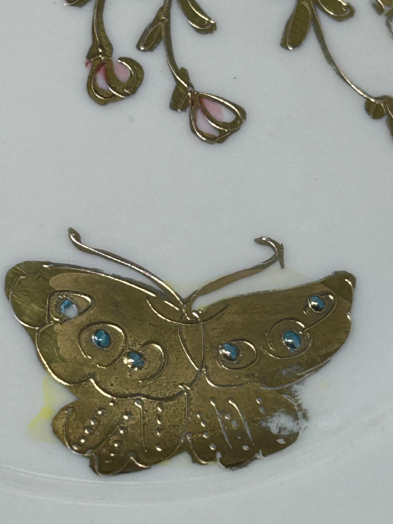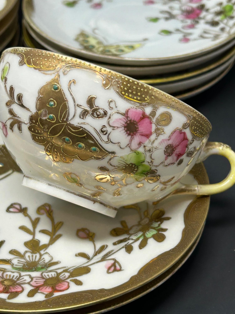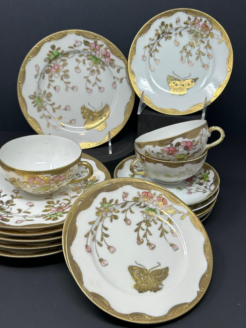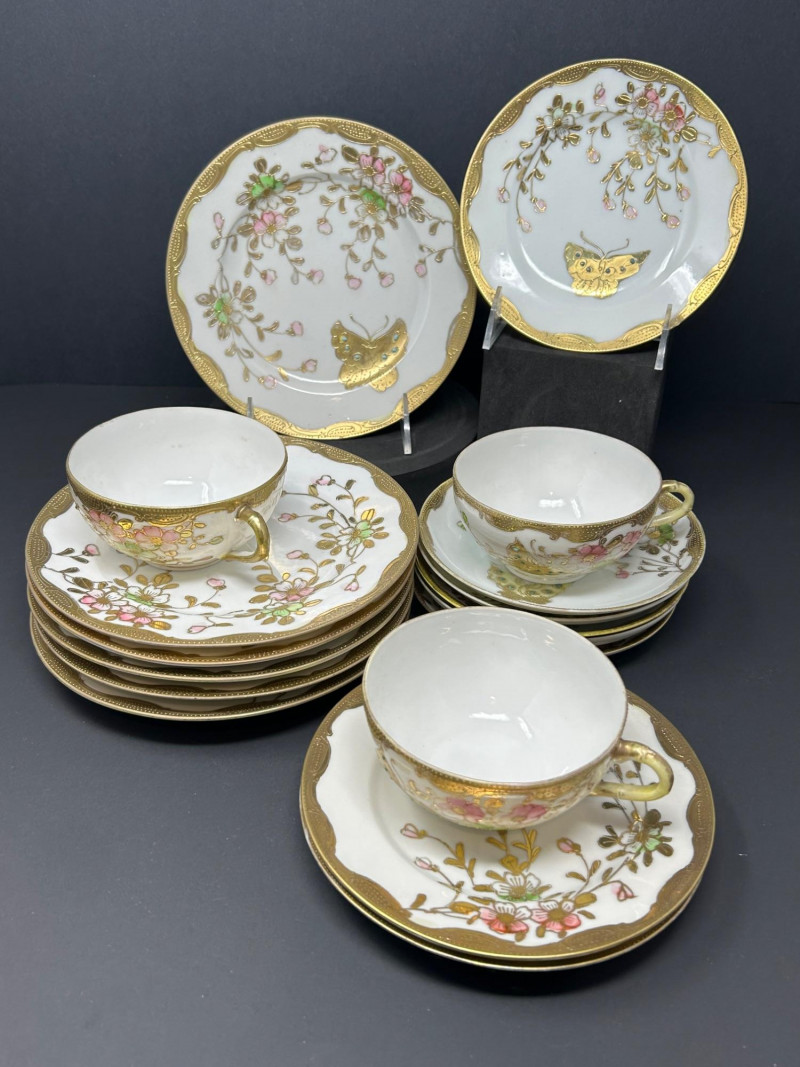 Elegant mid-century Japanese porcelain featuring a graceful butterfly and floral motif accented with raised gold gilt. This coordinated lot showcases scalloped rims, ornate gold borders, and soft pastel enamel details, reflecting classic Japanese export craftsmanship.Each piece displays delicate floral sprays in pink and green with a prominent butterfly accent, enhanced by textured gold detailing along the rims and handles. The overall presentation is cohesive and decorative, making this set ideal for display, collecting, or elegant entertaining. (6) Plates – approx. 7" across (3) Plates – approx. 6" across (5) Saucers – approx. 5.5" across (3) Cups – approx. 4" across Origin: Japan Marking: “Made in Japan” Decoration: Butterfly & floral motif with raised gold gilt Rim Style: Scalloped with ornate gold edging Era: Mid-20th century (approx.)Lot Includes & Measurements: