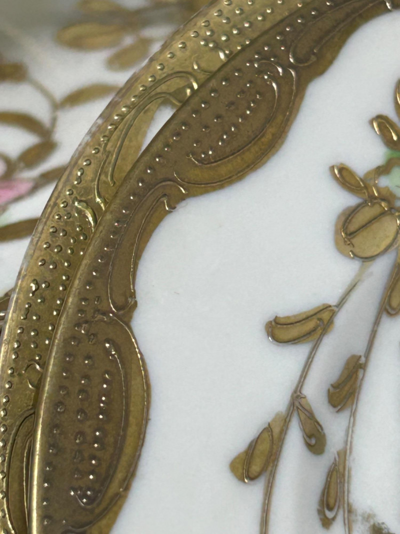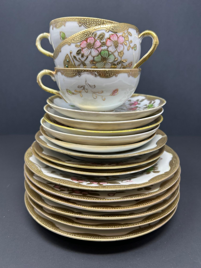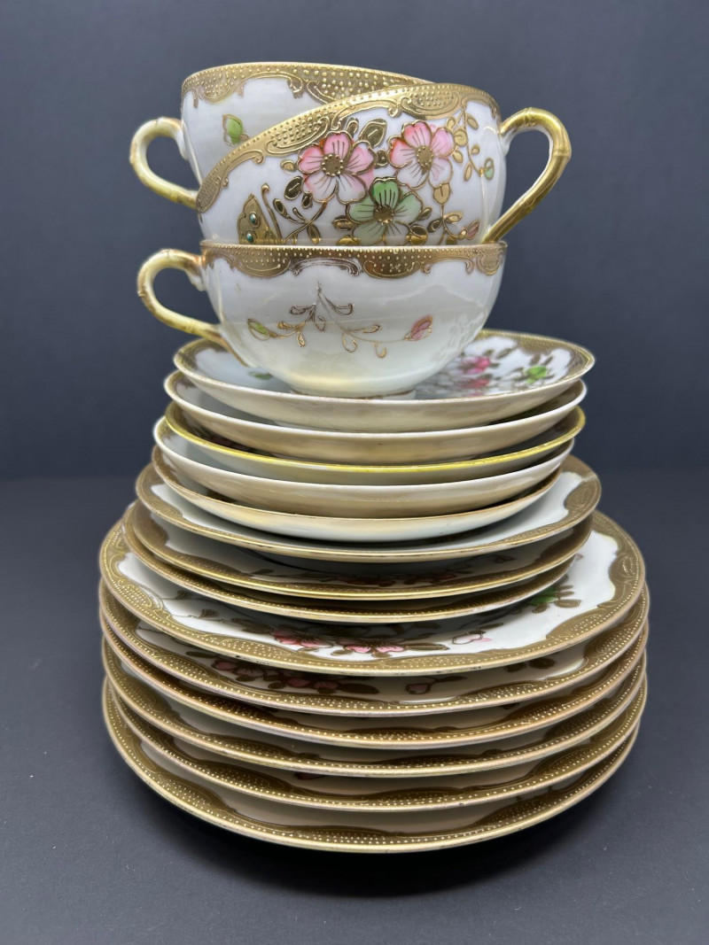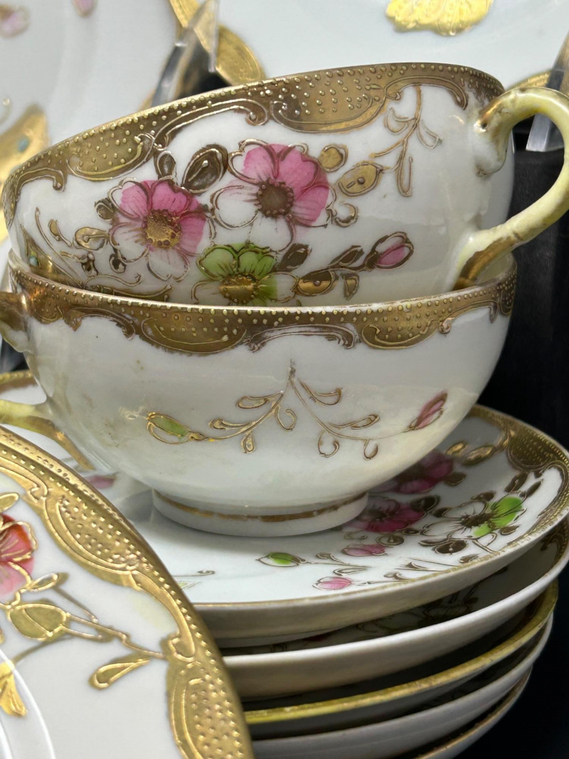 Elegant mid-century Japanese porcelain featuring a graceful butterfly and floral motif accented with raised gold gilt. This coordinated lot showcases scalloped rims, ornate gold borders, and soft pastel enamel details, reflecting classic Japanese export craftsmanship.Each piece displays delicate floral sprays in pink and green with a prominent butterfly accent, enhanced by textured gold detailing along the rims and handles. The overall presentation is cohesive and decorative, making this set ideal for display, collecting, or elegant entertaining. (6) Plates – approx. 7" across (3) Plates – approx. 6" across (5) Saucers – approx. 5.5" across (3) Cups – approx. 4" across Origin: Japan Marking: “Made in Japan” Decoration: Butterfly & floral motif with raised gold gilt Rim Style: Scalloped with ornate gold edging Era: Mid-20th century (approx.)Lot Includes & Measurements: