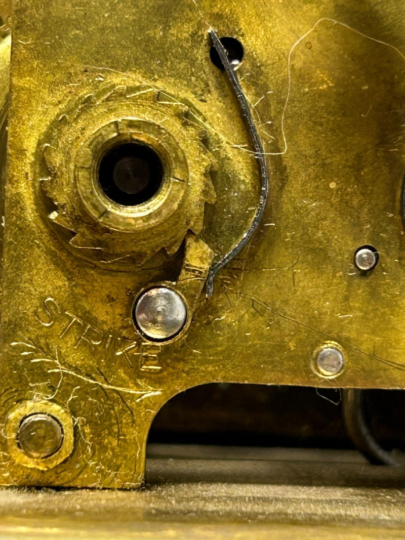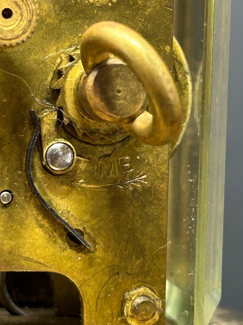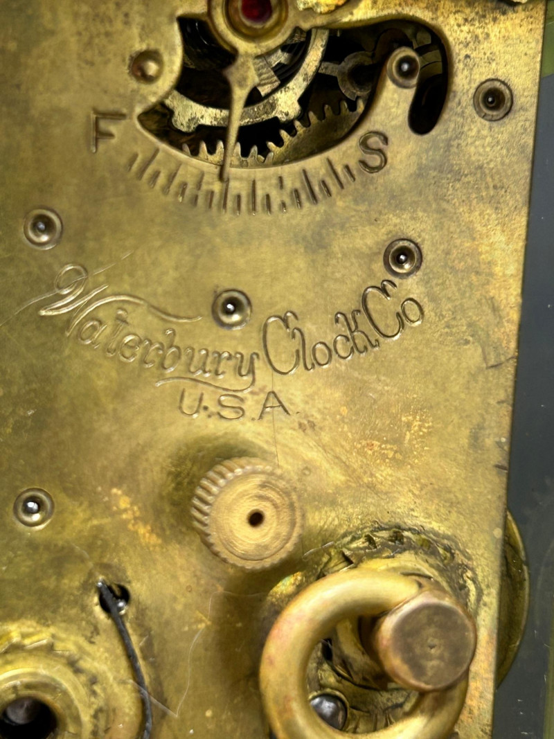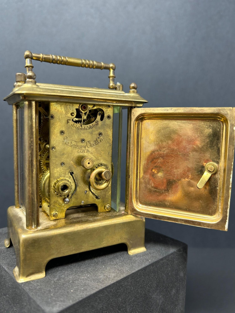 This elegant antique Waterbury carriage clock features a classic brass case with beveled glass panels on all sides, showcasing the original mechanical movement within. The clock retains its swing handle top, hinged rear door, and white enamel dial with bold black Arabic numerals and blued steel hands. The movement is clearly stamped “Waterbury Clock Co., U.S.A.”, and the rear door bears multiple patent dates ranging from 1889 to 1891, firmly placing this piece in the late 19th century. The visible escapement, regulator markings, and period-correct hardware reflect Waterbury’s reputation for quality American clockmaking during this era. A beautiful decorative and collectible timepiece, ideal for antique clock collectors, mantle or desk display, or historical décor. Details: Maker: Waterbury Clock Company Origin: United States Era: Late 19th Century (Patents dated 1889–1891) Style: Carriage / Shelf Clock Case: Brass with glass panels (front, sides, and rear) Dial: White enamel with black Arabic numerals Movement: Mechanical, key-wind Markings: Movement stamped “Waterbury Clock Co. U.S.A.” Rear door stamped with patent dates: Mar. 19, 1889 May 6, 1890 Dec. 23, 1890 Jan. 13, 1891 Features: Hinged rear access door Adjustable regulator Top carry handle