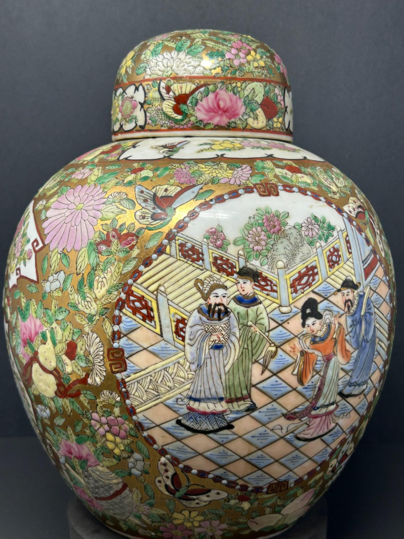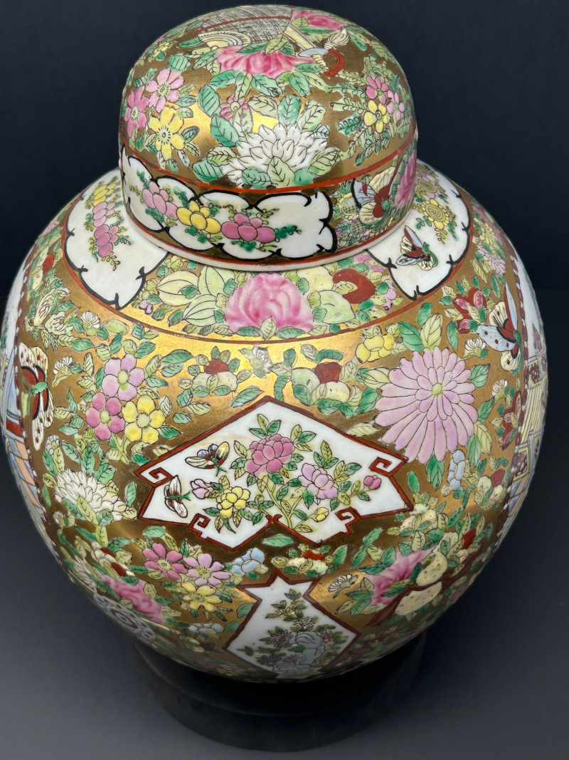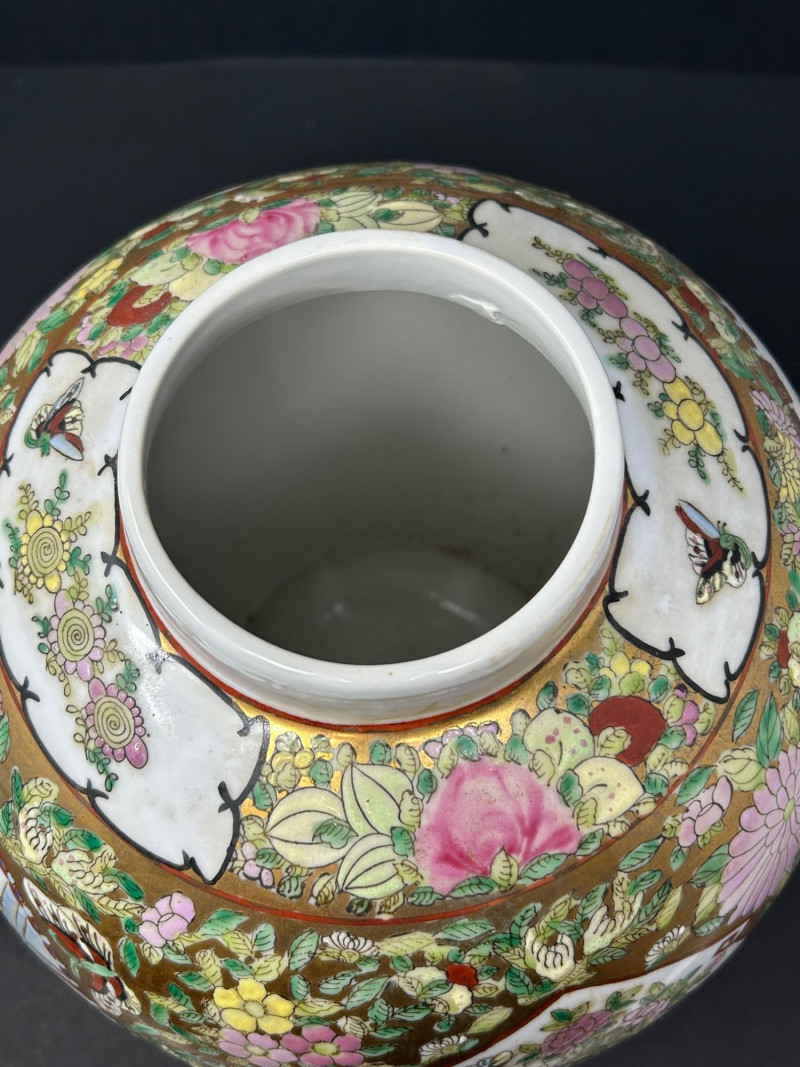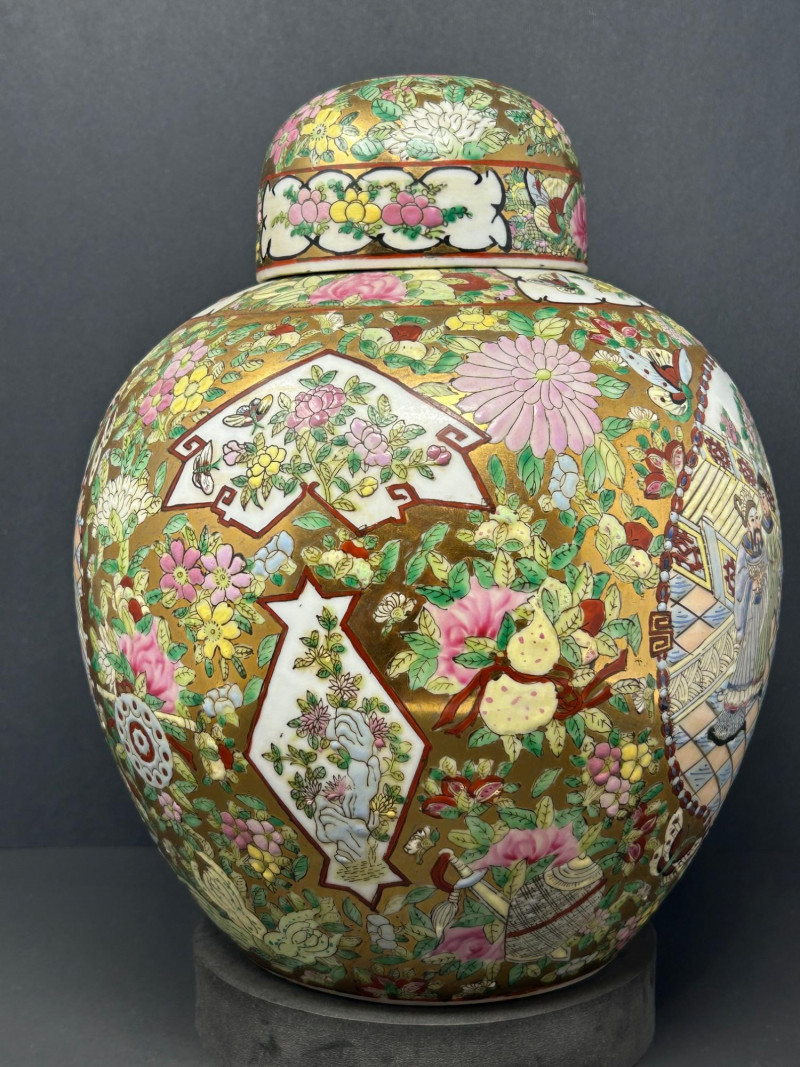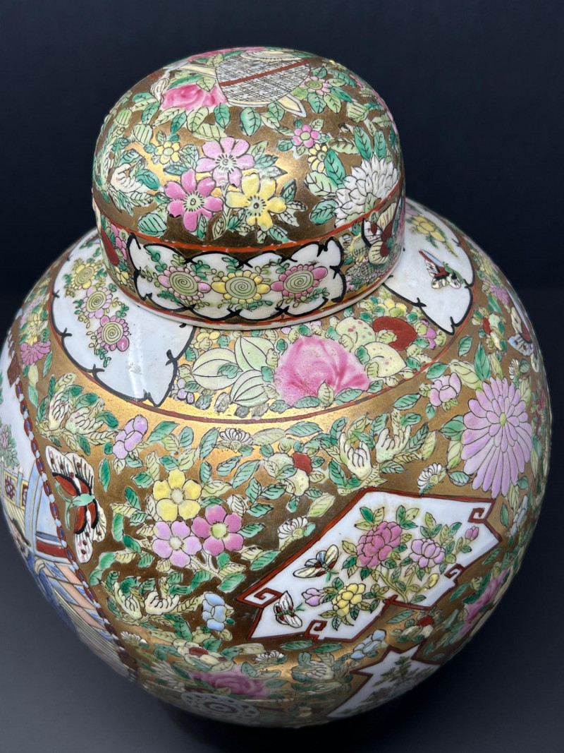 Impressive large vintage Chinese ginger jar decorated in the classic Rose Medallion style, featuring finely painted figural court scenes framed by dense floral panels, butterflies, and auspicious motifs. The vibrant famille rose–style enamels are set against a rich gilt ground, giving the jar strong visual depth and presence. The domed, fitted lid is decorated en suite, completing the traditional ginger jar form. The soft pastel palette, hand-painted details, and gently worn gilding reflect age and add to its decorative appeal. A striking statement piece for display, collection, or traditional Asian-inspired décor. 9.5' wide, 6" wide at bottom, 12" tall Origin: China Item Type: Ginger jar with lid Style: Rose Medallion–style Decoration: Famille rose–style polychrome enamels with gilt ground Motifs: Figural court scenes, florals, butterflies, symbolic elements Markings: Red seal mark on base (unverified) Lid: Matching domed lidDetails: