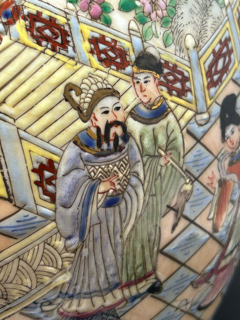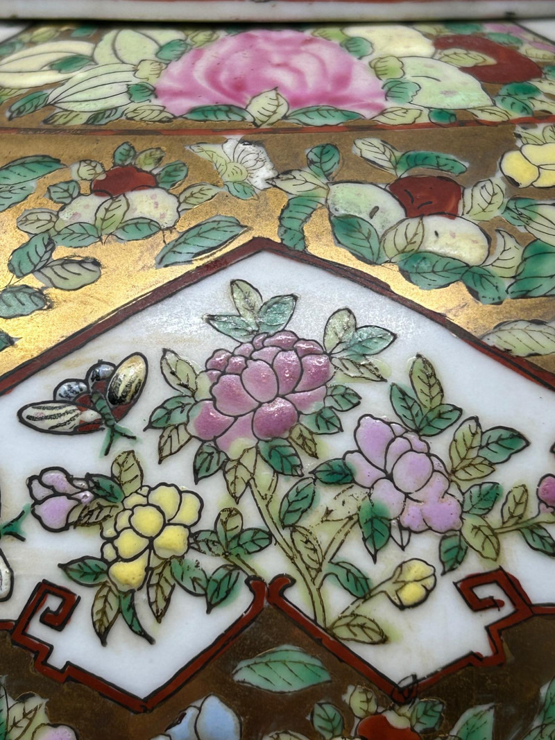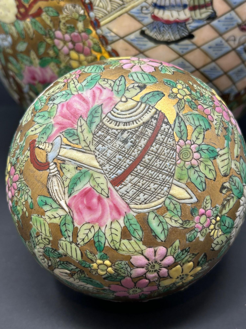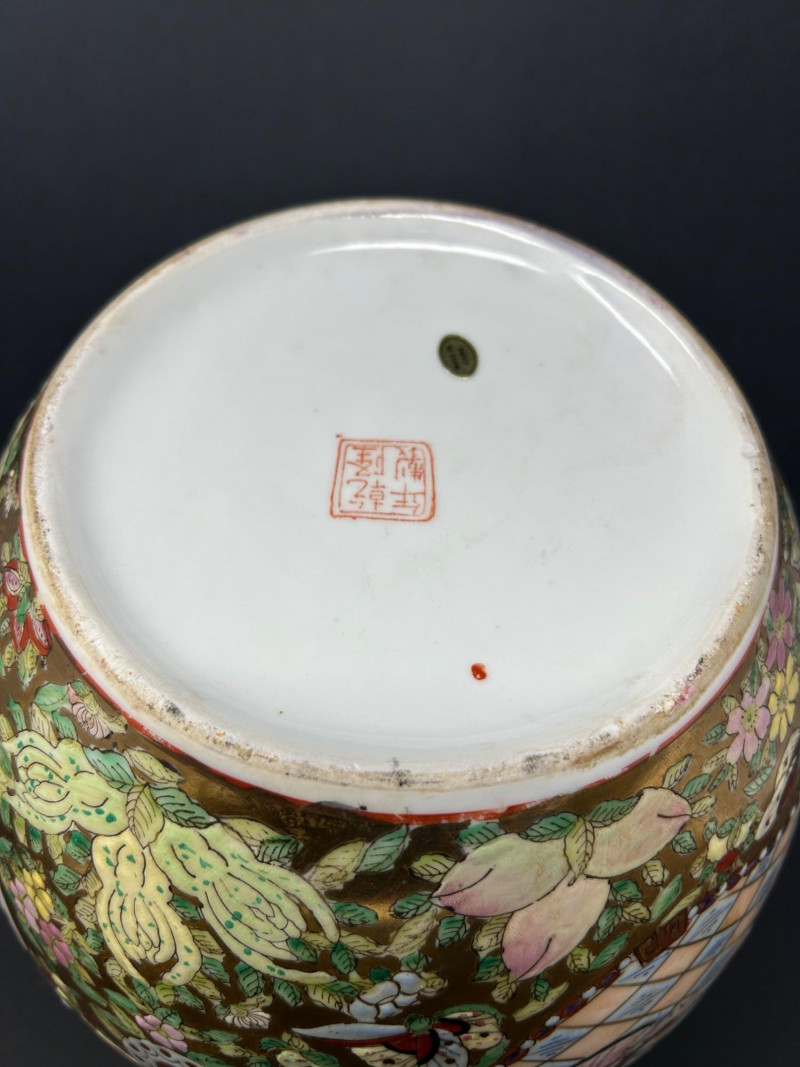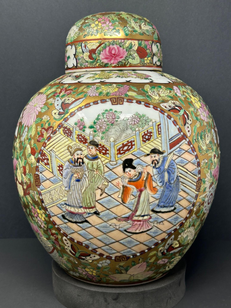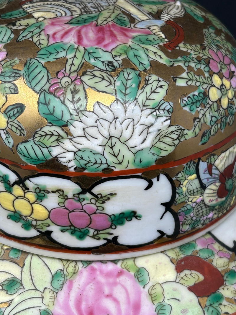 Impressive large vintage Chinese ginger jar decorated in the classic Rose Medallion style, featuring finely painted figural court scenes framed by dense floral panels, butterflies, and auspicious motifs. The vibrant famille rose–style enamels are set against a rich gilt ground, giving the jar strong visual depth and presence. The domed, fitted lid is decorated en suite, completing the traditional ginger jar form. The soft pastel palette, hand-painted details, and gently worn gilding reflect age and add to its decorative appeal. A striking statement piece for display, collection, or traditional Asian-inspired décor. 9.5' wide, 6" wide at bottom, 12" tall Origin: China Item Type: Ginger jar with lid Style: Rose Medallion–style Decoration: Famille rose–style polychrome enamels with gilt ground Motifs: Figural court scenes, florals, butterflies, symbolic elements Markings: Red seal mark on base (unverified) Lid: Matching domed lidDetails: