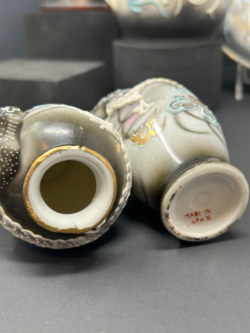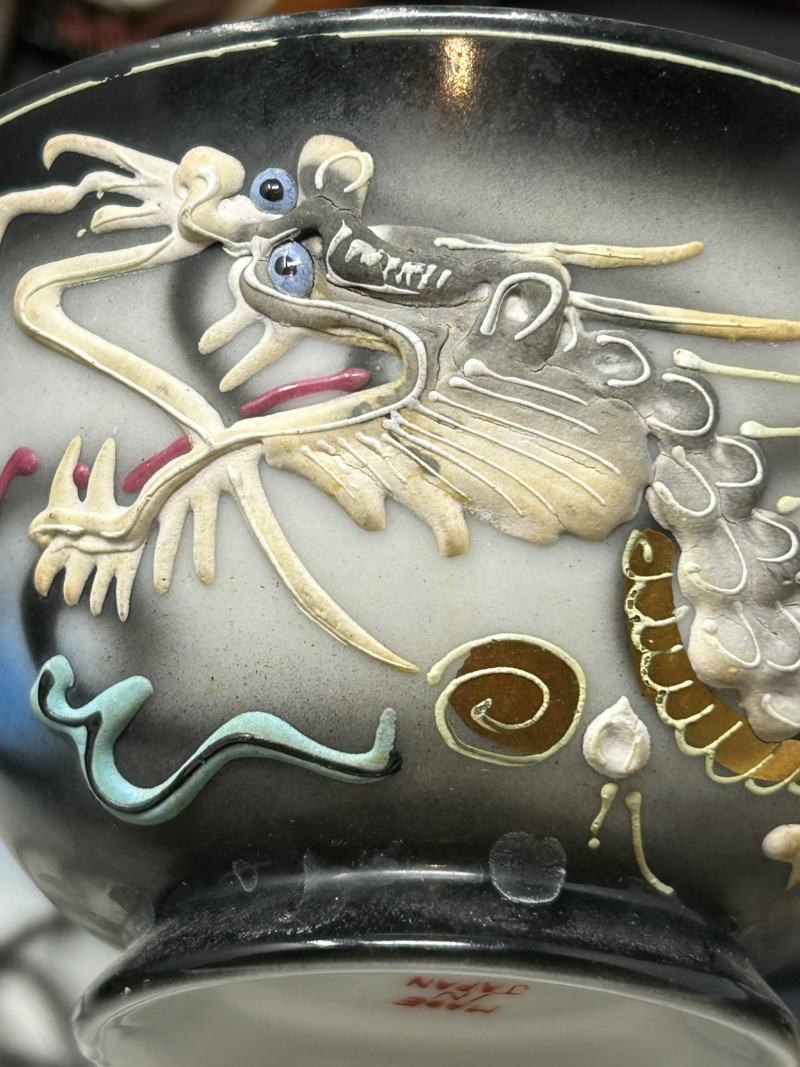 An impressive vintage Japanese moriage porcelain collection, featuring hand-painted raised dragon motifs with flowing enamel accents and gold highlights. The dramatic dragons are rendered in sculptural moriage relief, creating strong texture and visual depth across the entire group. Finished in smoky gradients of charcoal, blue, and warm amber tones, this cohesive set reflects classic mid-20th-century Japanese export craftsmanship. Multiple pieces are marked “Hand Painted – Made in Japan,” confirming origin and technique. An eye-catching display group ideal for collectors of Japanese ceramics, dragon imagery, moriage ware, or bold vintage tea and decorative sets. Teapot Sugar Bowl with Lid Creamer Large Teacup & Saucer Small Teacups with Saucers Decorative Vases Decorative Plate Teapot: 7" tall, 6.5" across Sugar Bowl: 4" tall, 6" across Creamer: 3" tall Large Teacup: 2" tall, 3.5" wide Large Saucer: 5.5" across Vases: 4" tall each Decorative Plate: 6.5" acrossLot Includes:
