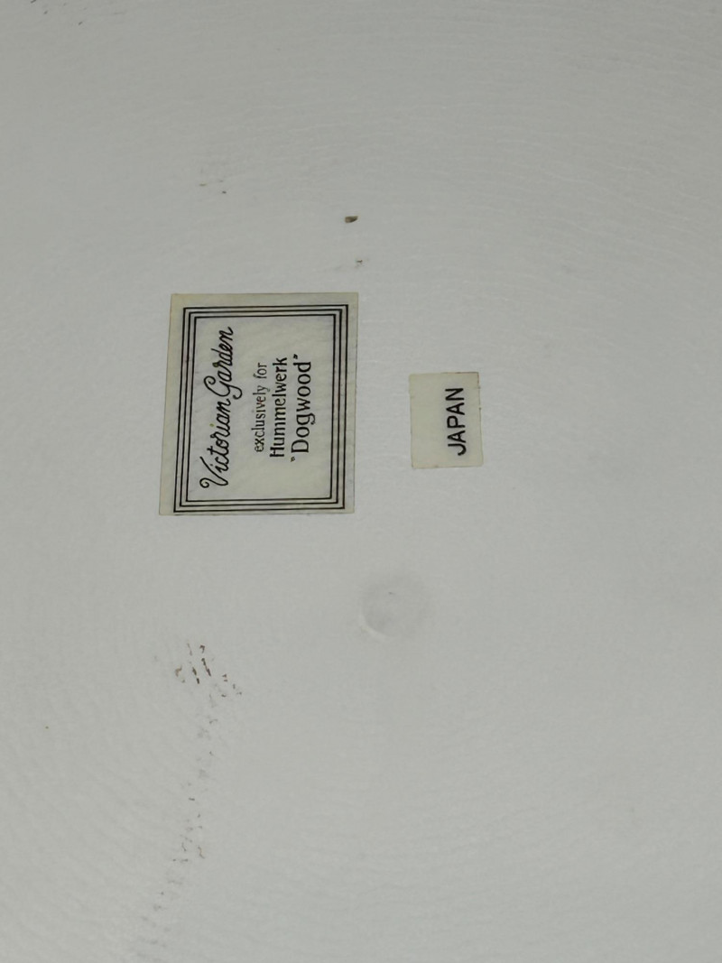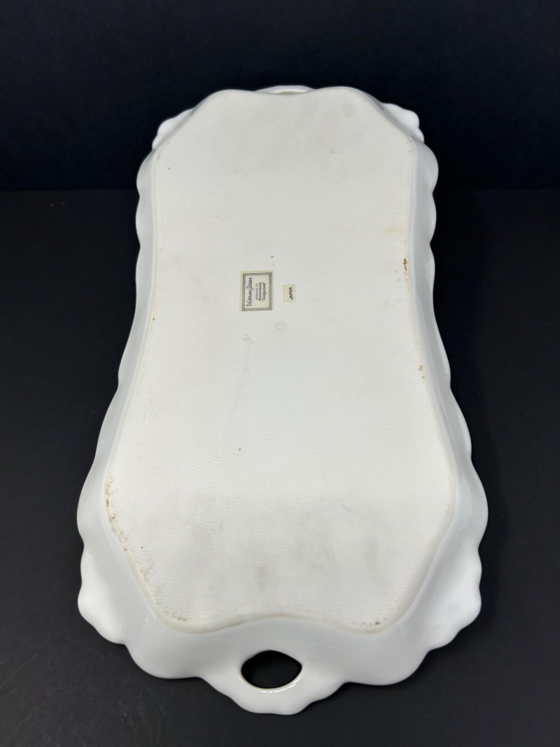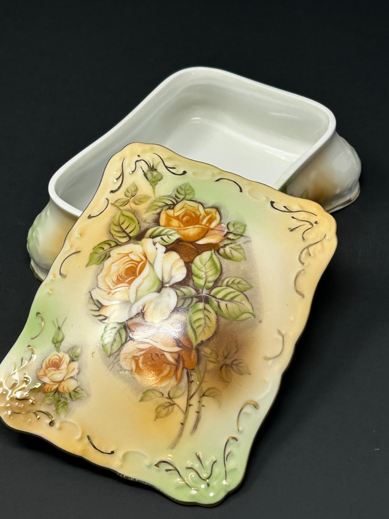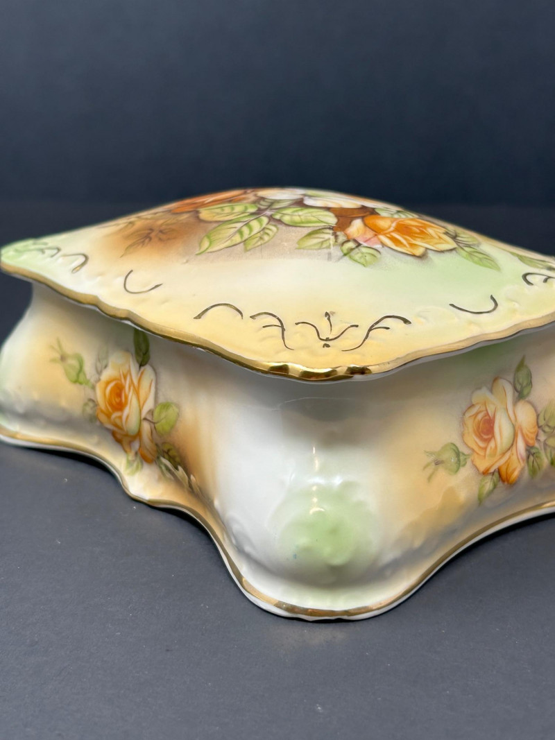 An elegant vintage porcelain vanity set consisting of a handled dresser tray, a lidded powder jar with metal lid, and a matching lidded trinket box, all decorated in a soft ivory glaze with hand-painted floral motifs and molded scrollwork. The gently shaded peach, pink, and green blossoms, scalloped rims, and curving forms reflect a Victorian revival aesthetic inspired by R.S. Prussia–style porcelain. Produced in Japan during the mid-20th century, this coordinated trio represents decorative vanity ware made in homage to earlier European porcelain styles. The powder jar’s fitted metal lid further evokes the look of earlier silverplate-mounted milk glass jars, while the porcelain forms and decoration remain distinctly vintage Japanese export pieces. A cohesive and attractive set ideal for display on a dressing table, vanity, or as part of a curated vintage porcelain collection. Form: Vanity / dresser tray with integrated handles Date: Vintage, mid-20th century Dimensions: Approx. 11" L x 7½" W Mark: Paper label reading “Victorian Garden – exclusively for Hummelwerk Dogswood – Japan” Color / Finish: Ivory glaze with hand-painted florals, raised molded accents, scalloped rim Style: Victorian revival / R.S. Prussia–inspired Form: Vanity powder jar Date: Vintage, mid-20th century Dimensions: Approx. 6" H (with lid) x 5" diameter Lid: Decorative metal lid with aged patina Color / Finish: Shaded ivory porcelain with hand-painted floral decoration Style: Victorian revival / reproduction style Form: Covered trinket or jewelry box Date: Vintage, mid-20th century Dimensions: Approx. 5" W x 3" H Color / Finish: Softly shaded porcelain with rose motif, scalloped edges, and light gilt accents Style: R.S. Prussia–style reproductionItem Details: