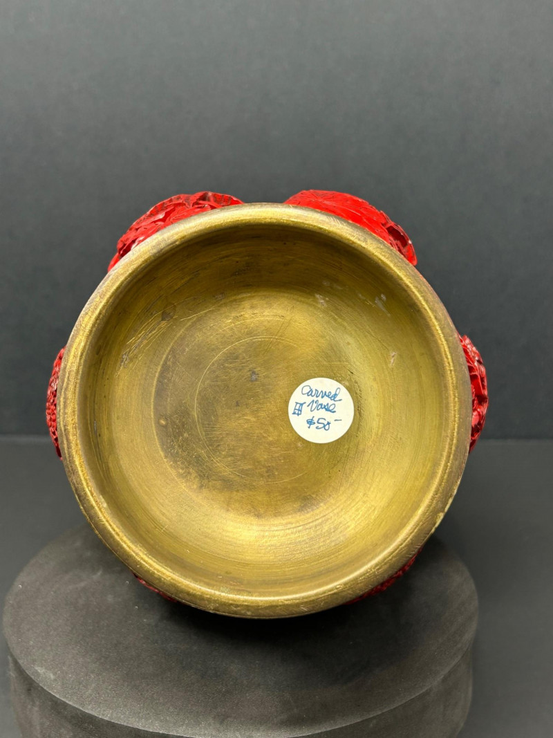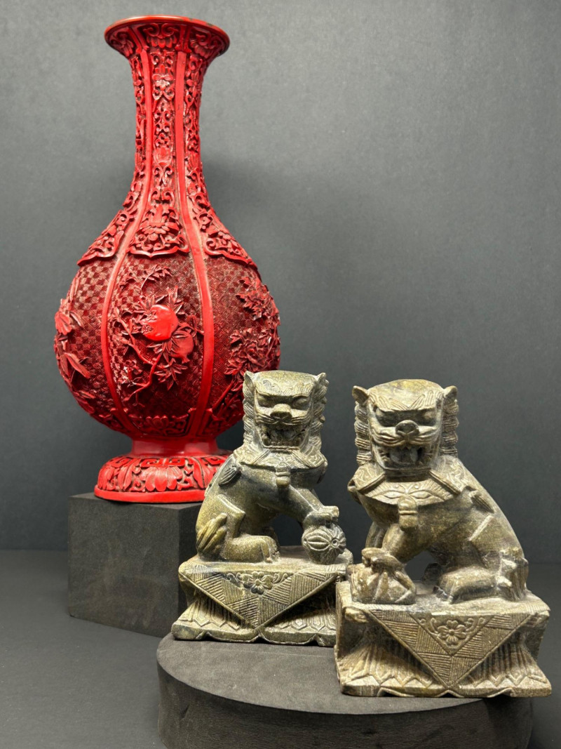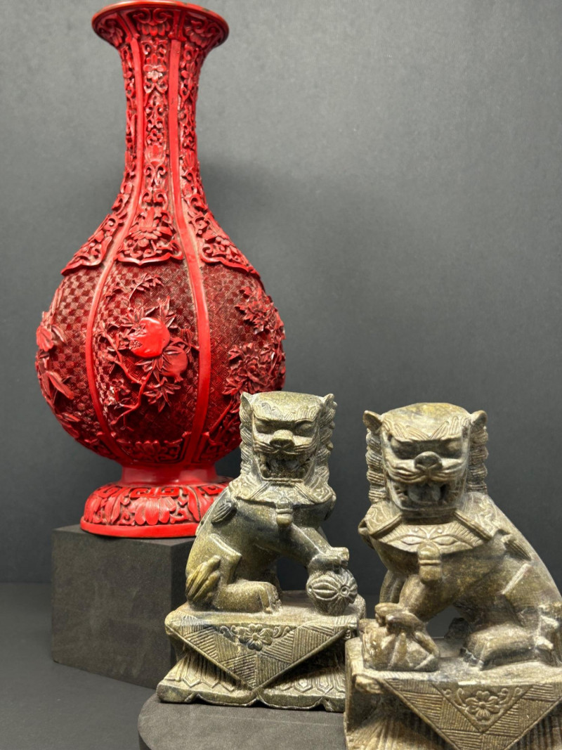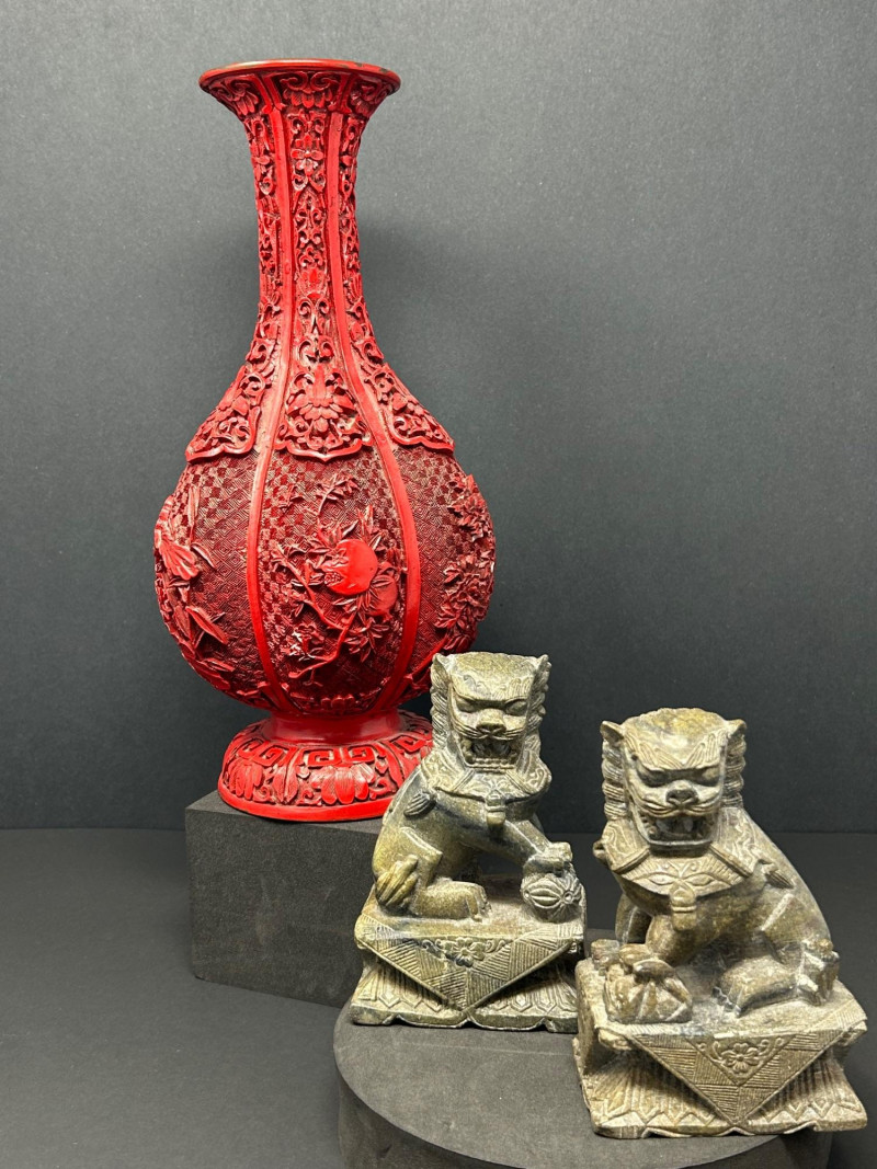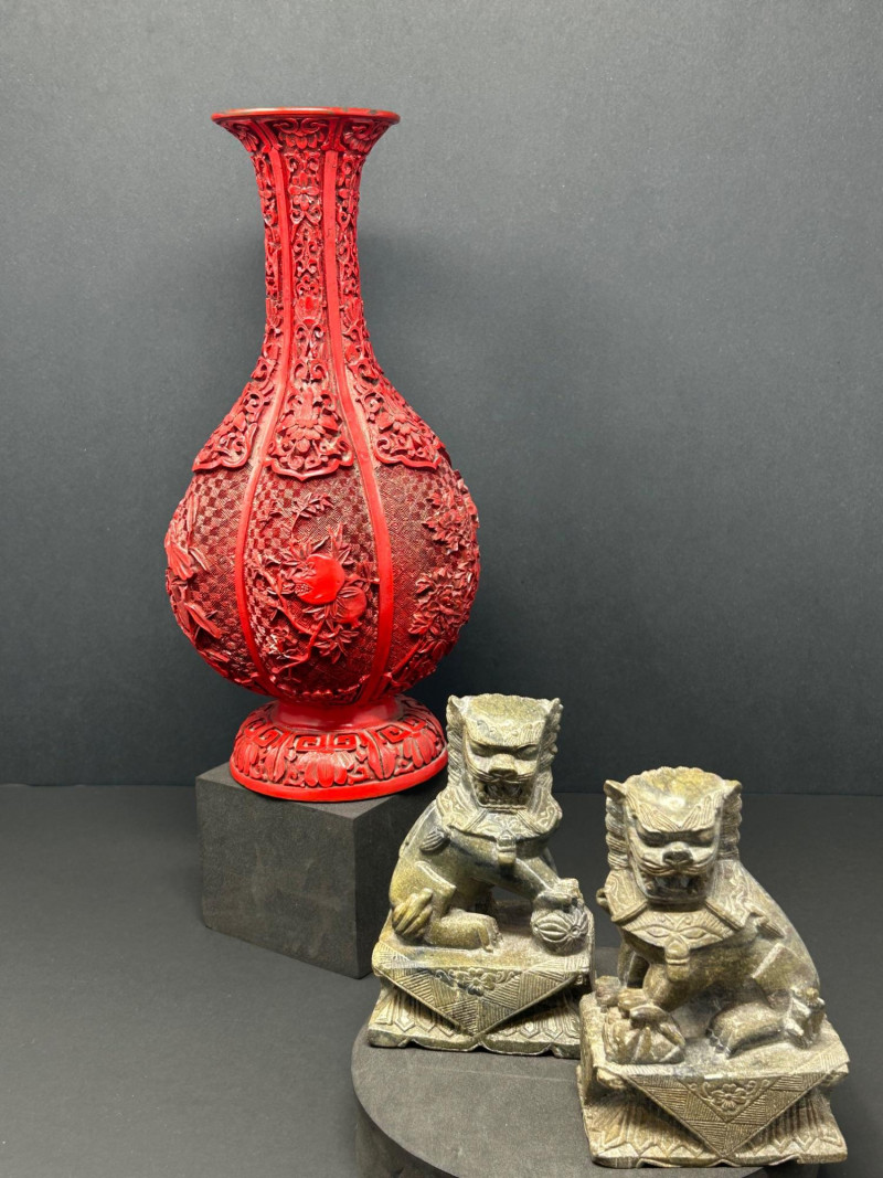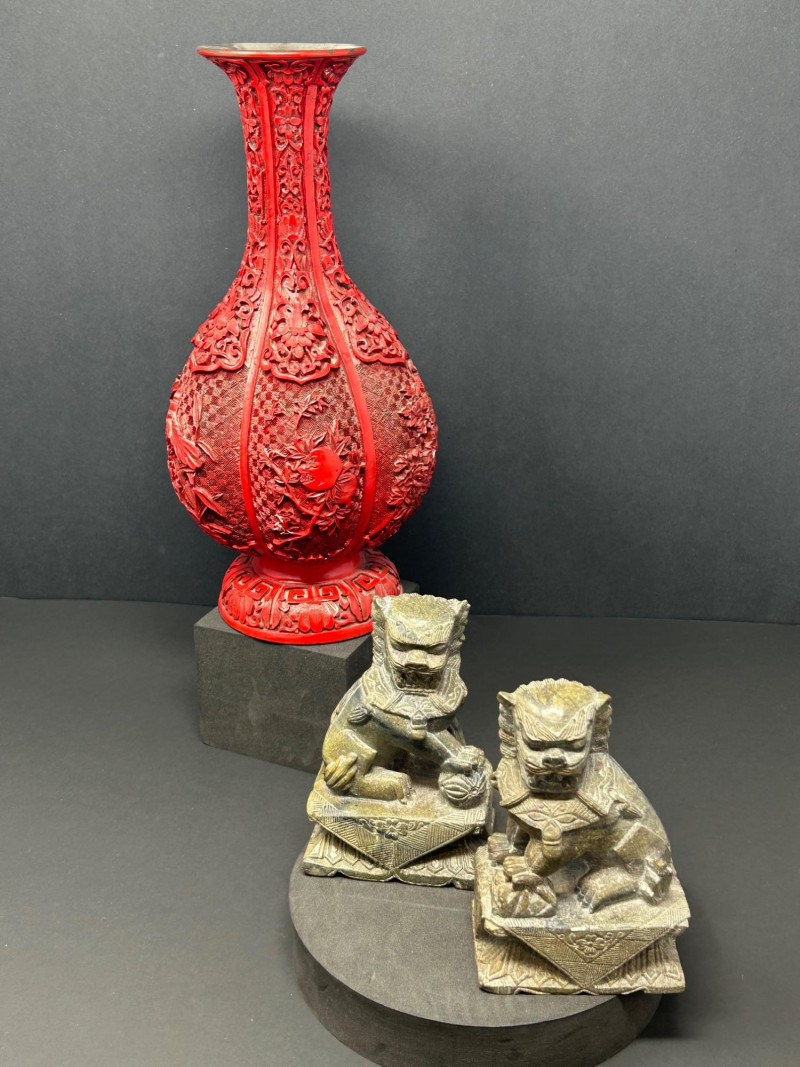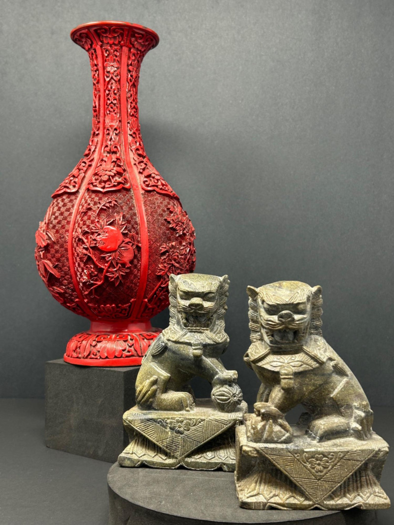 A decorative Asian-inspired grouping featuring a carved brass gourd-form vase with red lacquered exterior, accompanied by a matching pair of carved stone Foo Dogs (guardian lions). The vase displays deep relief floral and foliate carving over a textured ground, framed by vertical panels and finished with a flared mouth and pedestal base. The exposed brass interior and weight suggest a metal construction, while the bold red exterior finish evokes traditional cinnabar-style decorative wares. The accompanying Foo Dogs are carved in traditional seated poses with stylized manes, expressive facial features, and symbolic elements. One figure rests a paw atop a sphere, a classic guardian lion motif associated with protection and authority. Together, this trio forms a striking display grouping suitable for Asian décor, shelf presentation, or altar-style arrangement. Origin: Asian Date: 20th century Dimensions: Approx. 13.5–14" H × 7" W (widest point) Material: Carved brass Color / Finish: Red lacquered exterior with exposed brass interior Form: Gourd-form body with flared neck and pedestal base Notes: Labeled “Carved Vase” on underside Origin: Asian Date: 20th century Dimensions: Approx. 5" H each Base Dimensions: Approx. 3–4" W Material: Carved stone or stone-like material Color / Finish: Gray stone tones with natural patina Design: Traditional seated guardian lions; one with paw resting on a sphereItem Details: