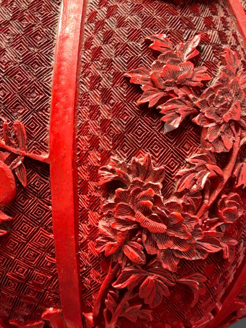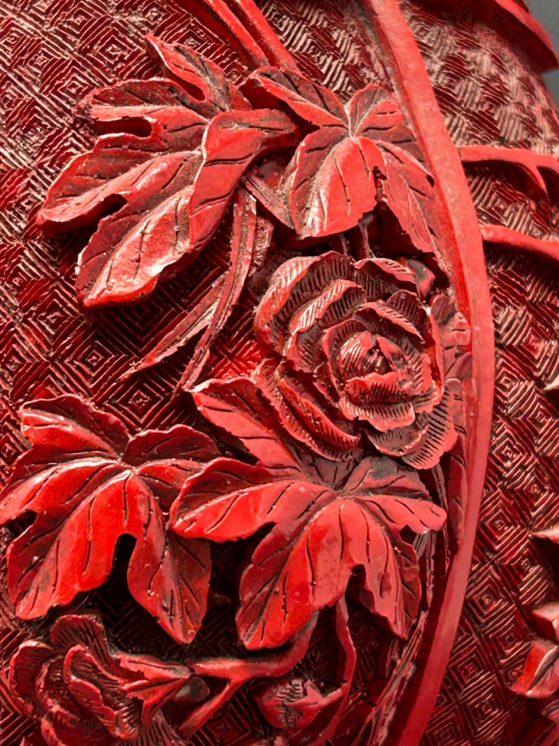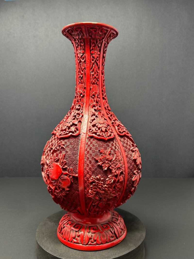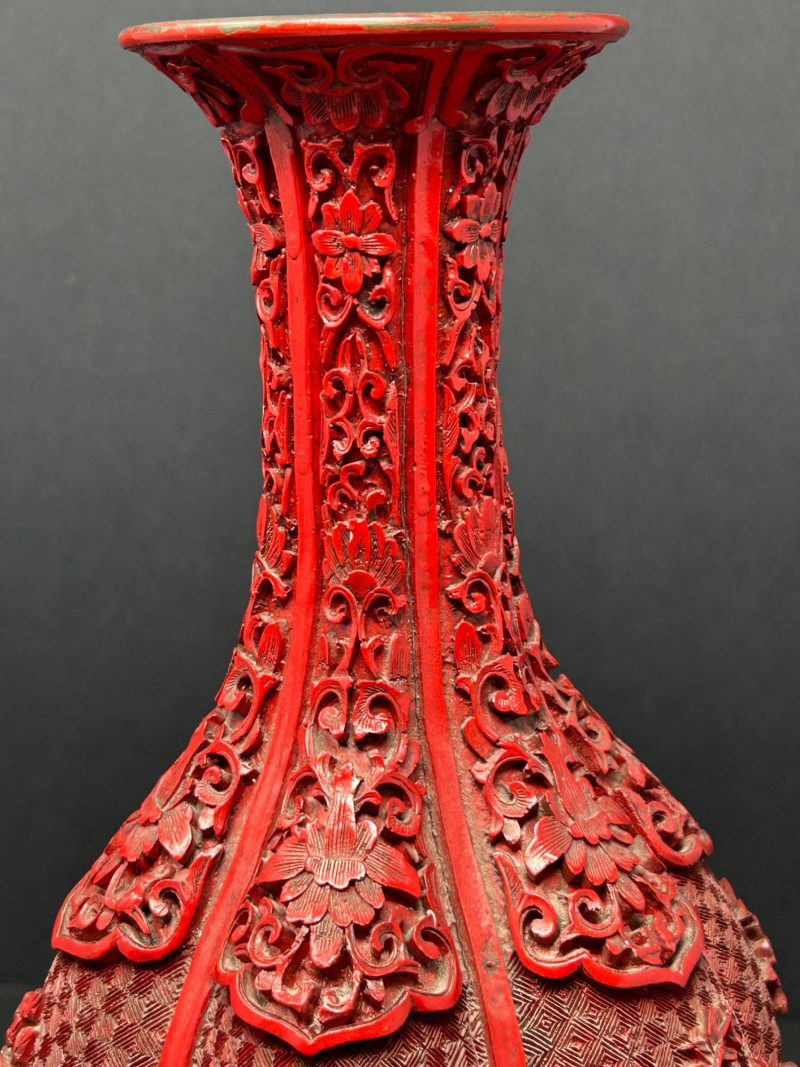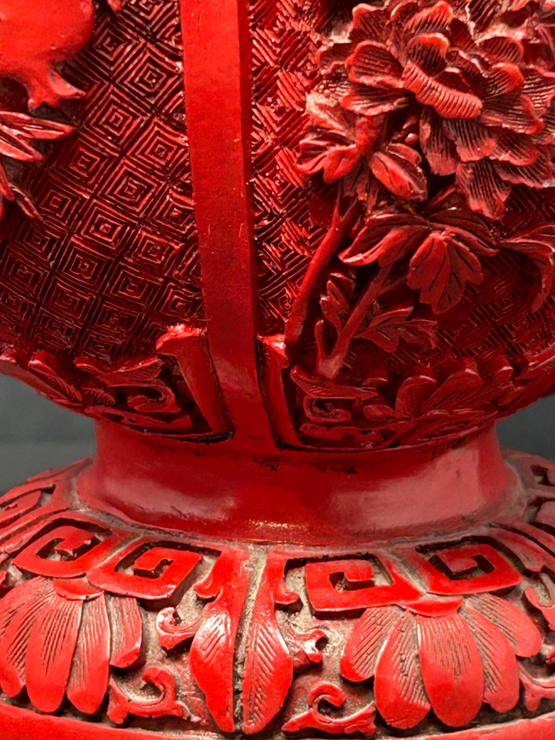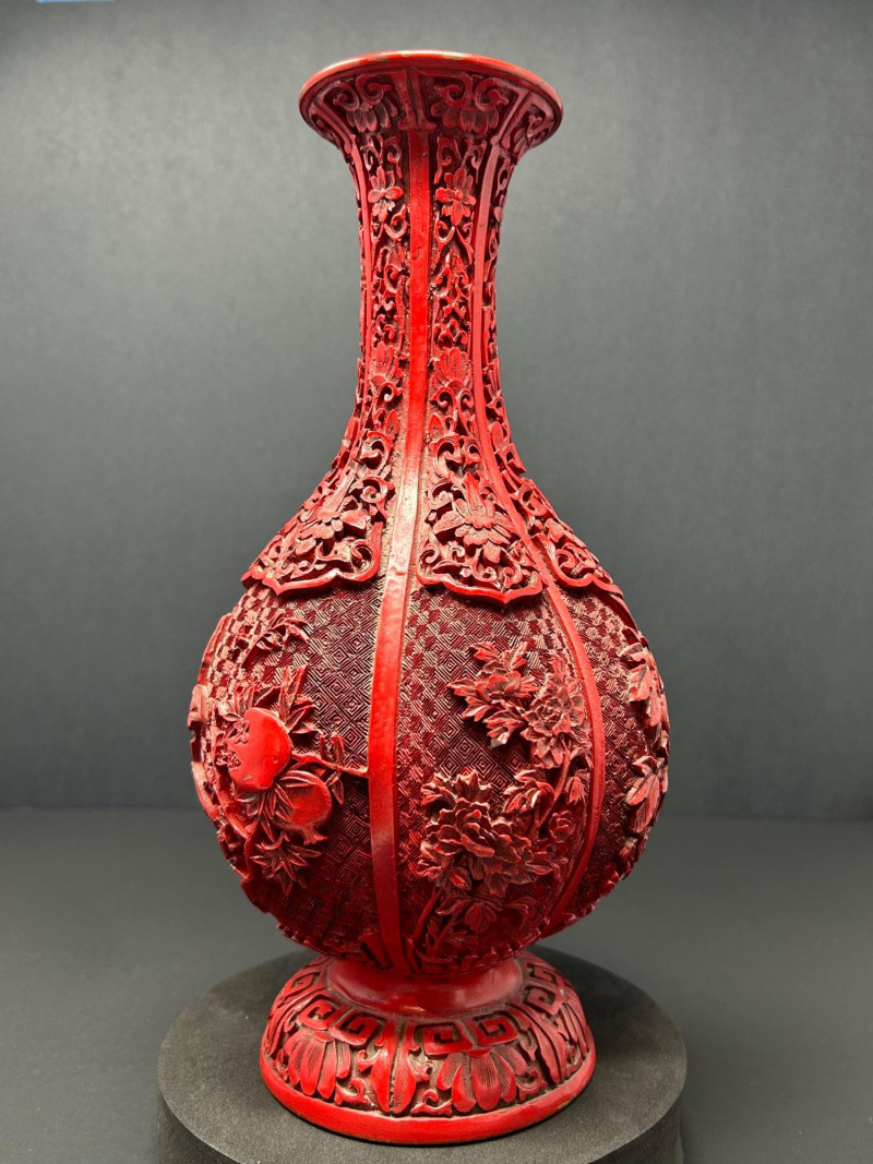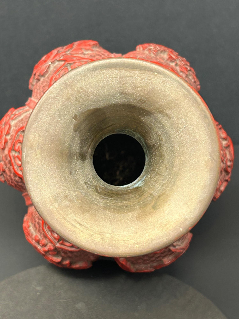 A decorative Asian-inspired grouping featuring a carved brass gourd-form vase with red lacquered exterior, accompanied by a matching pair of carved stone Foo Dogs (guardian lions). The vase displays deep relief floral and foliate carving over a textured ground, framed by vertical panels and finished with a flared mouth and pedestal base. The exposed brass interior and weight suggest a metal construction, while the bold red exterior finish evokes traditional cinnabar-style decorative wares. The accompanying Foo Dogs are carved in traditional seated poses with stylized manes, expressive facial features, and symbolic elements. One figure rests a paw atop a sphere, a classic guardian lion motif associated with protection and authority. Together, this trio forms a striking display grouping suitable for Asian décor, shelf presentation, or altar-style arrangement. Origin: Asian Date: 20th century Dimensions: Approx. 13.5–14" H × 7" W (widest point) Material: Carved brass Color / Finish: Red lacquered exterior with exposed brass interior Form: Gourd-form body with flared neck and pedestal base Notes: Labeled “Carved Vase” on underside Origin: Asian Date: 20th century Dimensions: Approx. 5" H each Base Dimensions: Approx. 3–4" W Material: Carved stone or stone-like material Color / Finish: Gray stone tones with natural patina Design: Traditional seated guardian lions; one with paw resting on a sphereItem Details:
