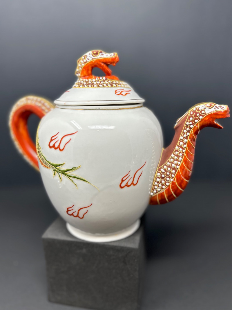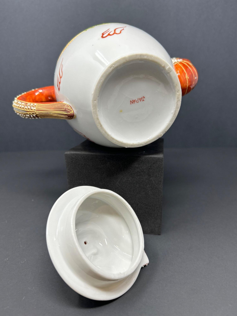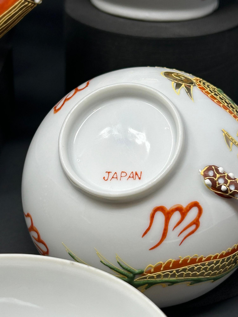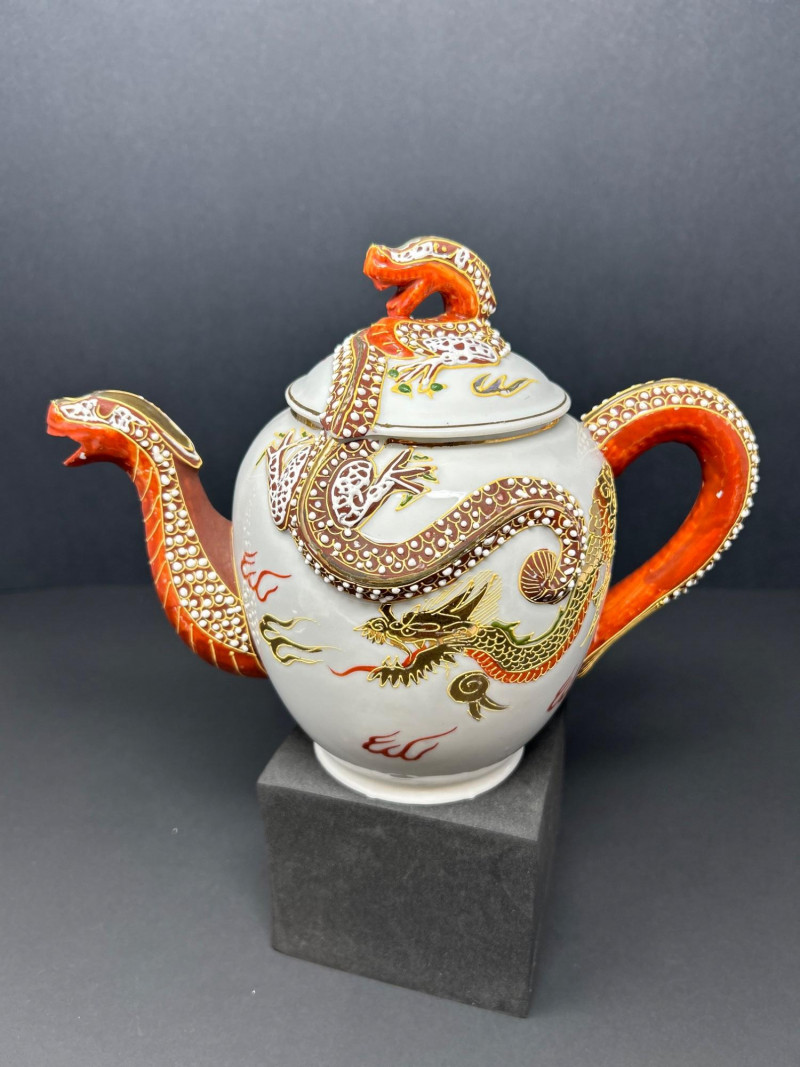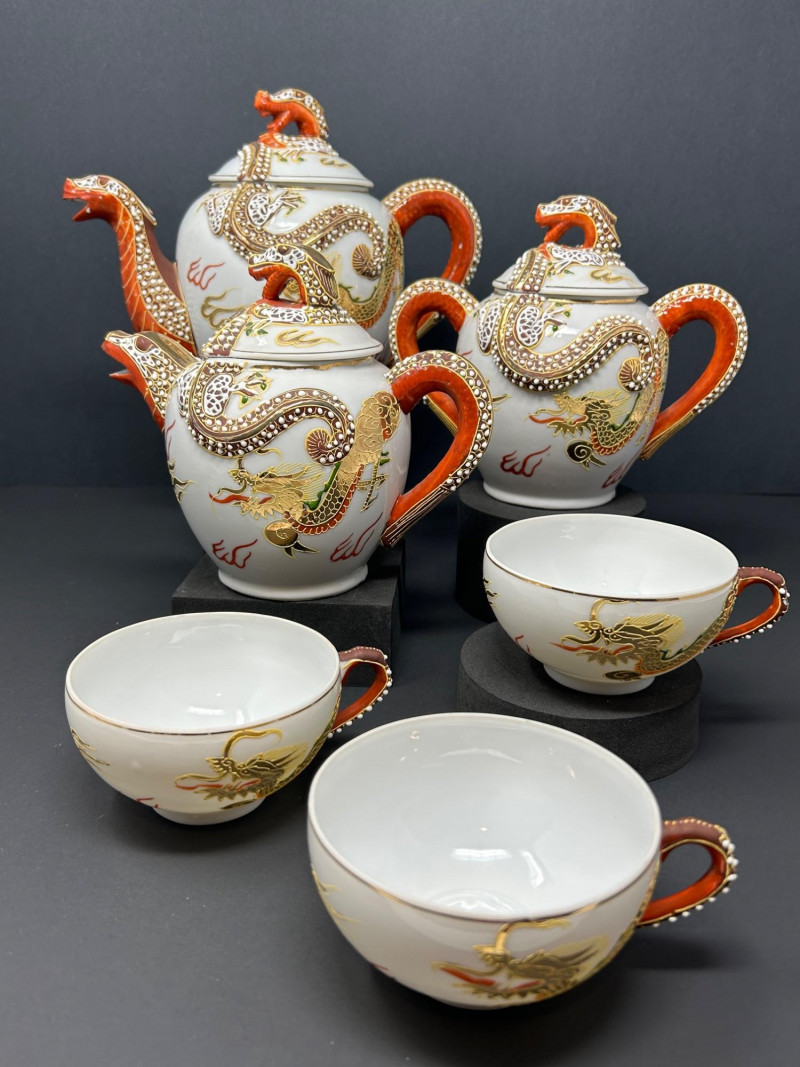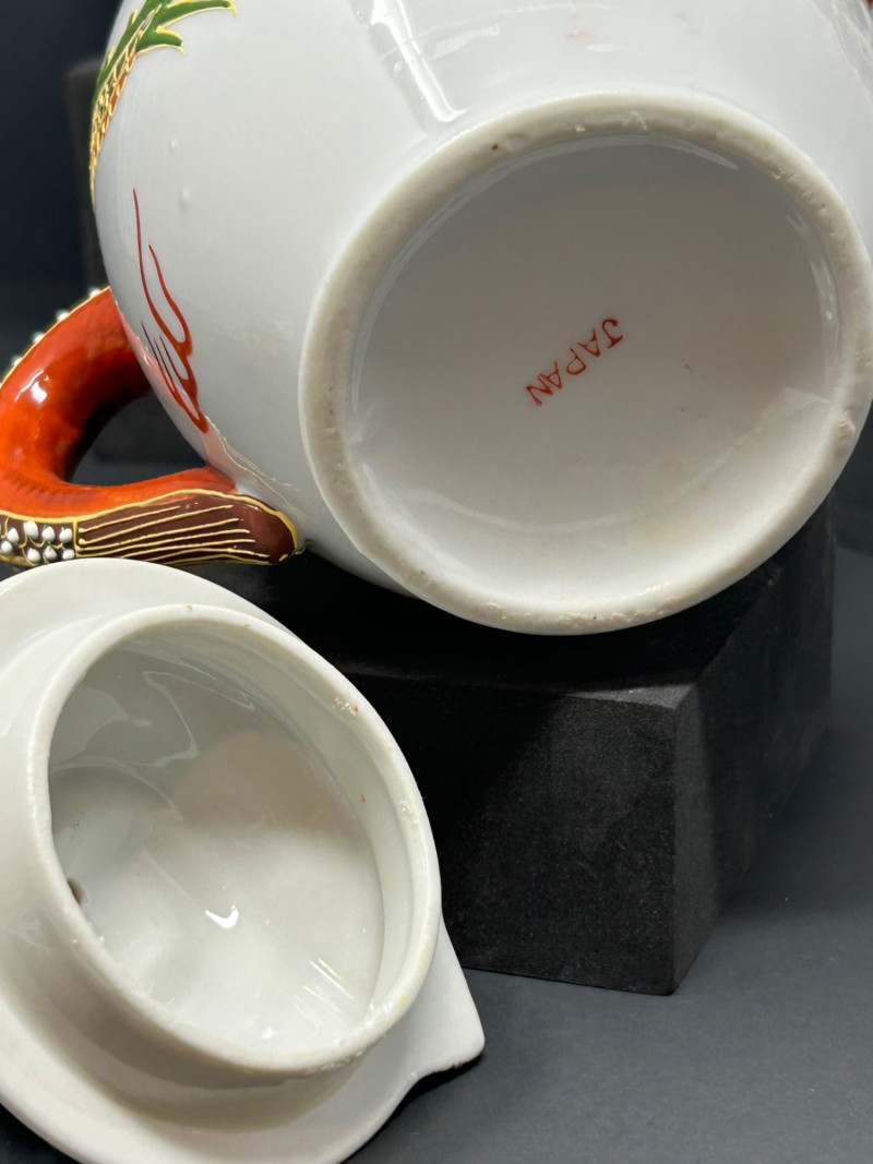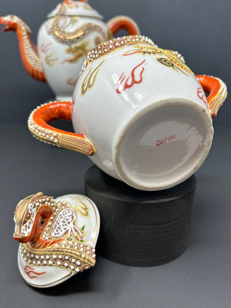 Decorative vintage Japanese porcelain tea set featuring raised dragon moriage-style decoration with richly detailed hand-applied enamels, beaded accents, and gold gilt highlights. The sculptural dragon motifs stand prominently above the porcelain surface, creating strong depth, texture, and visual impact. The teapot and sugar bowl are accented with dragon-form spouts and finials, while the matching cups display coordinating raised dragon imagery with gilt rims. Bases are marked “Japan,” consistent with mid-20th-century Japanese export porcelain. A bold and eye-catching set, ideal for collectors of raised dragon porcelain, moriage-style ceramics, or Asian-inspired decorative display pieces. Type: Tea Set Style: Raised Dragon Moriage-Style Material: Porcelain Origin: Japan (marked) Decoration: Hand-applied raised dragon relief, beaded enamel detailing, gold gilt accents Color Palette: Red, green, cream, and gold tones Set Includes and Measurements: Teapot: 7" tall Sugar Bowl with Lid: 6" tall Teacups (3): 4" across × 3" tall Era / Likely: Mid-20th century Japanese export Use: Decorative / display recommended due to raised moriage decorationDetails:
