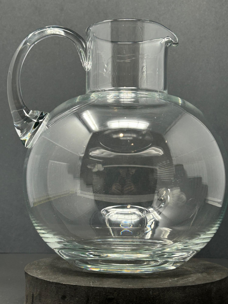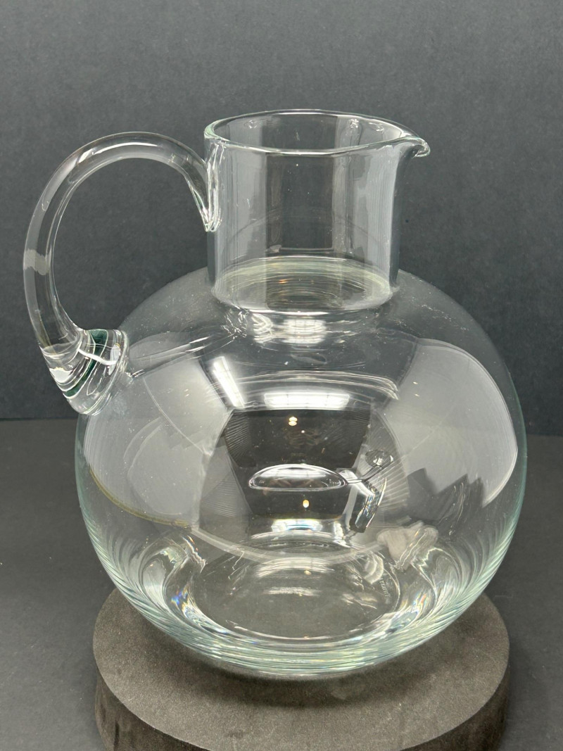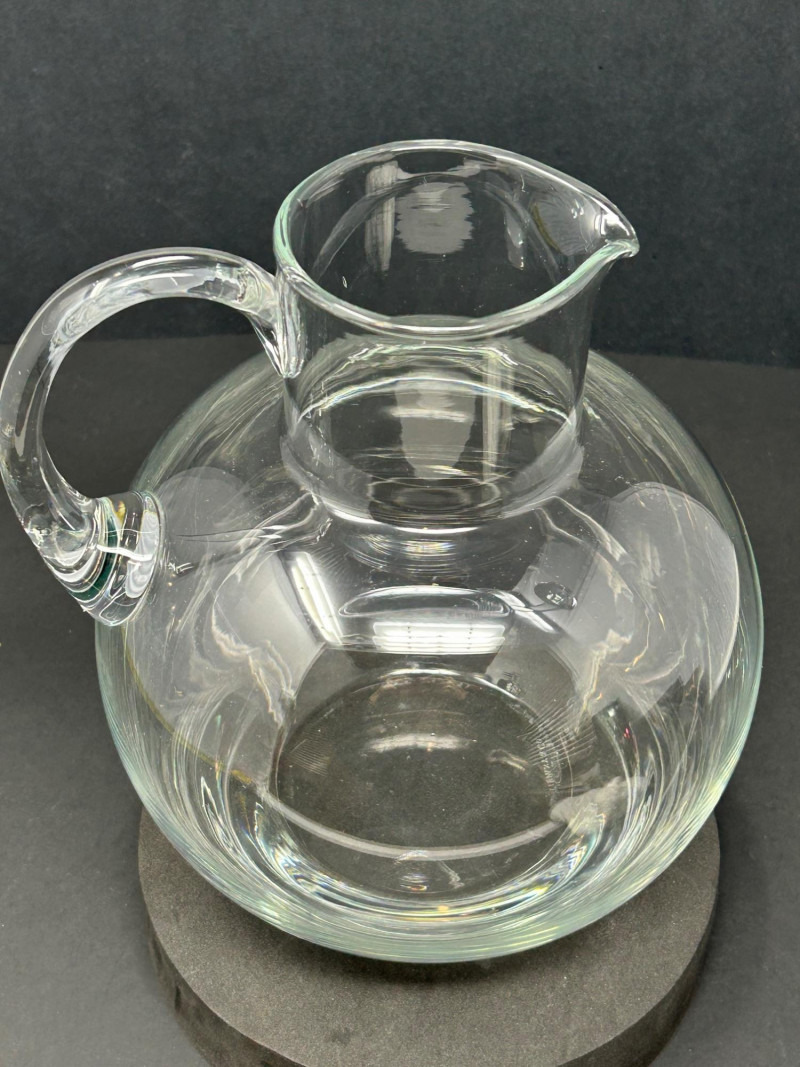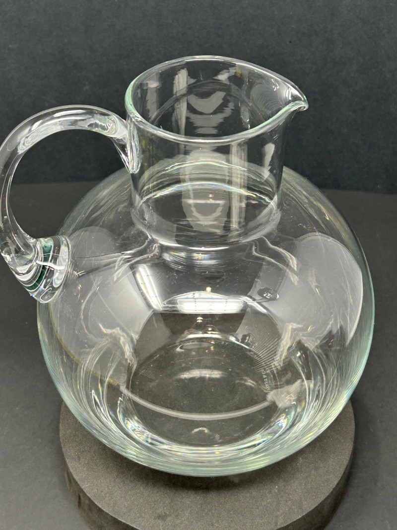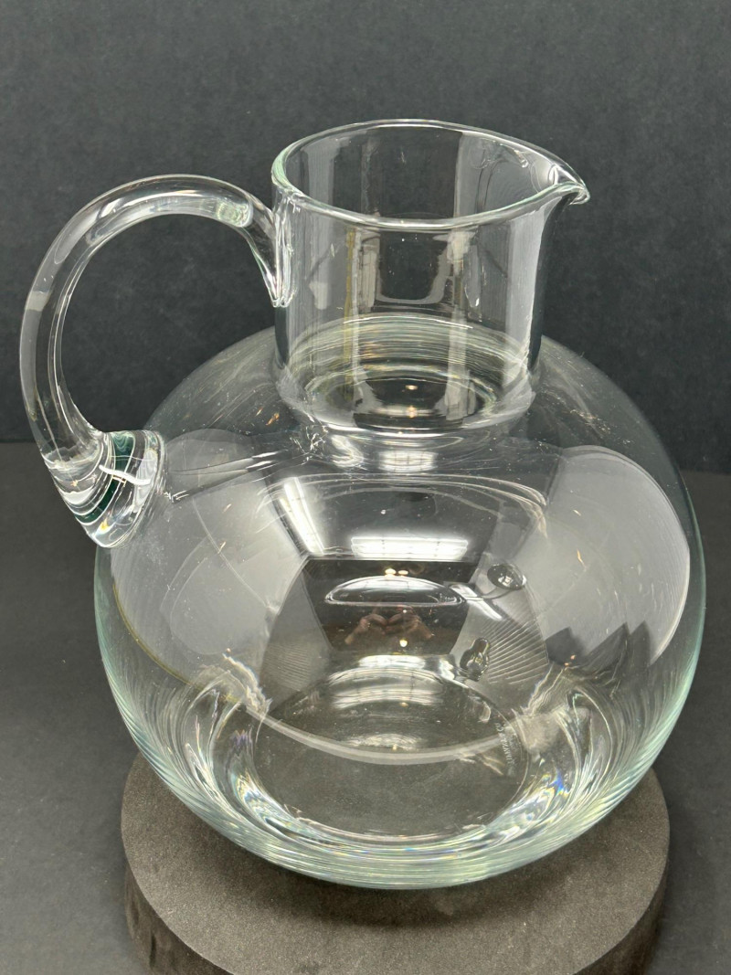 Elegant clear glass pitcher by Tiffany & Co., featuring a rounded bulbous body, applied clear glass handle, and softly flared pouring spout. The pitcher is marked “Tiffany & Co.” etched along the rim, indicating production for the iconic luxury brand. This minimalist yet refined design showcases excellent glass clarity and balanced proportions. A versatile piece suitable for serving water, juice, or wine, or for use as a decorative accent in a modern or classic table setting. Details: Maker: Tiffany & Co. Item Type: Clear glass pitcher Material: Clear blown glass Markings: Etched “Tiffany & Co.” on rim Approx. Dimensions: Height: approx. 8.5" Width (including handle): approx. 9" Design: Rounded body, applied handle, flared spout