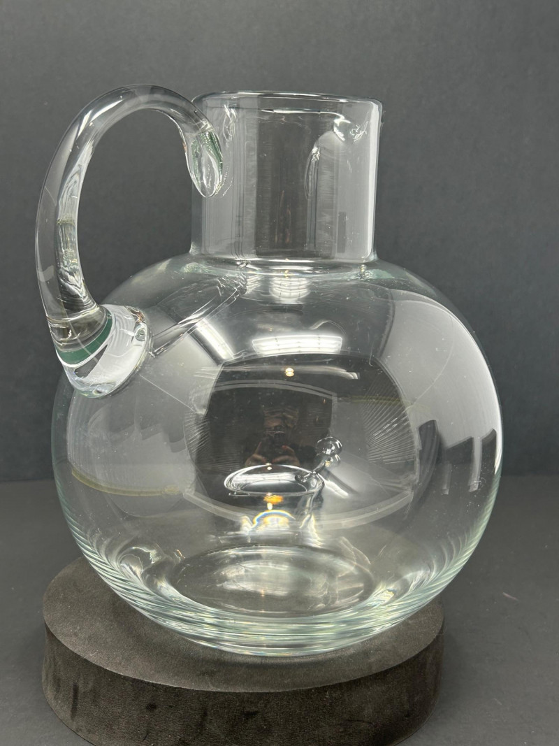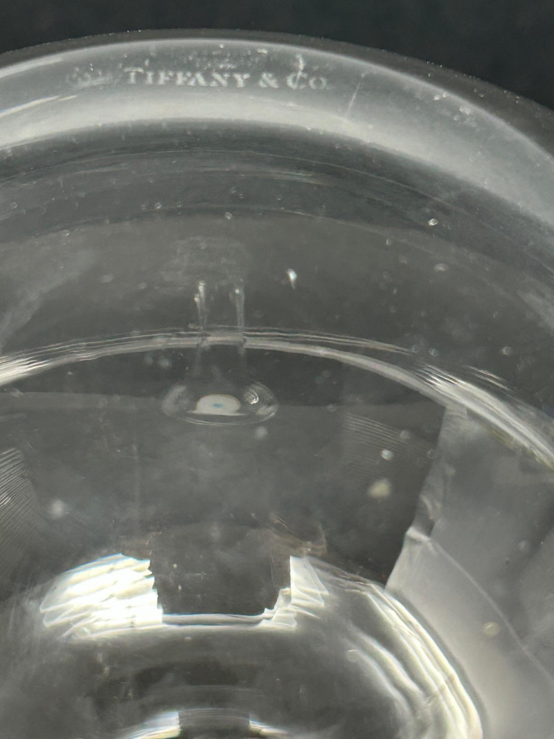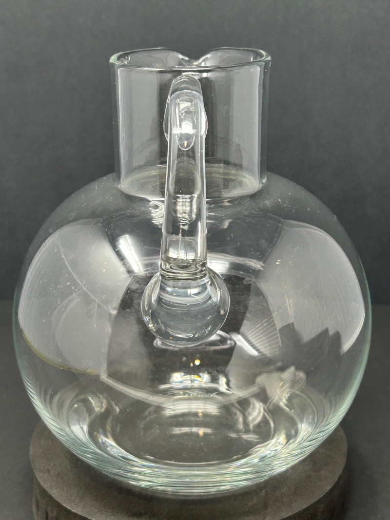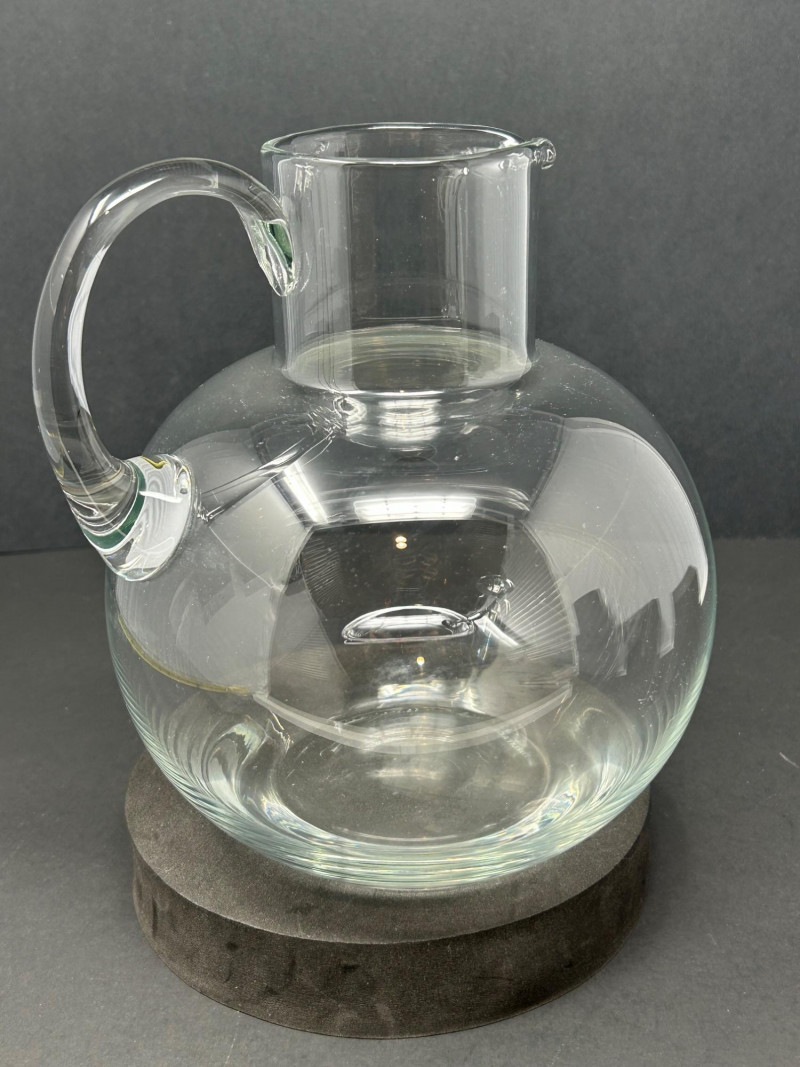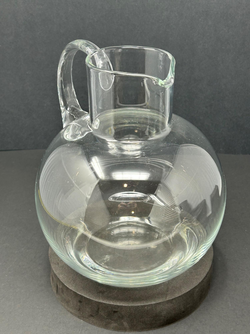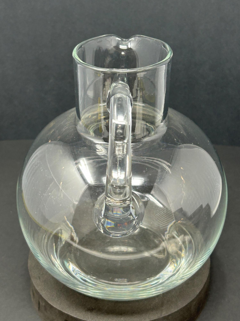 Elegant clear glass pitcher by Tiffany & Co., featuring a rounded bulbous body, applied clear glass handle, and softly flared pouring spout. The pitcher is marked “Tiffany & Co.” etched along the rim, indicating production for the iconic luxury brand. This minimalist yet refined design showcases excellent glass clarity and balanced proportions. A versatile piece suitable for serving water, juice, or wine, or for use as a decorative accent in a modern or classic table setting. Details: Maker: Tiffany & Co. Item Type: Clear glass pitcher Material: Clear blown glass Markings: Etched “Tiffany & Co.” on rim Approx. Dimensions: Height: approx. 8.5" Width (including handle): approx. 9" Design: Rounded body, applied handle, flared spout