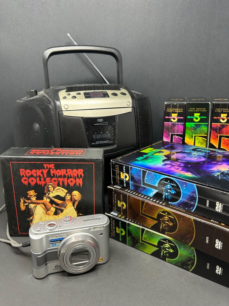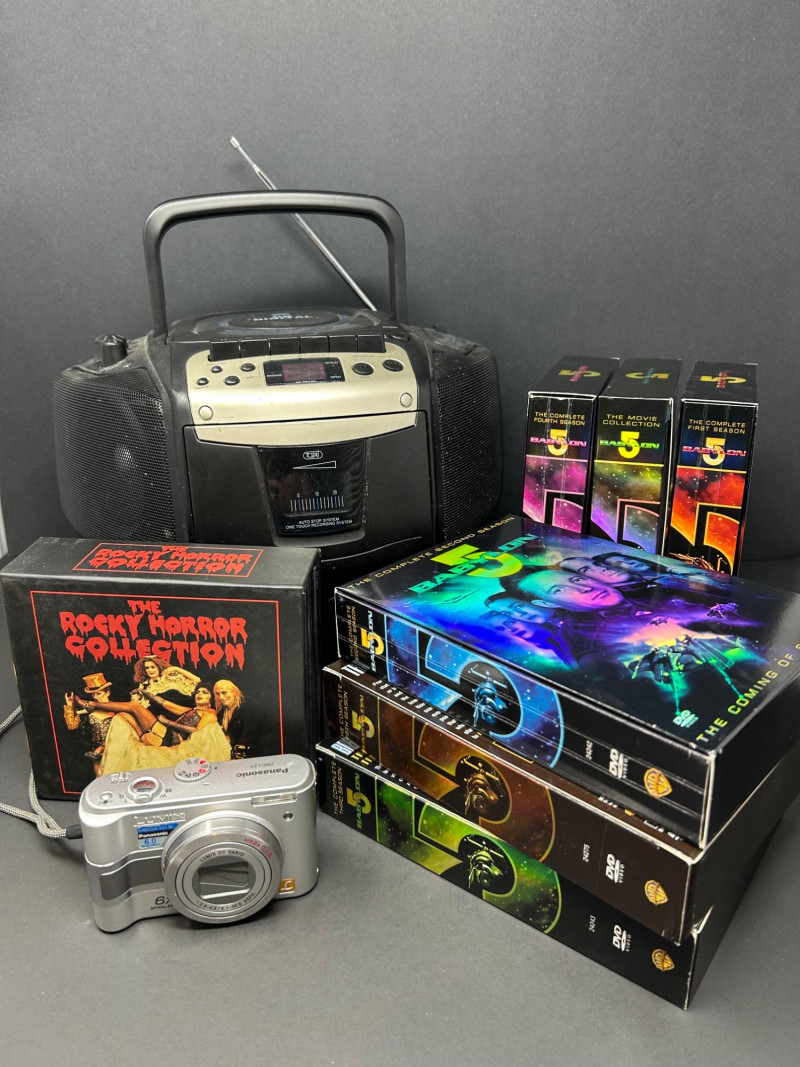 A nostalgic mixed-media entertainment lot featuring a working portable CD boombox, a Panasonic Lumix digital camera, and a curated DVD collection highlighted by the complete Babylon 5 series and The Rocky Horror Picture Showcollection.
