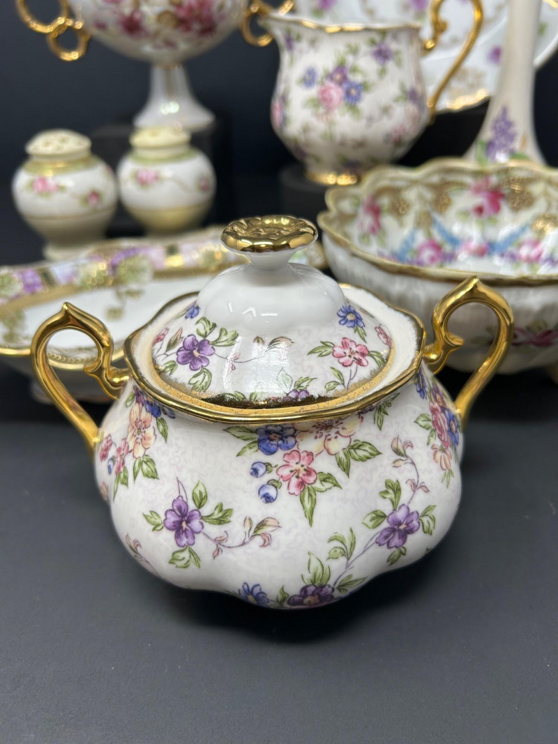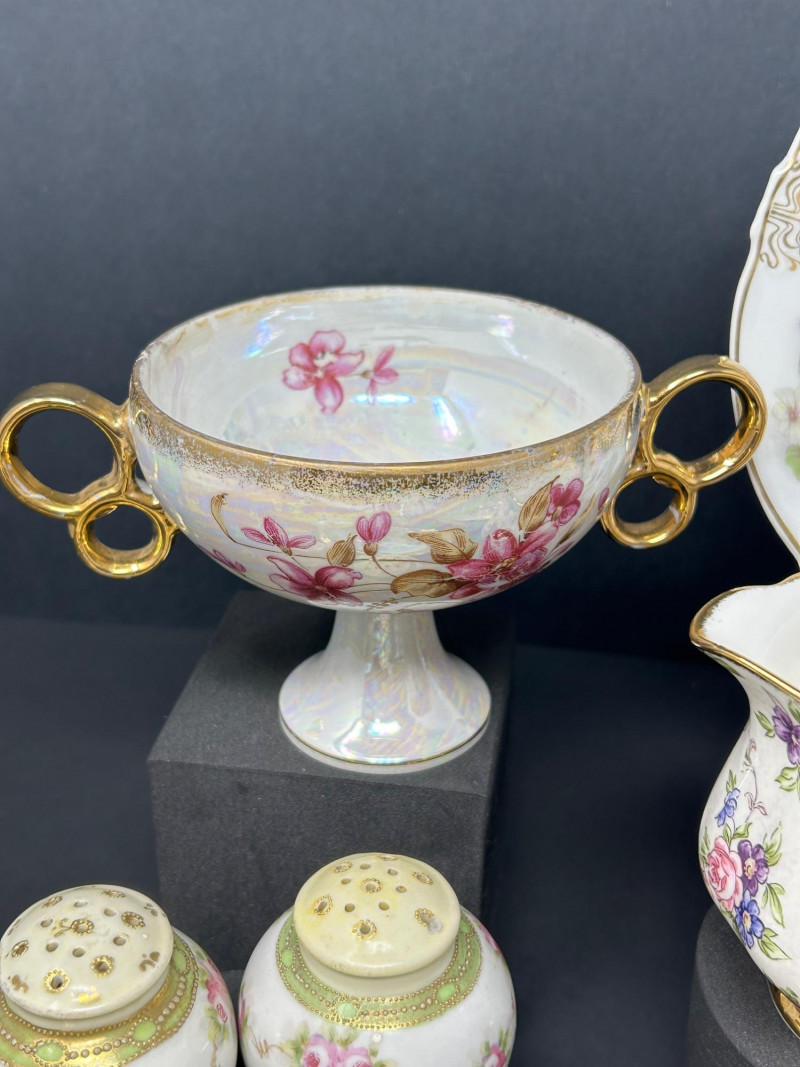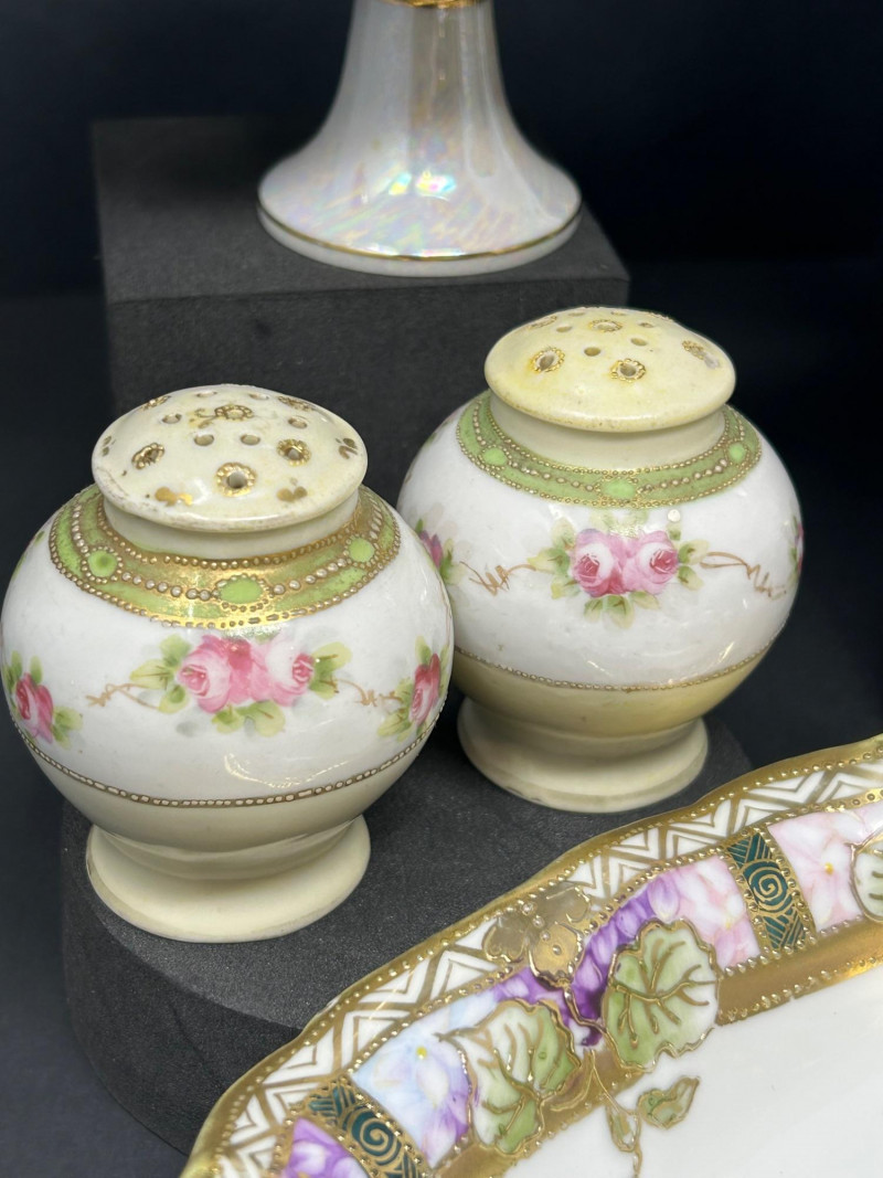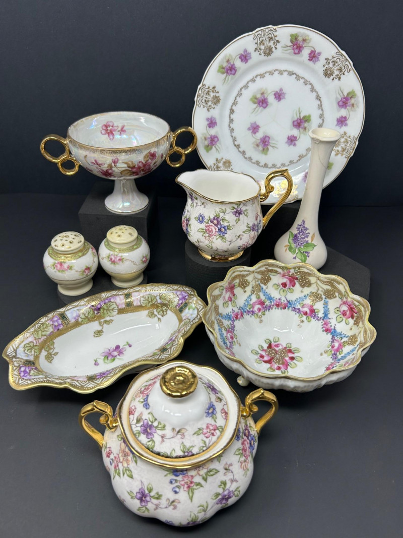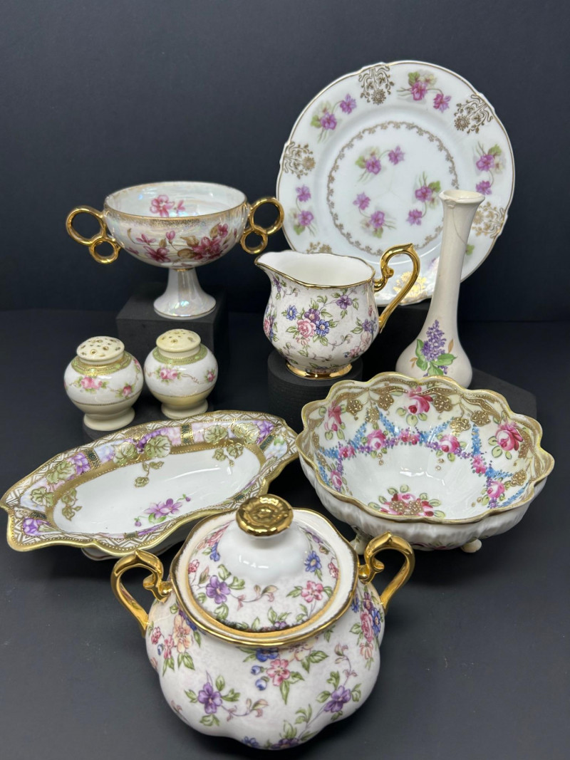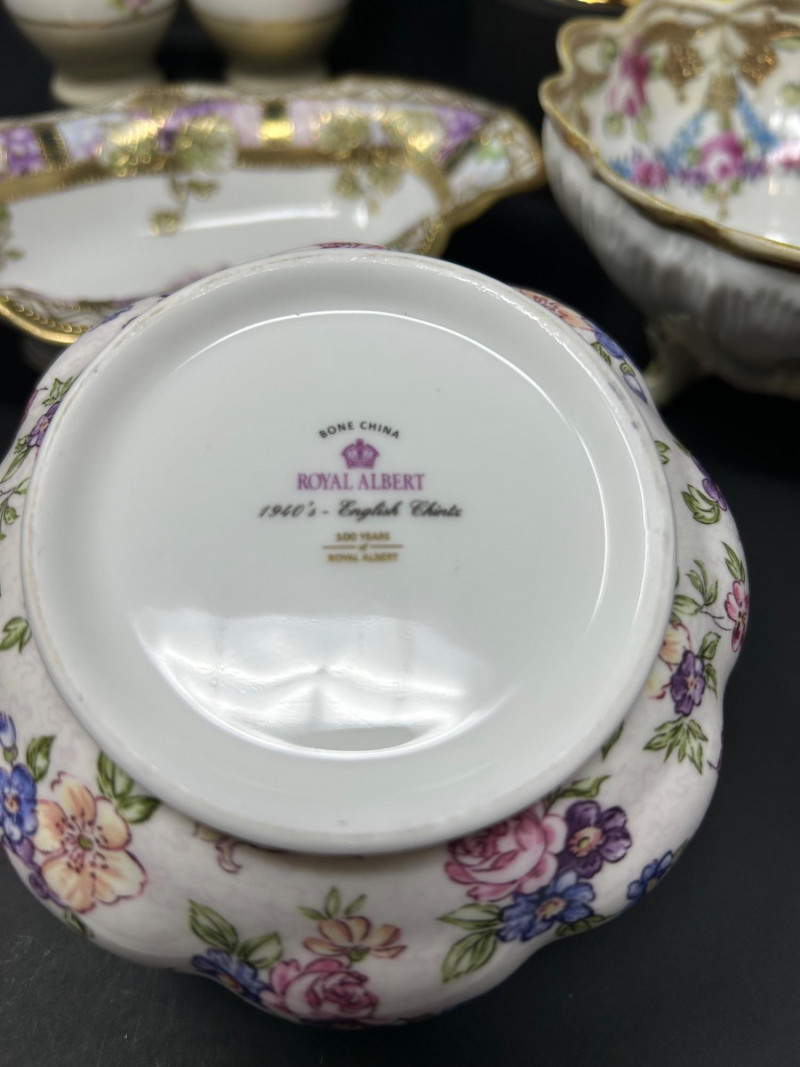 An elegant assembled group of antique and vintage porcelain, combining marked Nippon export ware, English Royal Albert bone china, and decorative European- and Japanese-style pieces. The collection highlights hand-painted floral motifs, sculpted and scalloped forms, iridescent glazes, and gilt accents typical of late 19th to mid-20th century decorative porcelain. Marks are noted where present; stylistic attributions are clearly stated where pieces are unmarked. Date: Circa 1891–1921 (Nippon export period) Date: Circa 1891–1921 (Nippon export period) Pattern / Line: 1940s – English Chintz Date: Early–mid 20th century Date: Early 20th century Date: Early 20th centuryItem Details: