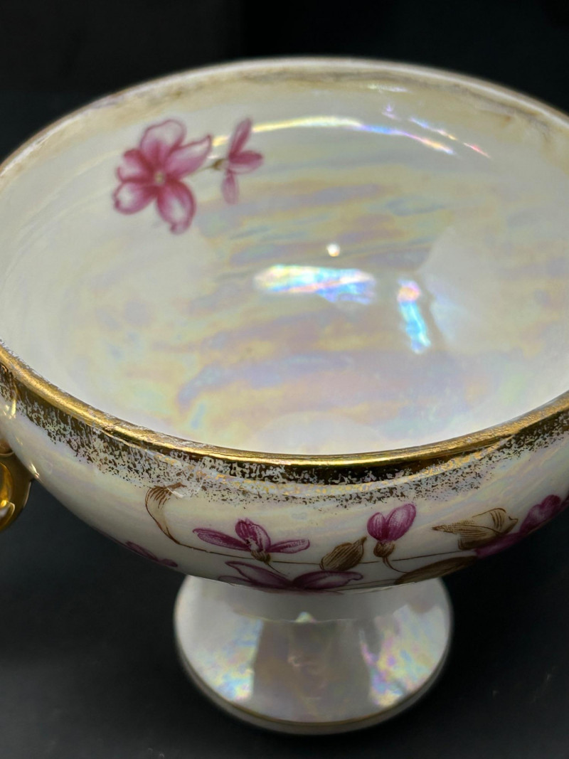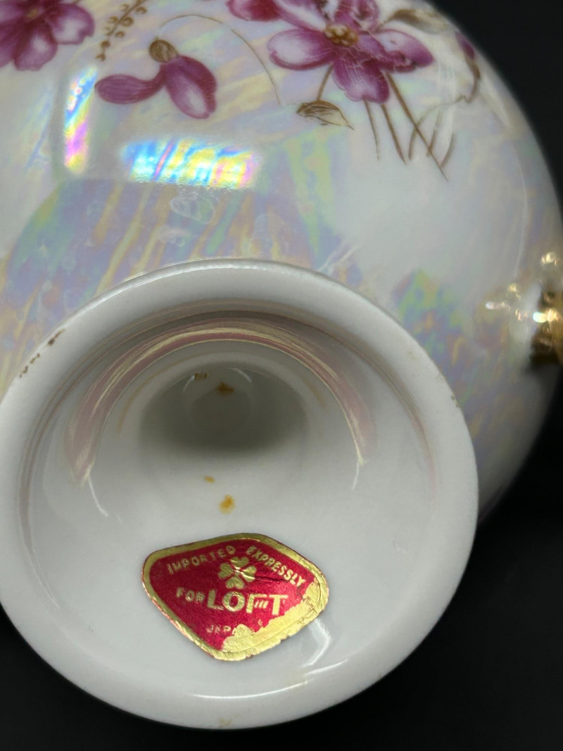 Decoration: Iridescent glaze with hand-painted floral decoration and gilt accents