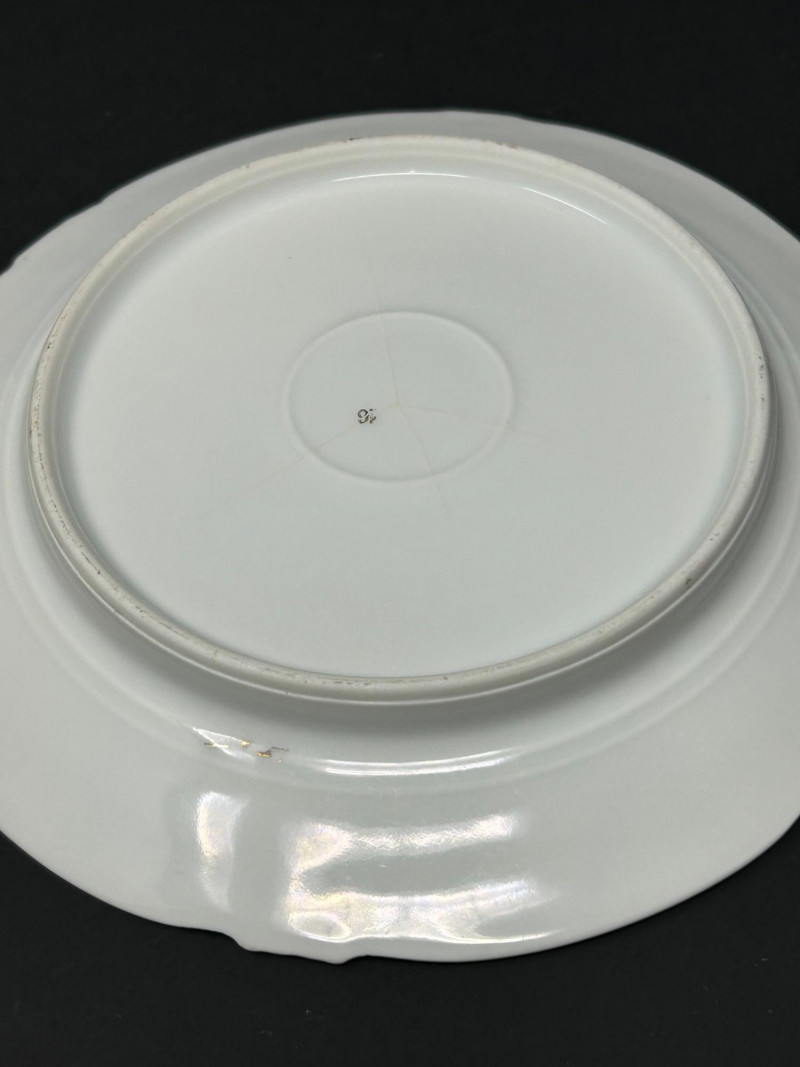 Decoration: Central floral motif with raised gilt vines, leaves, and scalloped gilt edge