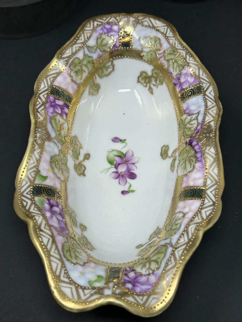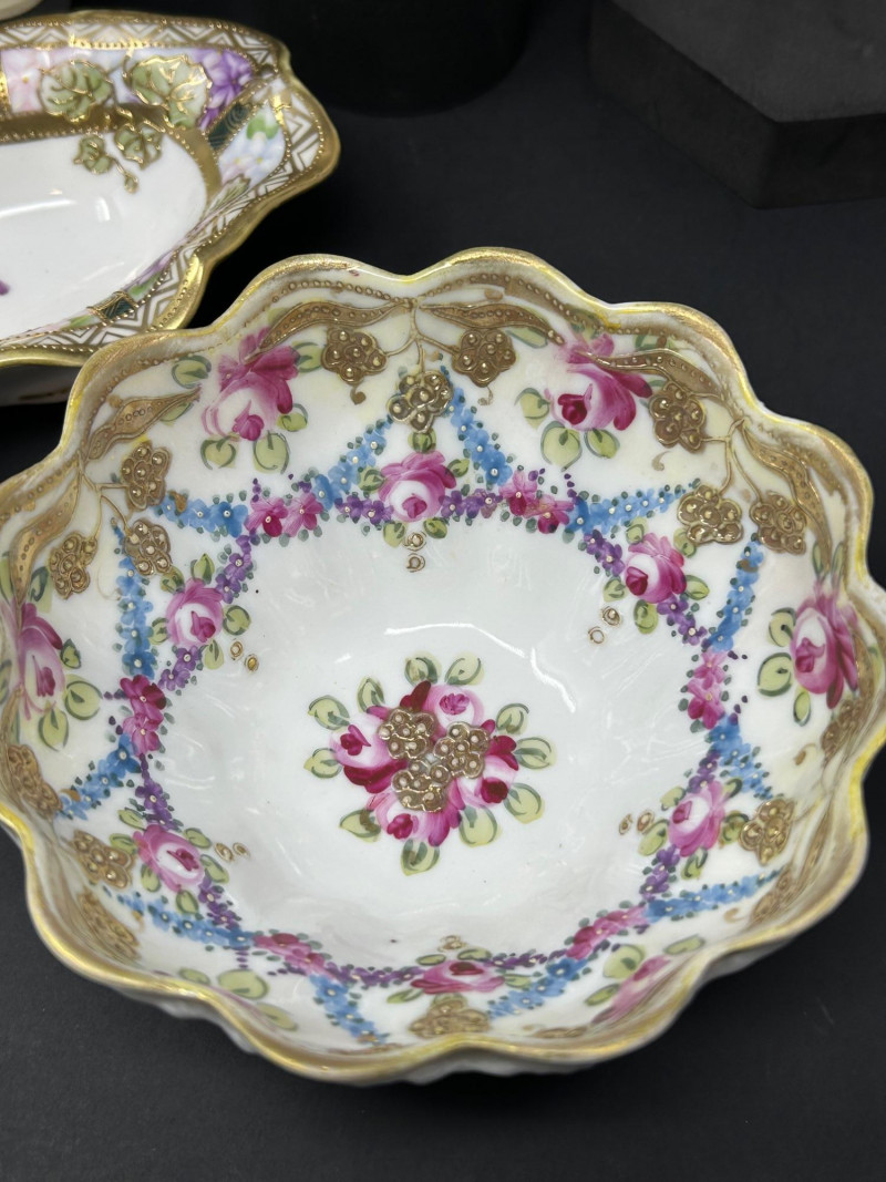 Form: Scalloped bowl with molded body and ornate rimHand-Painted Nippon Porcelain Serving Dish