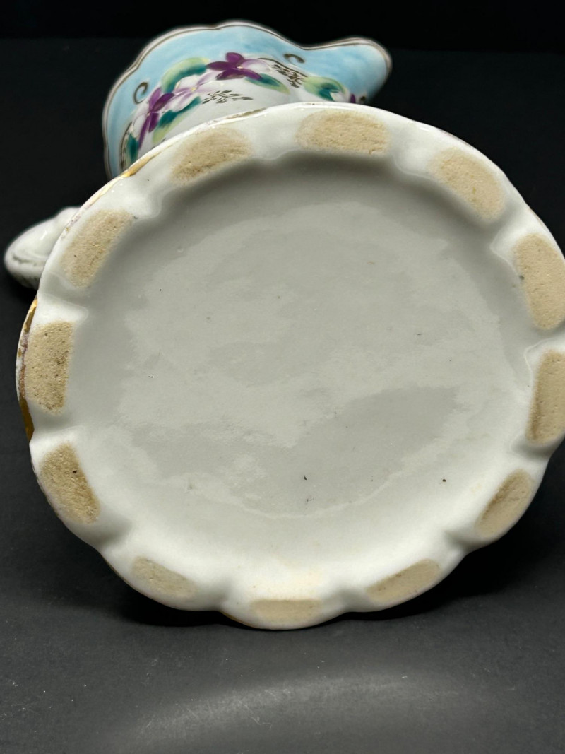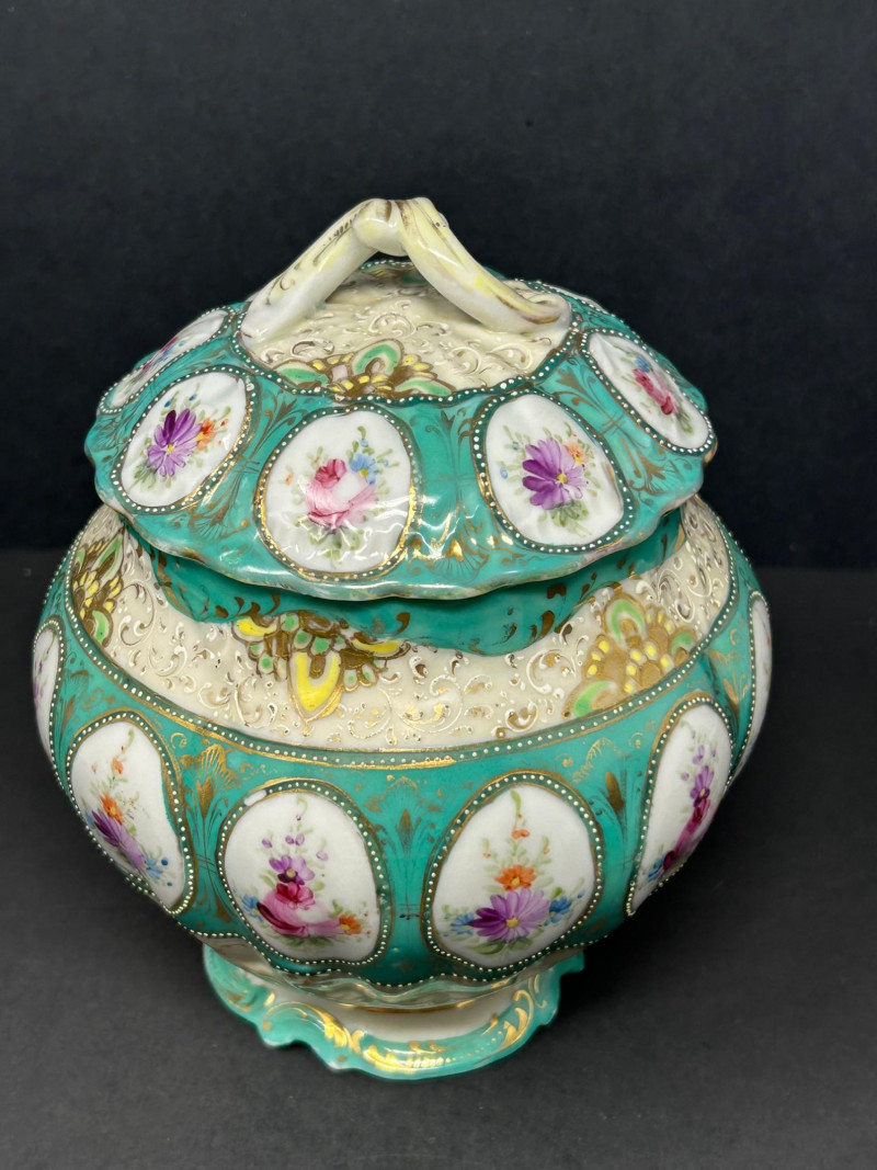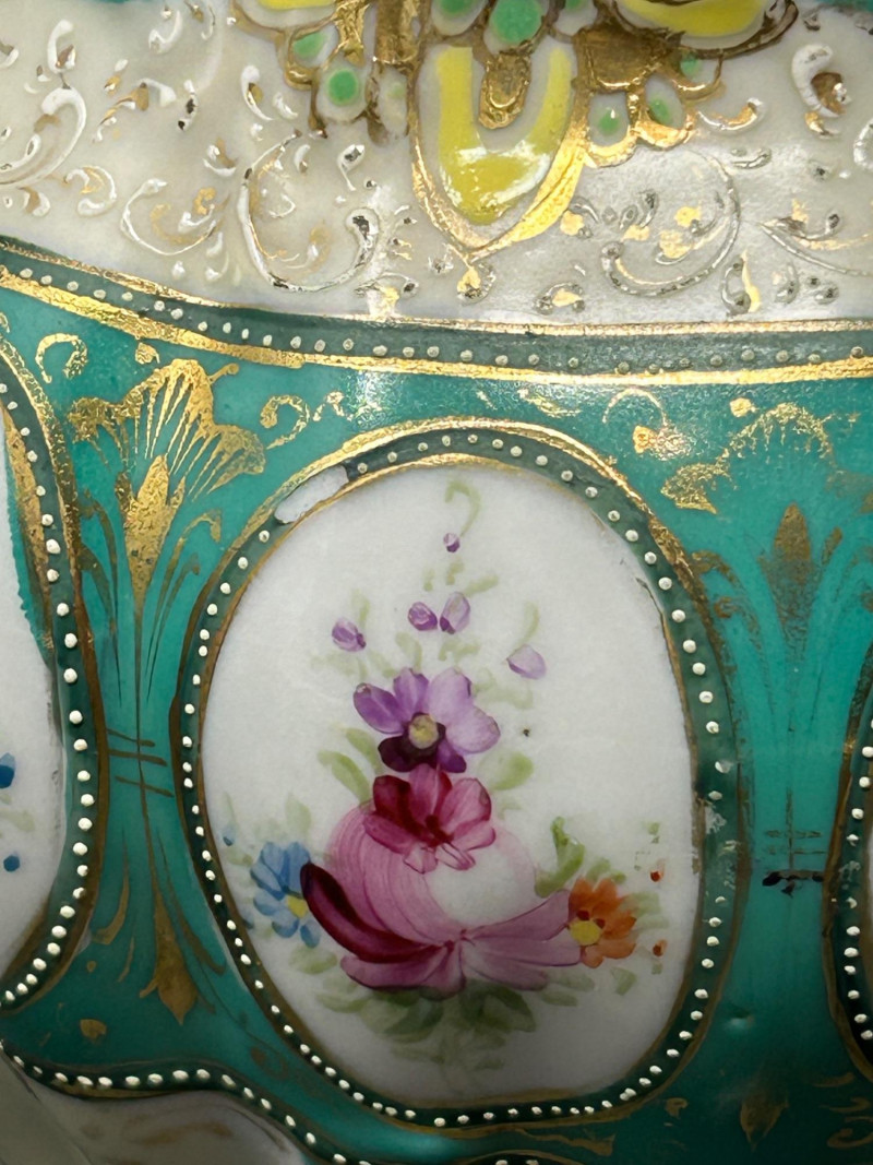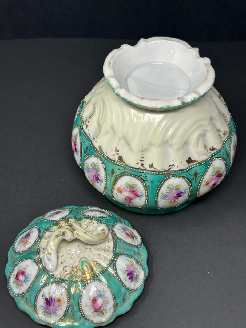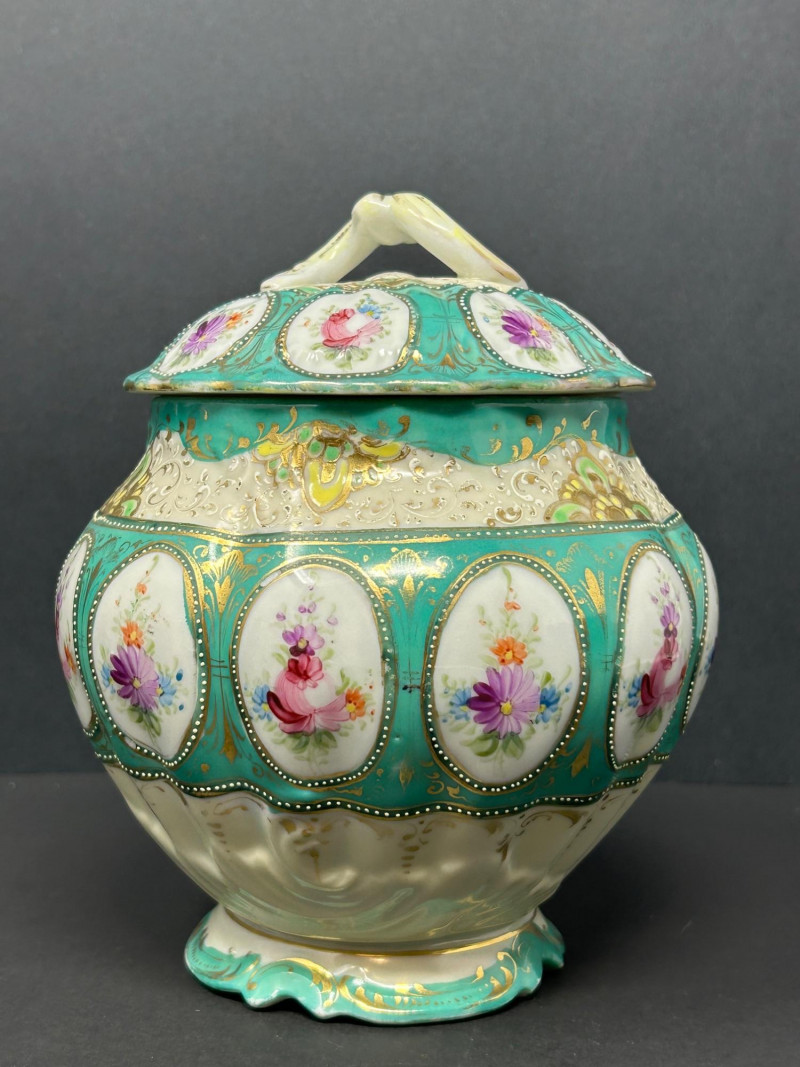 A decorative trio of vintage European porcelain comprising a hand-painted porcelain pitcher and two coordinating lidded biscuit jars. The set showcases mid-20th-century decorative porcelain craftsmanship, combining soft pastel florals, a rich teal ground, molded relief, and gilt accents. Subtle Japonisme-inspired design elements are evident in the flowing floral motifs and balanced ornamentation. The pitcher features hand-painted floral decoration with layered coloring, raised enamel details, and gilt trim, making it suitable for serving, display, or use as a decorative vase. The biscuit jars complement the pitcher—one decorated with a teal ground and oval floral medallions framed by beaded borders and ornate gilding, and the other finished in a softer ivory palette with floral decoration and light gilt accents. Traditionally used as biscuit jars, these pieces also function beautifully today as decorative storage or display accents. Offered together as a cohesive and visually appealing three-piece lot. Form: Pitcher (also suitable as a chocolate pot or decorative vase) Date: Circa 1940s–1960s Dimensions: Approx. 8.5″ H Mark: Unmarked Color / Finish: White porcelain with hand-painted floral decoration, soft blue accents, raised enamel details, and gilt trim Missing lid Form: Biscuit Jar Date: Circa 1940s–1960s Dimensions: Approx. 7″ H (including lid) Mark: Unmarked Color / Finish: Teal ground with oval floral medallions, beaded borders, molded relief decoration, and gilt accents Form: Biscuit Jar Date: Circa 1940s–1960s Dimensions: Approx. 7″ H (including lid) Mark: Unmarked Color / Finish: Soft ivory ground with floral decoration in muted tones and light gilt detailingItem Details :