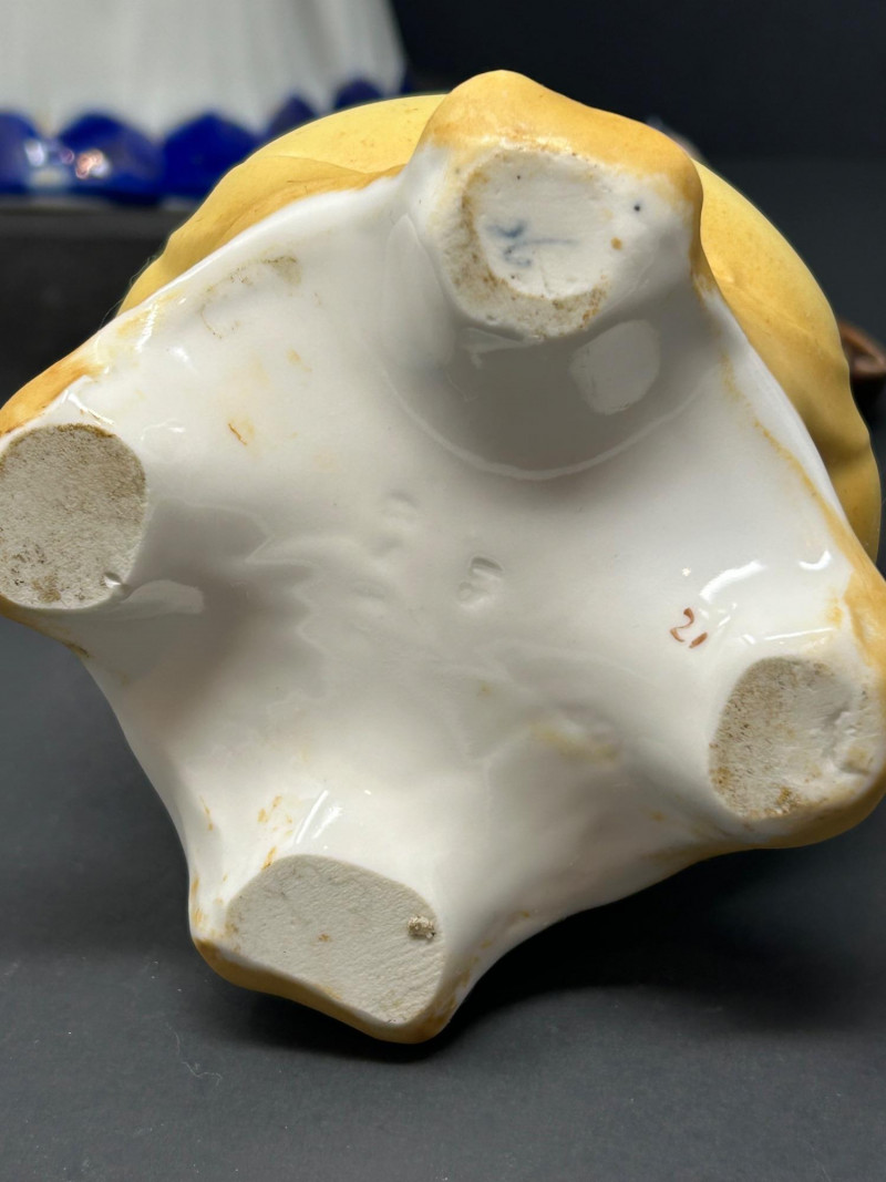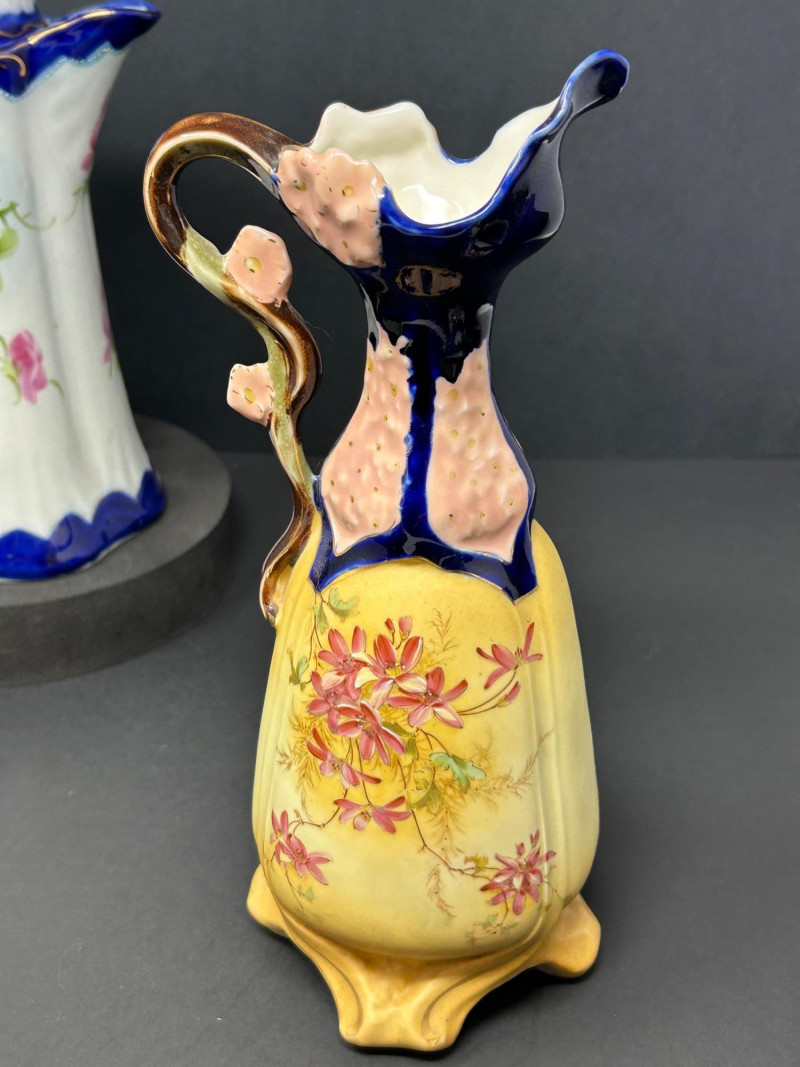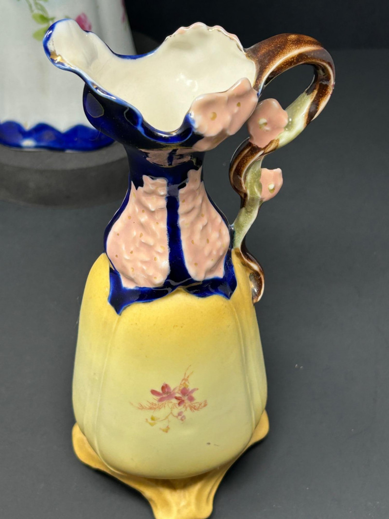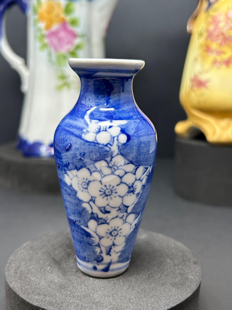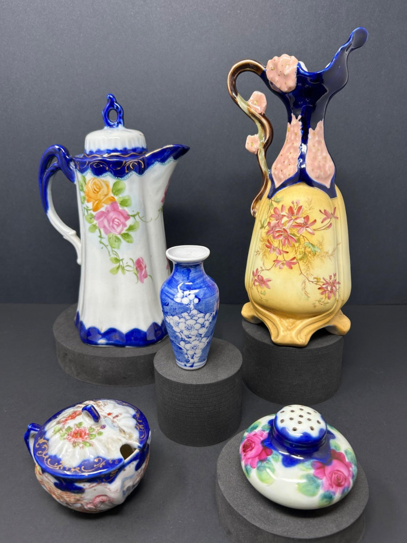 A decorative five-piece vintage porcelain grouping showcasing classic floral decoration, rich cobalt blue accents, and elegant traditional forms. The lot includes a tall Nippon-style chocolate pot or teapot, an ornate floral pitcher, a miniature blue-and-white bud vase, a lidded sugar bowl, and a small lidded porcelain shaker. Together, these pieces reflect the popular late 19th to early 20th century aesthetic of porcelain made for the American and export markets, blending functional tableware with decorative artistry. Date: Early 20th century style Dimensions: Approx. 10″ H Decoration: Hand-painted roses and floral motifs Color / Finish: Cream ground with deep cobalt blue trim and gilt accents Notes: Tall, elegant form commonly referred to as a chocolate pot; decoration consistent with Nippon-era export porcelain Date: Vintage Dimensions: Approx. 10″ H Decoration: Hand-painted florals with applied pink blossom detailing Color / Finish: Warm yellow ground with cobalt blue and gilt accents Design: Sculptural handle, flared rim, and molded footed base; striking decorative display piece Date: 20th century Dimensions: Approx. 4″ H Decoration: Floral motif in underglaze blue on white ground Style: Ming-inspired decorative porcelain Notes: Petite vase ideal for display or single-stem arrangements Date: Early–mid 20th century Dimensions: Approx. 2.5″ H Decoration: Hand-painted floral design Color / Finish: Cream ground with cobalt blue trim Notes: Compact lidded form; decorative tabletop accent Date: Early–mid 20th century Dimensions: Approx. 2.5″ H Decoration: Hand-painted roses with cobalt blue accents Form: Lidded shaker Notes: Often described as a salt, pepper, or sugar shaker; decorative single pieceItem Details: