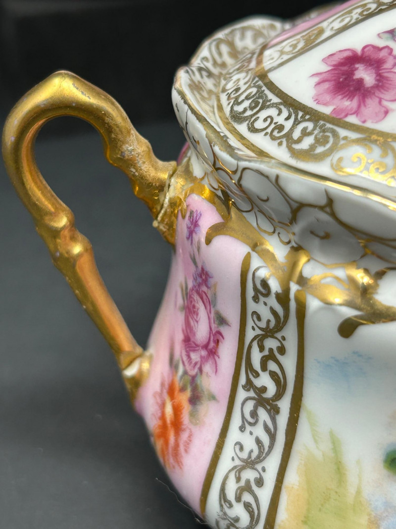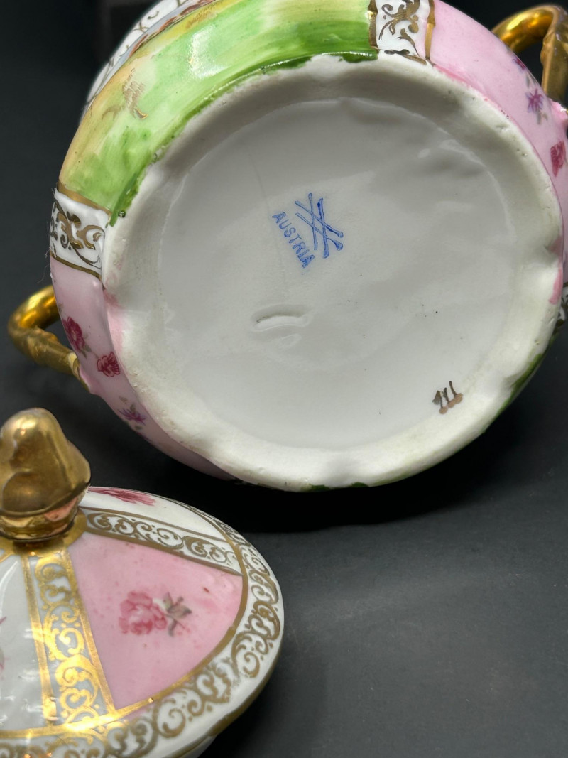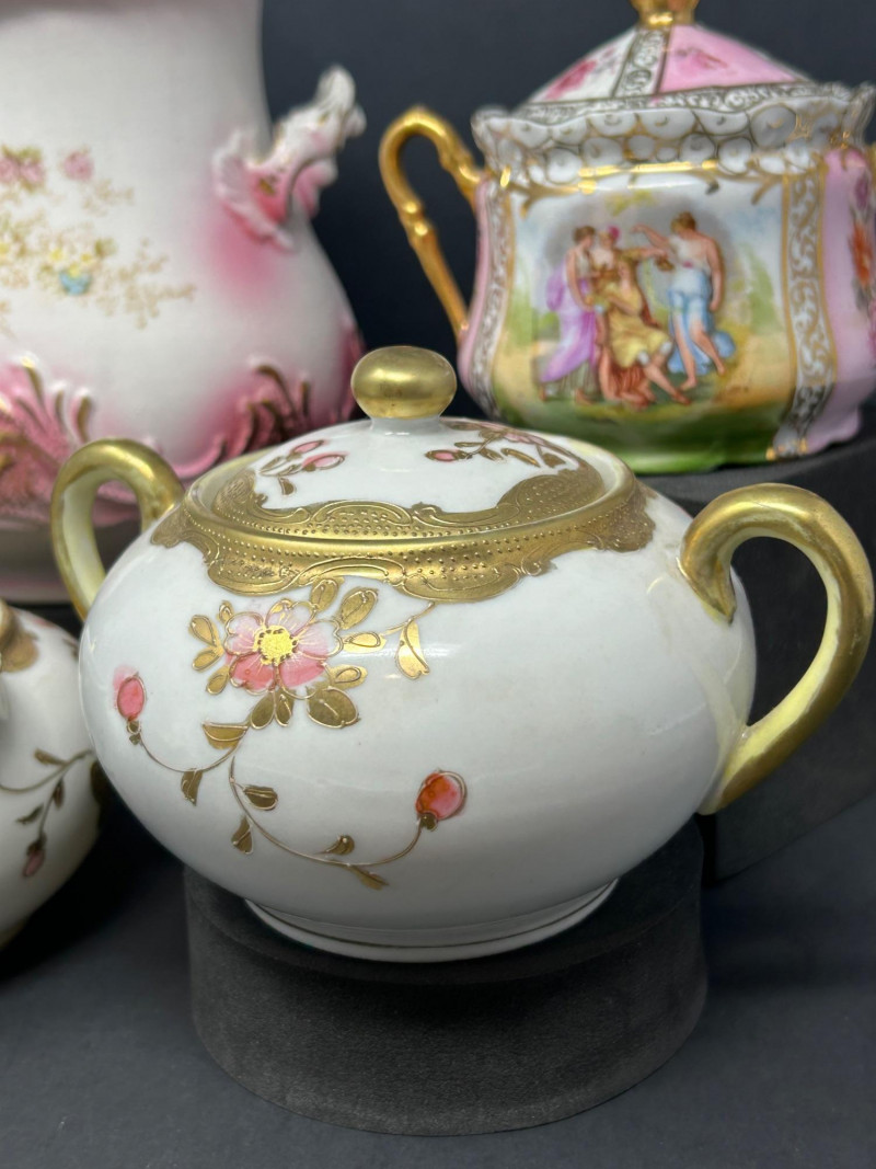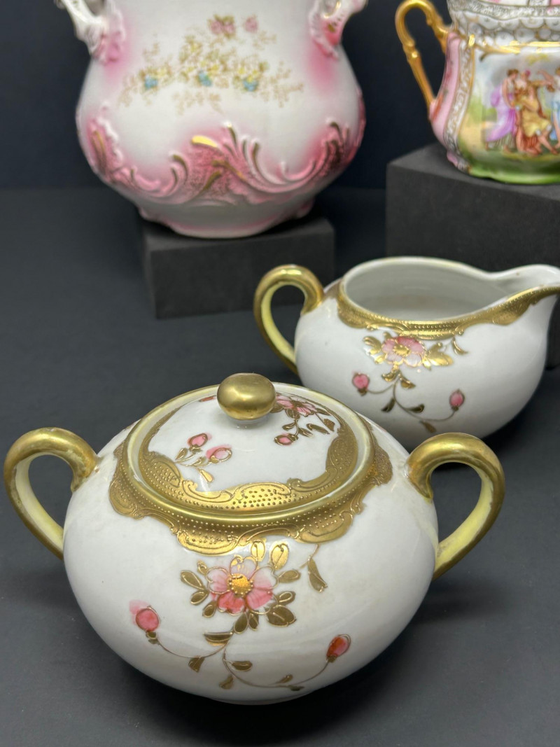A refined group of vintage European and Asian decorative porcelain featuring soft pink shading, hand-painted figural and floral motifs, and extensive gilt ornamentation. The lot includes a tall La Française Porcelaine lidded jar, an Austrian export–marked figural lidded jar, and a matched Japanese sugar and creamer pair. Dating from the late 19th to mid-20th century, these pieces reflect traditional decorative porcelain production with elegant molded forms, enamel decoration, and rich gold detailing. The group is well suited for curio, vanity, or cabinet display, offering both decorative appeal and traditional table or storage use. Date: Late 19th to Early 20th Century (circa) Dimensions: Approx. 8″ H × 6″ W Mark: La Française Porcelaine Color / Finish: White ground with soft pink shading, floral decoration, and gilt scroll accents Design: Tall vase-form lidded jar with applied handles and domed lid Notes: Based on the form, size, lid, and decoration, this piece appears to be a vintage porcelain lidded jar or vase-form vessel, possibly used decoratively or functionally as a cookie jar, serving bowl, or general-purpose covered vessel Date: Early 20th Century (circa) Dimensions: Approx. 6″ H × 6″ W Mark: Blue crossed-lines “Austria” export mark (underglaze) Color / Finish: Pink and white ground with hand-painted classical figural panels, floral accents, and heavy gilt decoration Design: Rounded lidded jar form with double handles and domed lid Date: Mid 20th Century Dimensions: Each approx. 4″ H × 6″ W Mark: Green “Hand Painted – Japan” Mount Fuji mark Color / Finish: White glaze with hand-painted pink florals and gilt detailing Design: Lidded sugar bowl with double handles, accompanied by a matching creamer with pouring lip and gilt-accented handleItem Details: