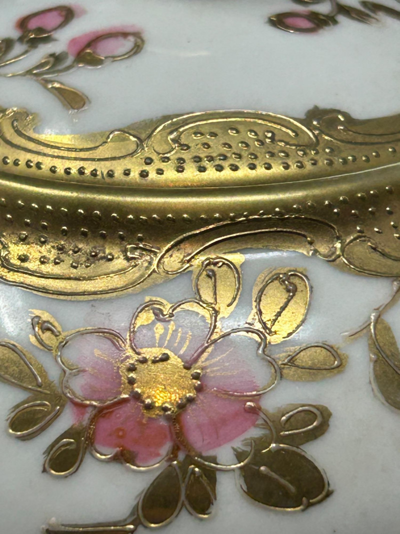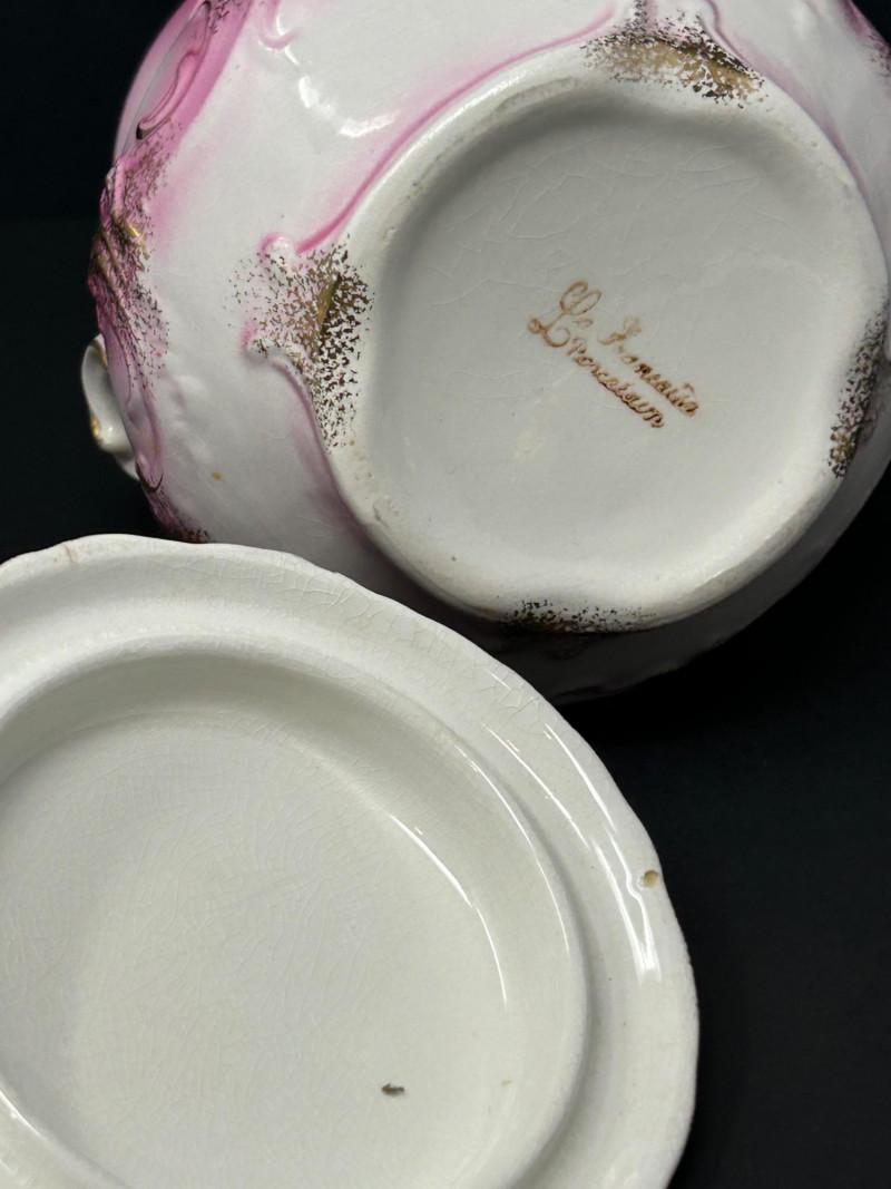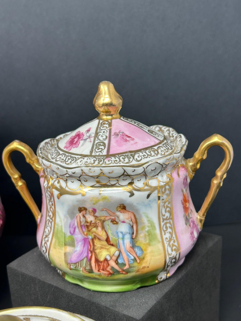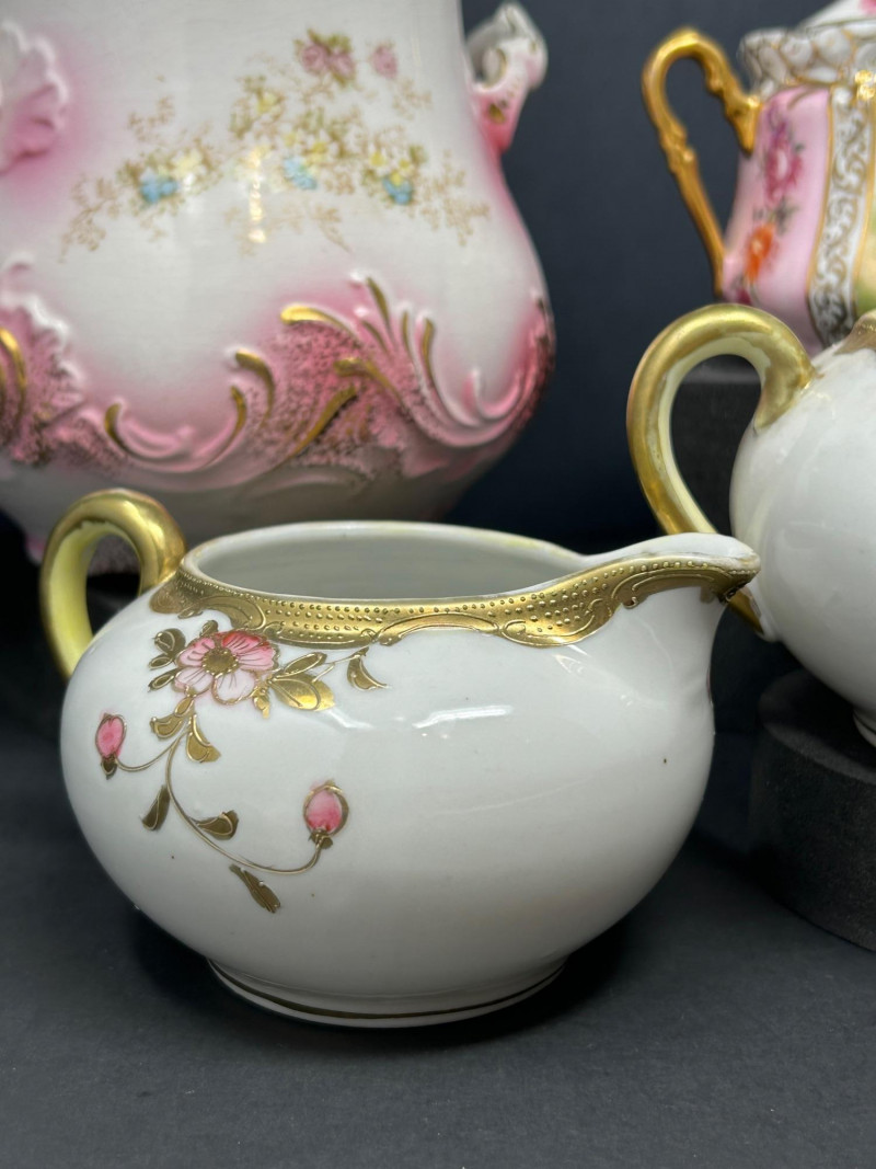 A refined group of vintage European and Asian decorative porcelain featuring soft pink shading, hand-painted figural and floral motifs, and extensive gilt ornamentation. The lot includes a tall La Française Porcelaine lidded jar, an Austrian export–marked figural lidded jar, and a matched Japanese sugar and creamer pair. Dating from the late 19th to mid-20th century, these pieces reflect traditional decorative porcelain production with elegant molded forms, enamel decoration, and rich gold detailing. The group is well suited for curio, vanity, or cabinet display, offering both decorative appeal and traditional table or storage use. Date: Late 19th to Early 20th Century (circa) Dimensions: Approx. 8″ H × 6″ W Mark: La Française Porcelaine Color / Finish: White ground with soft pink shading, floral decoration, and gilt scroll accents Design: Tall vase-form lidded jar with applied handles and domed lid Notes: Based on the form, size, lid, and decoration, this piece appears to be a vintage porcelain lidded jar or vase-form vessel, possibly used decoratively or functionally as a cookie jar, serving bowl, or general-purpose covered vessel Date: Early 20th Century (circa) Dimensions: Approx. 6″ H × 6″ W Mark: Blue crossed-lines “Austria” export mark (underglaze) Color / Finish: Pink and white ground with hand-painted classical figural panels, floral accents, and heavy gilt decoration Design: Rounded lidded jar form with double handles and domed lid Date: Mid 20th Century Dimensions: Each approx. 4″ H × 6″ W Mark: Green “Hand Painted – Japan” Mount Fuji mark Color / Finish: White glaze with hand-painted pink florals and gilt detailing Design: Lidded sugar bowl with double handles, accompanied by a matching creamer with pouring lip and gilt-accented handleItem Details: