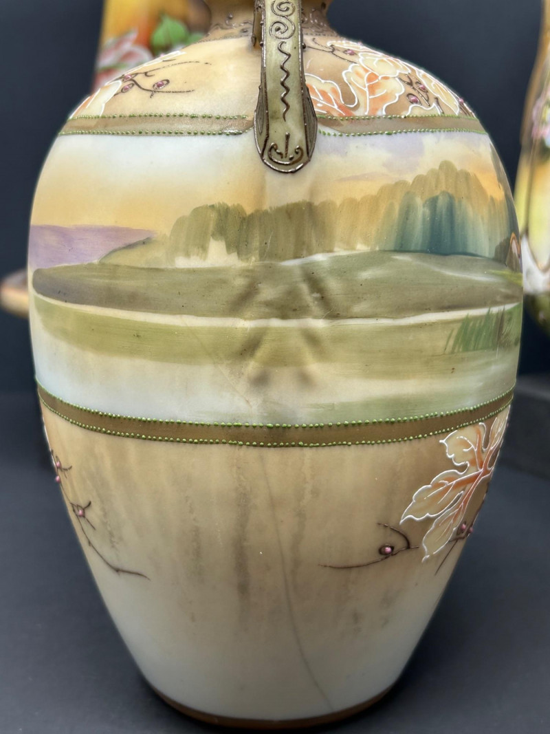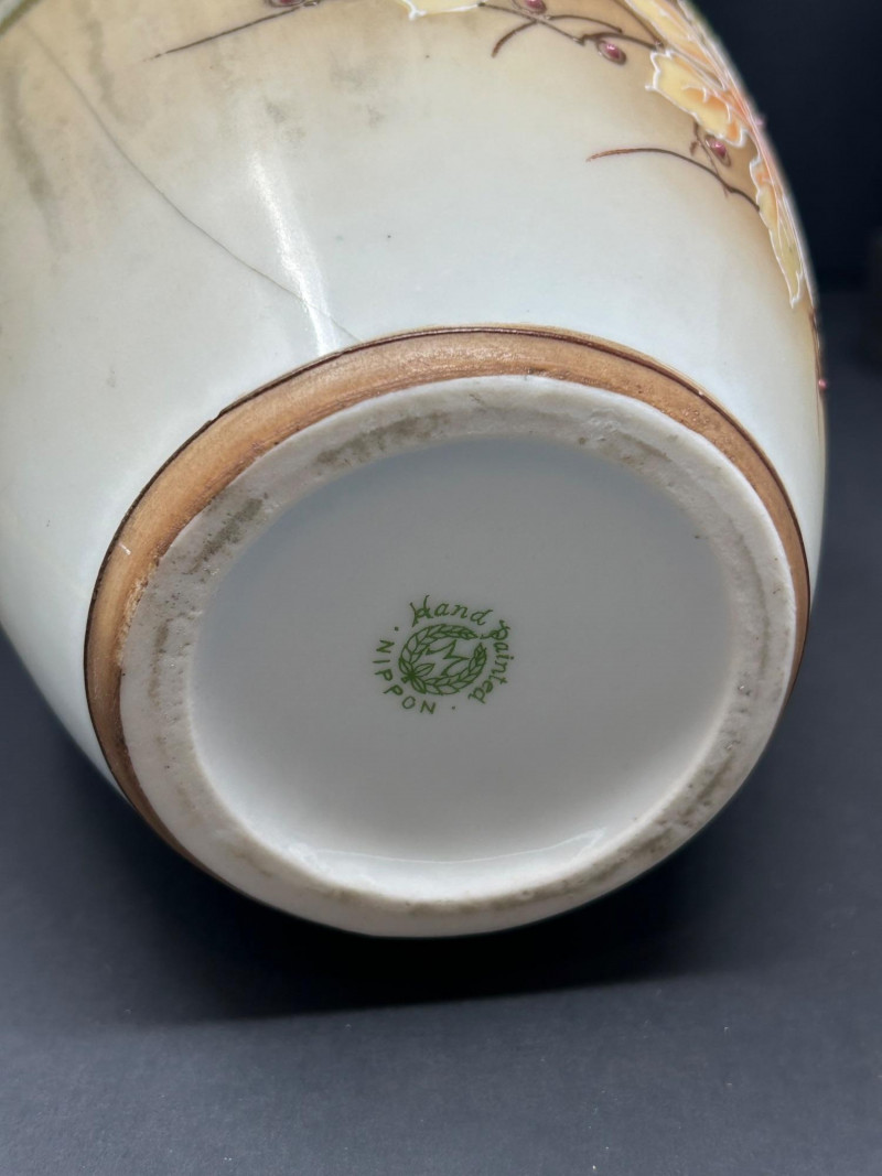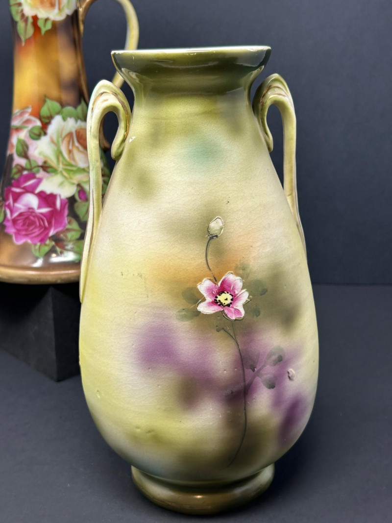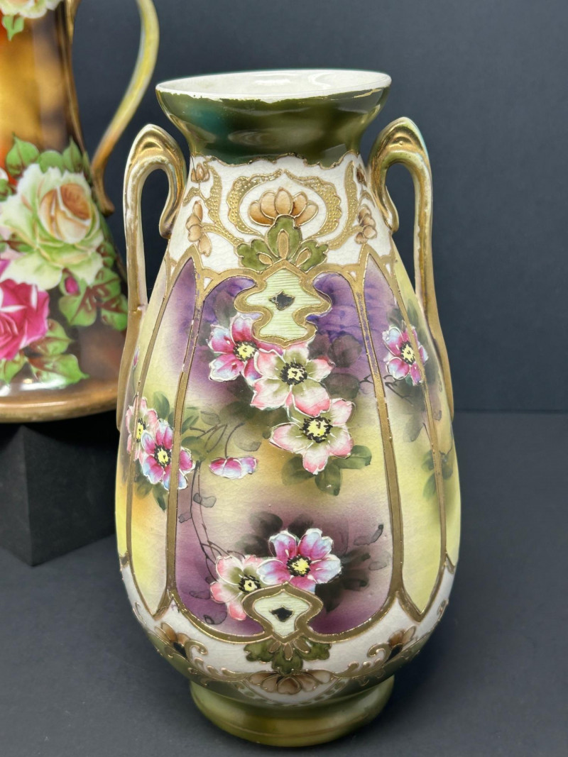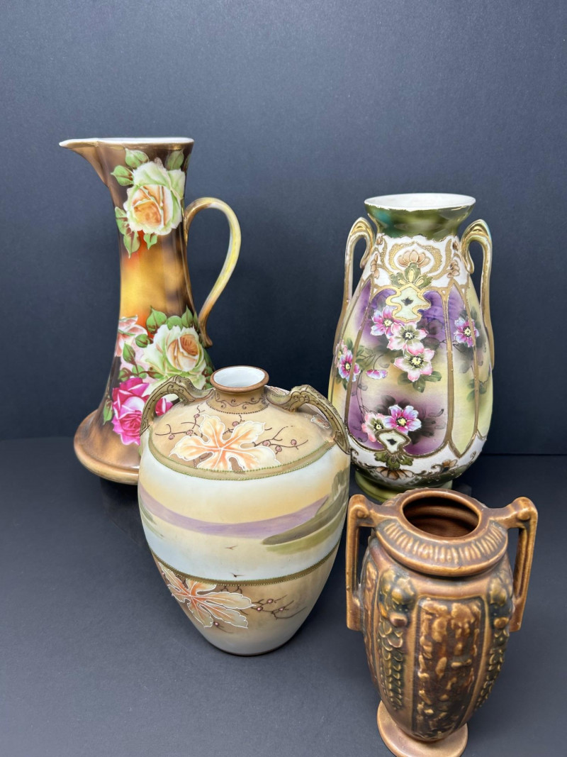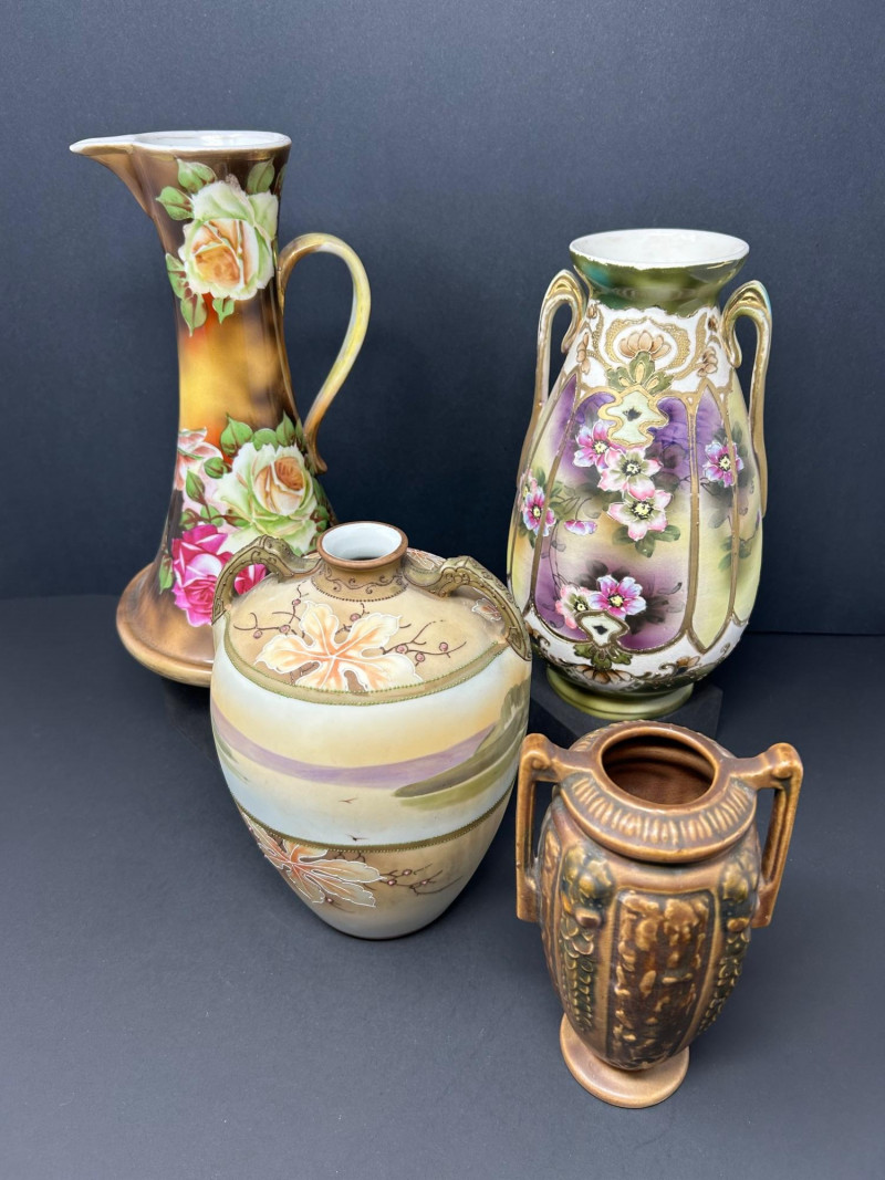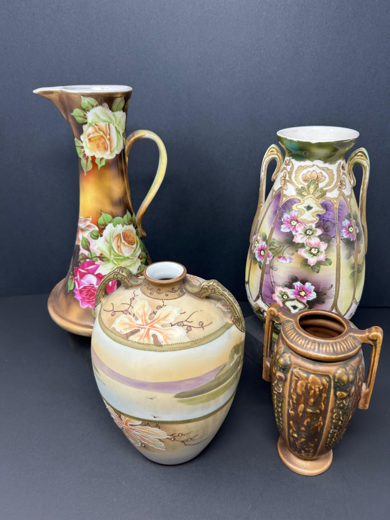 A refined group of four vintage decorative ceramics showcasing early 20th-century craftsmanship. This lot includes two confirmed Nippon porcelain pieces, an authentic Roseville Florentine art pottery vase, and a finely hand-painted unmarked floral porcelain vase. Rich glazes, floral motifs, and classic forms make this an appealing group for collectors, decorators, or resale. Height: 10 inches Width: 6 inches at base Tall flared pitcher form with applied handle Warm brown-to-gold ground with large hand-painted roses in pink, cream, and green Marked “Hand Painted Nippon” on base Era: Pre-1921 Japanese export period Material: Porcelain Height: 8 inches Narrow neck with small opening Soft pastel pink, peach, lavender, and green tones Hand-painted floral and landscape-style decoration Marked “Hand Painted Nippon” on base Era: Pre-1921 Japanese export period Material: Porcelain Height: Approx. 8 inches Double-handled baluster form Molded floral and foliage relief Brown Arts & Crafts glaze with tonal variation Stamped “R” on base Pattern: Florentine Model: 231 Manufacturer: Roseville Pottery Era: Circa 1910s–1920s Material: Art pottery Height: 10 inches Width: Approx. 6 inches Elegant double-handled form Purple, green, and cream shaded ground Hand-painted floral panels with raised gilt outlining Unmarked Style: Art Nouveau / early 20th-century decorative porcelain Material: PorcelainLot Includes: