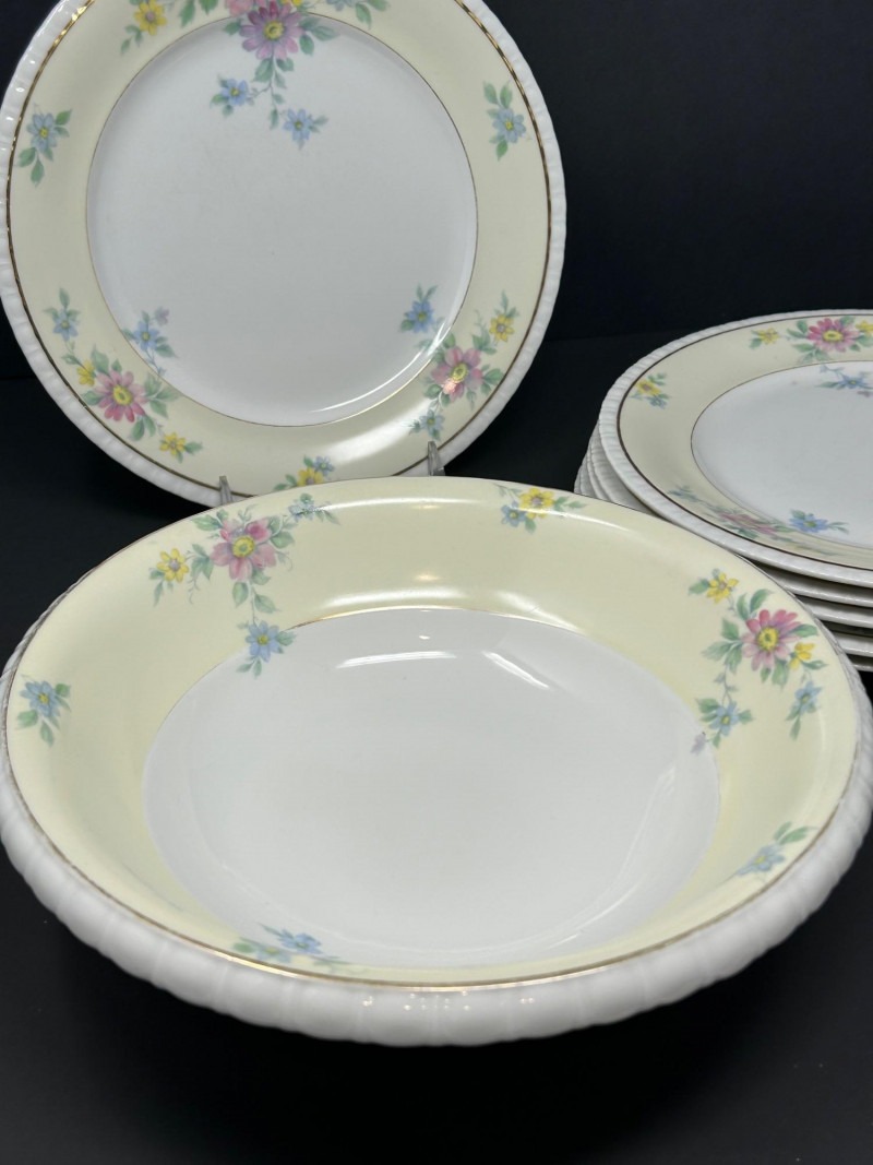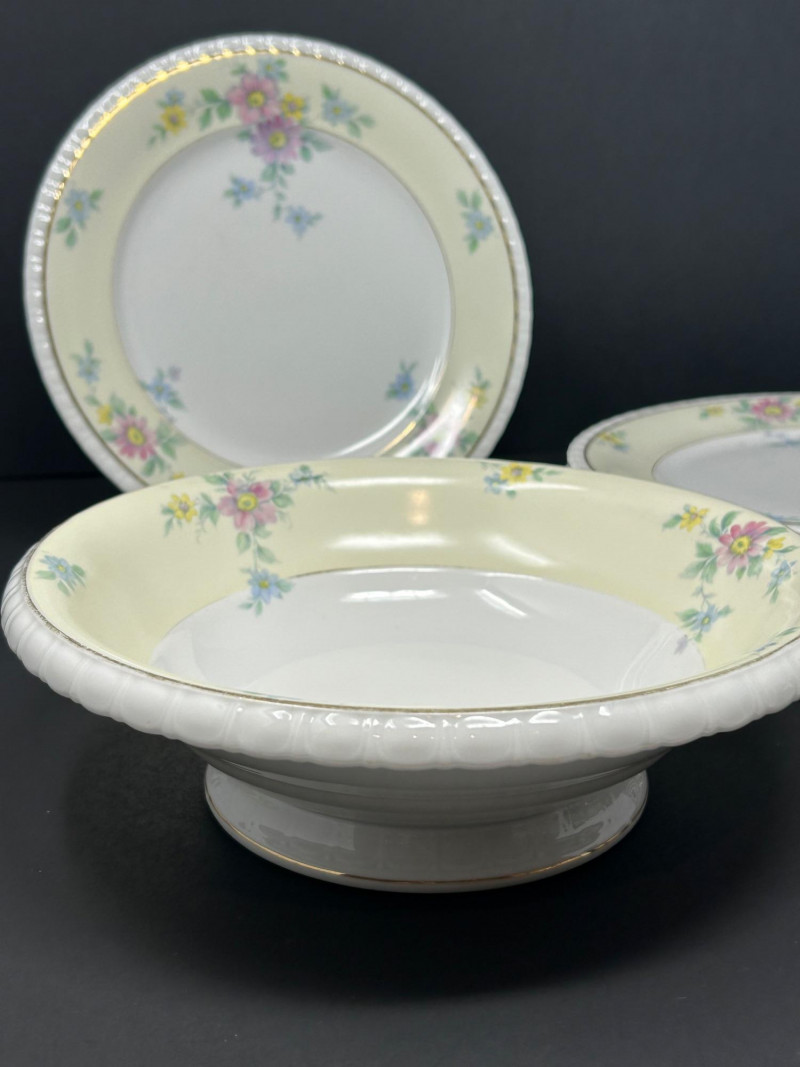 Elegant vintage porcelain dinnerware by Thun, crafted in Bohemia. This coordinated set features soft pastel floral sprays on a creamy ivory ground, finished with delicate gold accents and a gently scalloped rim. Classic European styling makes it ideal for refined dining, display, or collection. The underside mark reads “TK Thun Bohemia”, confirming origin and maker. Pieces present beautifully with light, age-appropriate wear consistent with vintage porcelain. Set Includes: Dinner Plates – 9″ diameter Smaller Plates – 6″ diameter Gravy Boat – 3″ tall × 6″ long Matching bowls and service pieces as shown Details: Maker: Thun Origin: Bohemia Material: Porcelain Decoration: Pastel florals with gold trim Mark: TK Thun Bohemia (green stamp)