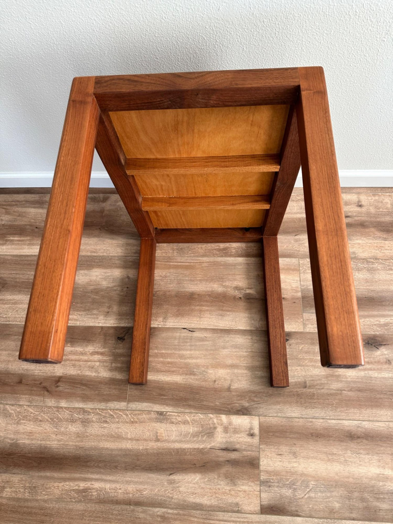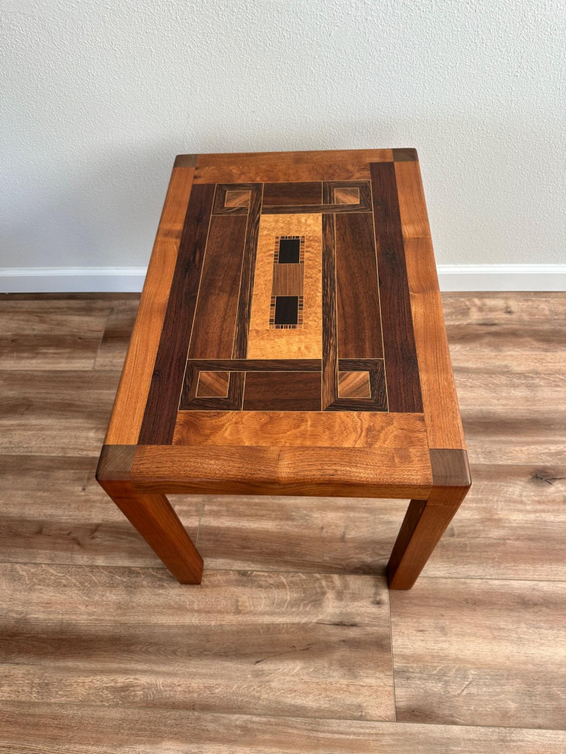 Striking handcrafted wood table featuring a meticulously executed geometric marquetry inlay across the top surface. The design showcases a symmetrical layout of light, medium, and dark wood tones, anchored by two central dark rectangular panels surrounded by intricate borders and corner detailing. The top surface shows natural wood grain variation and depth, consistent with solid wood construction. The inlay work appears to be true marquetry — individual wood segments fitted together — rather than printed or veneered. The edges and base show no signs of veneer seams or substrate exposure, further supporting solid wood craftsmanship.Material Confirmation