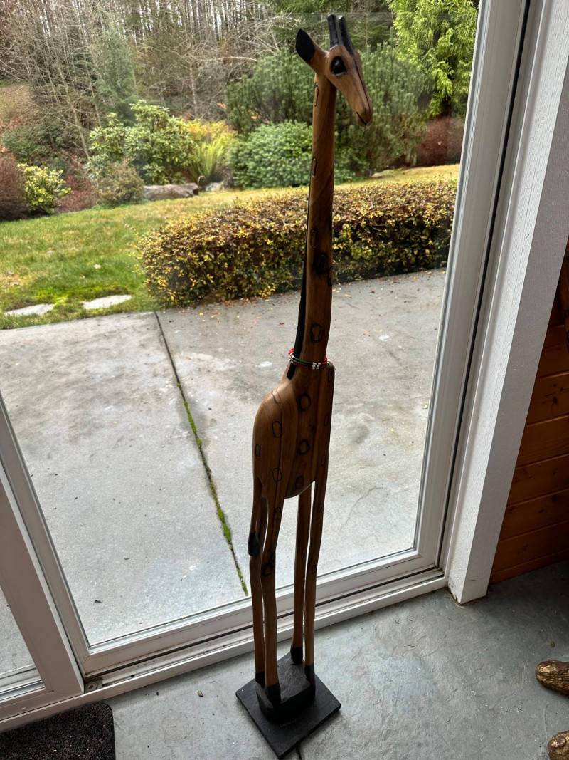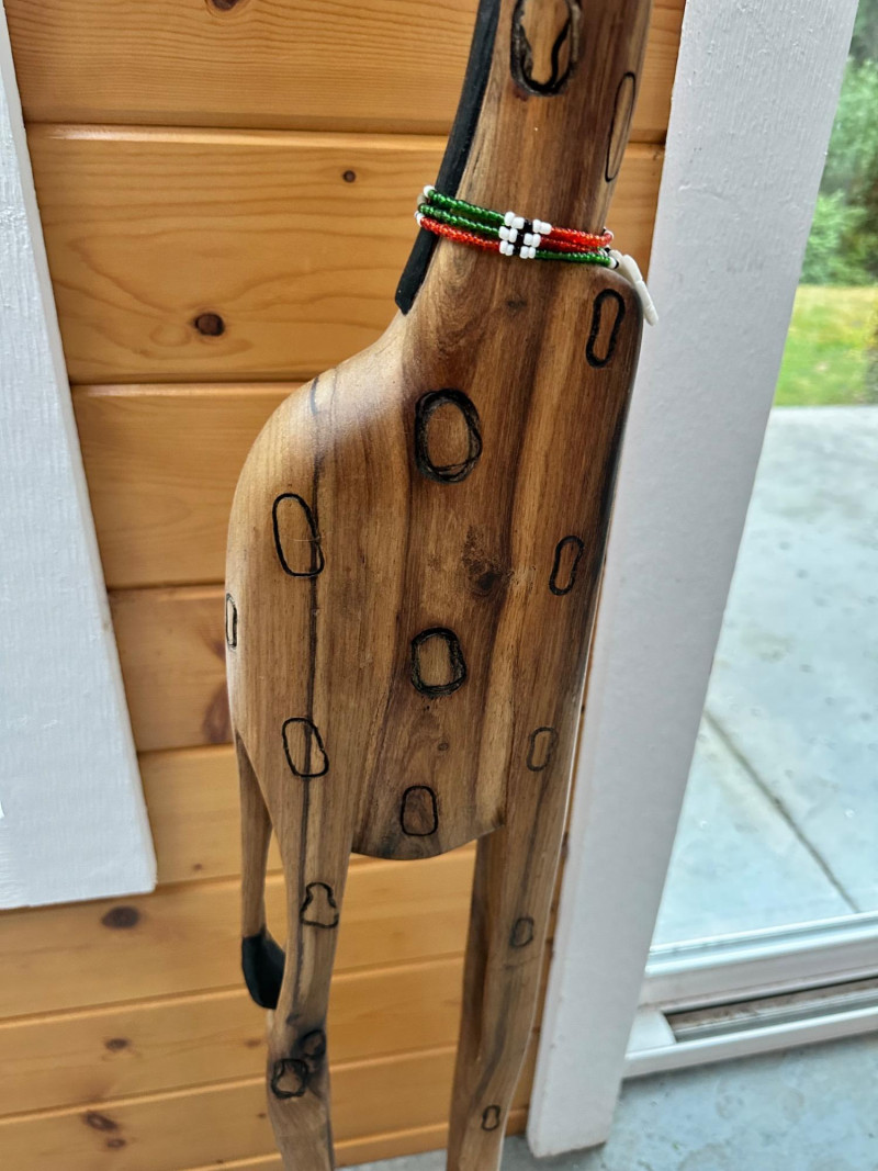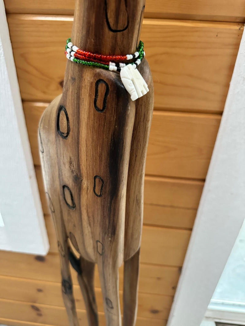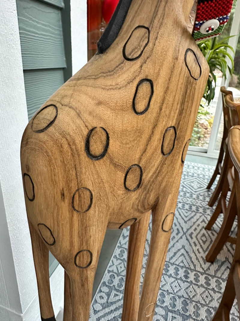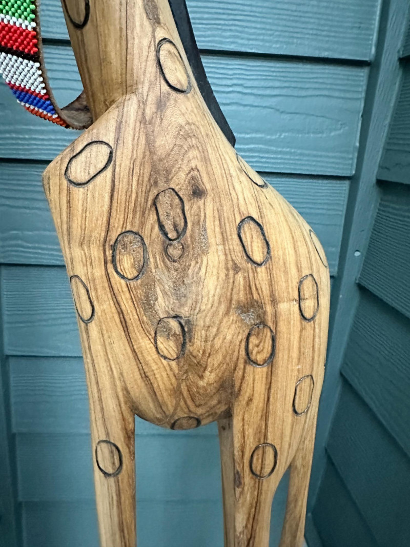 Attractive set of two (2) hand-carved wooden giraffe floor sculptures featuring elongated proportions and African-inspired folk-art styling. Each giraffe is carved from solid wood and decorated with burned/etched spot motifs, darkened hooves, and expressive carved facial features. Colorful beaded necklaces add handcrafted character and visual interest. These are floor-standing decorative sculptures, noticeably larger than common tabletop giraffes. Displayed together, the differing heights create visual balance and sculptural appeal, making them ideal for entryways, living rooms, sunrooms, or covered patios. Item Type: Decorative floor sculptures Quantity: Two (2) giraffe sculptures Material: Solid hand-carved wood Style: African-inspired / folk art Design Features: Etched/burned spot pattern, carved facial details, darkened hooves Accessories: Beaded necklaces (as shown) Base: Individual square wooden bases for stability Giraffe #1: approx. 54 inches tall Giraffe #2: approx. 47 inches tallDetails: