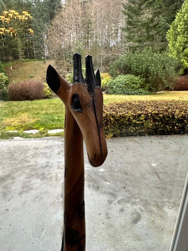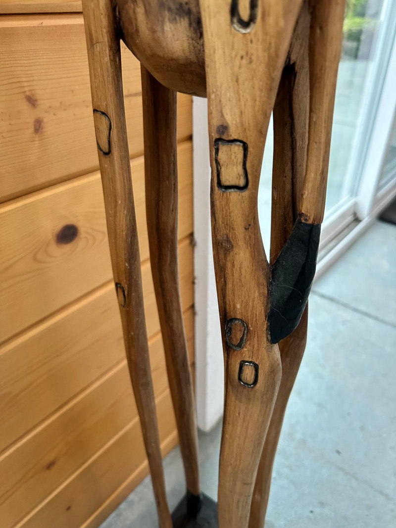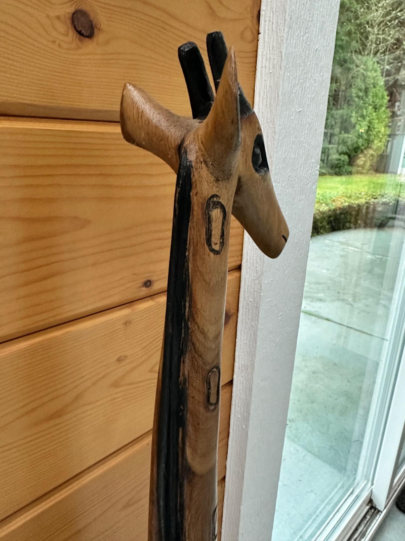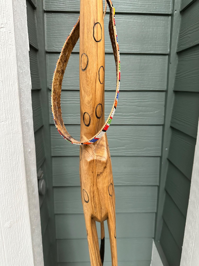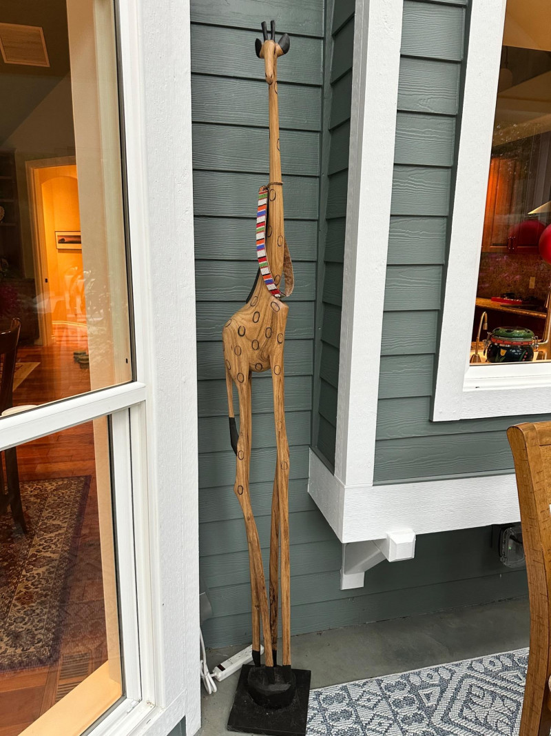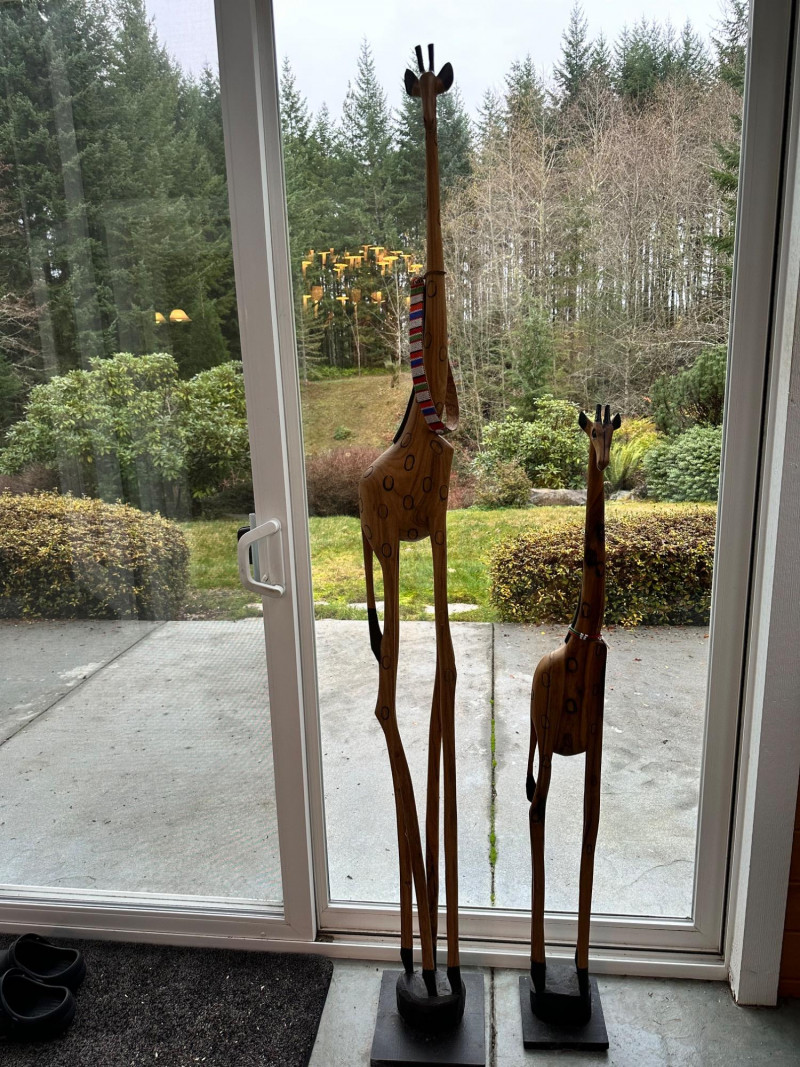 Attractive set of two (2) hand-carved wooden giraffe floor sculptures featuring elongated proportions and African-inspired folk-art styling. Each giraffe is carved from solid wood and decorated with burned/etched spot motifs, darkened hooves, and expressive carved facial features. Colorful beaded necklaces add handcrafted character and visual interest. These are floor-standing decorative sculptures, noticeably larger than common tabletop giraffes. Displayed together, the differing heights create visual balance and sculptural appeal, making them ideal for entryways, living rooms, sunrooms, or covered patios. Item Type: Decorative floor sculptures Quantity: Two (2) giraffe sculptures Material: Solid hand-carved wood Style: African-inspired / folk art Design Features: Etched/burned spot pattern, carved facial details, darkened hooves Accessories: Beaded necklaces (as shown) Base: Individual square wooden bases for stability Giraffe #1: approx. 54 inches tall Giraffe #2: approx. 47 inches tallDetails: