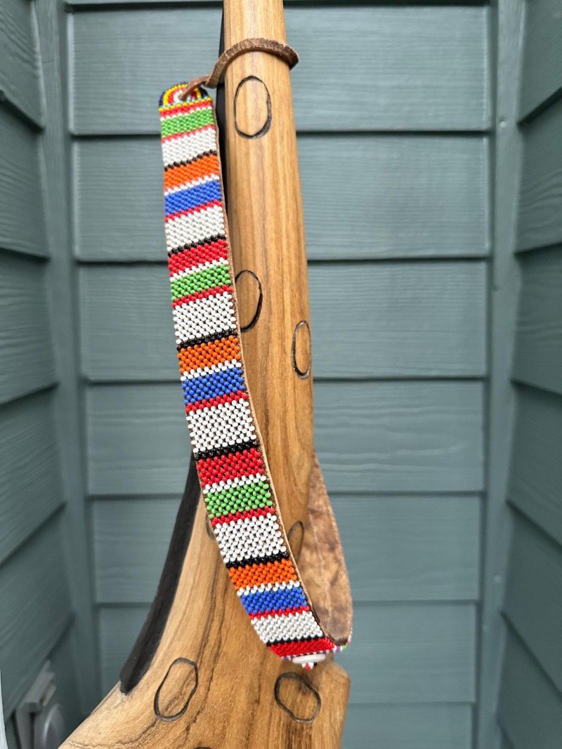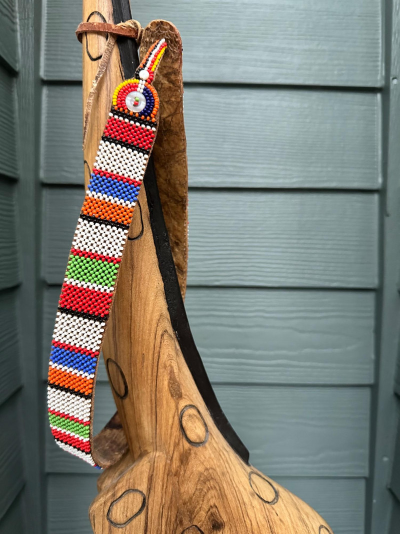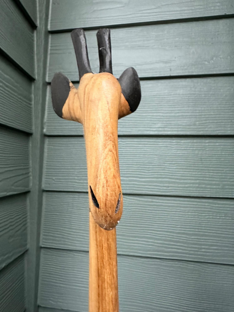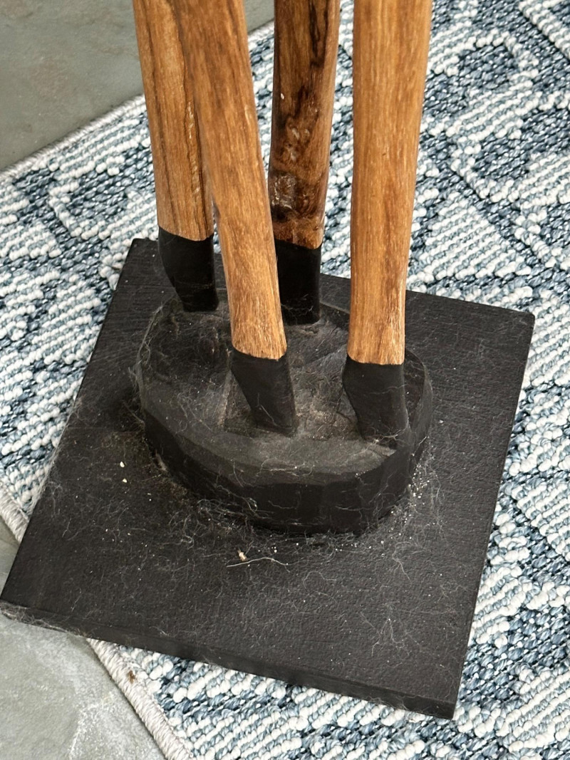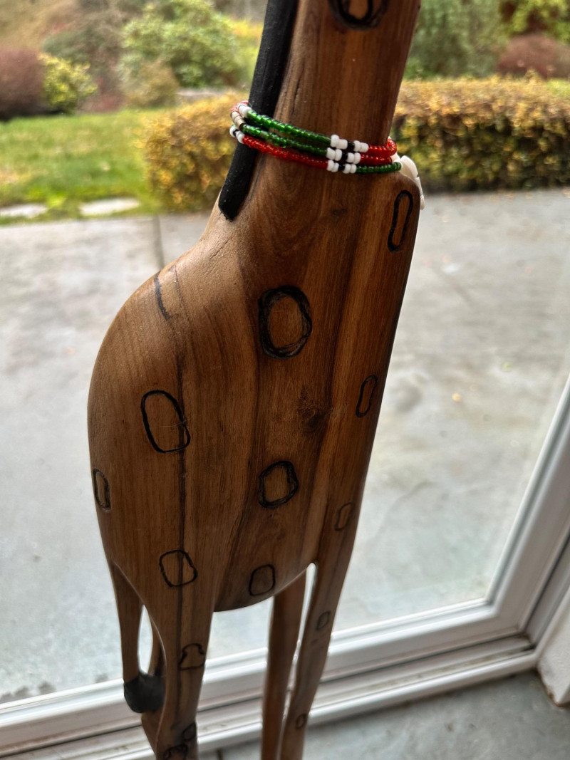 Attractive set of two (2) hand-carved wooden giraffe floor sculptures featuring elongated proportions and African-inspired folk-art styling. Each giraffe is carved from solid wood and decorated with burned/etched spot motifs, darkened hooves, and expressive carved facial features. Colorful beaded necklaces add handcrafted character and visual interest. These are floor-standing decorative sculptures, noticeably larger than common tabletop giraffes. Displayed together, the differing heights create visual balance and sculptural appeal, making them ideal for entryways, living rooms, sunrooms, or covered patios. Item Type: Decorative floor sculptures Quantity: Two (2) giraffe sculptures Material: Solid hand-carved wood Style: African-inspired / folk art Design Features: Etched/burned spot pattern, carved facial details, darkened hooves Accessories: Beaded necklaces (as shown) Base: Individual square wooden bases for stability Giraffe #1: approx. 54 inches tall Giraffe #2: approx. 47 inches tallDetails: