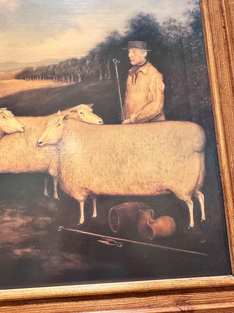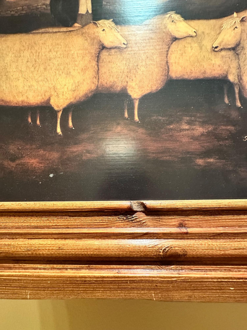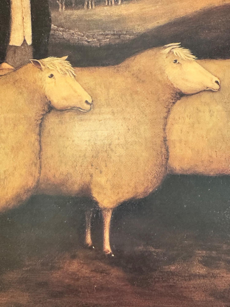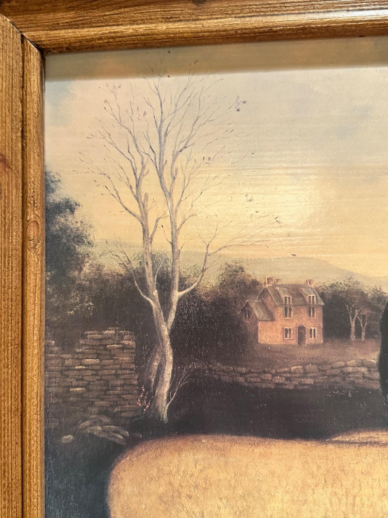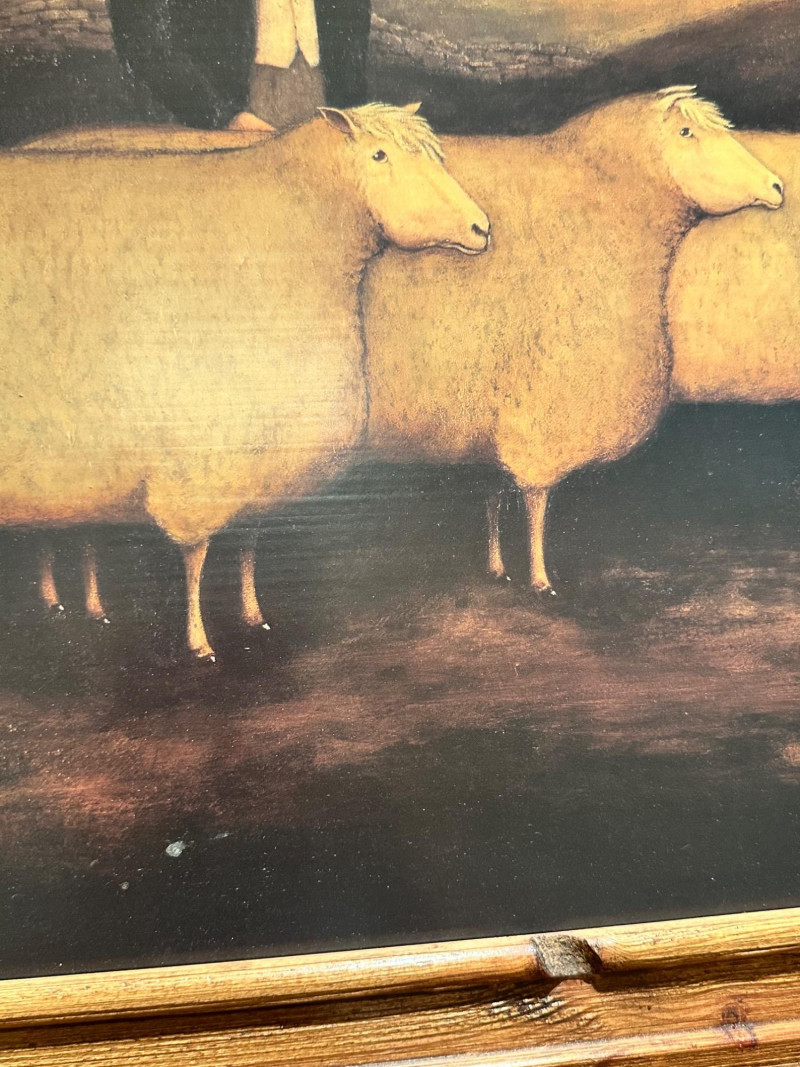 Vintage folk art–style decorative artwork depicting a traditional sheep sale / livestock market scene. The composition features four sheep in the foreground with two figures in period clothing, set against a peaceful rural landscape with rolling hills, trees, and a farmhouse in the distance. Artist: Unknown Type: Framed wall art / decorative print Style: Folk Art / Primitive / Country Subject: Sheep sale / rural farm scene Medium: Print on board or canvas (exact medium unknown) Frame: Solid wood, rustic finish Orientation: Horizontal Hanging: Wired and ready to hang Width: Approx. 31 inches Height: Approx. 23.5 inchesItem Details: